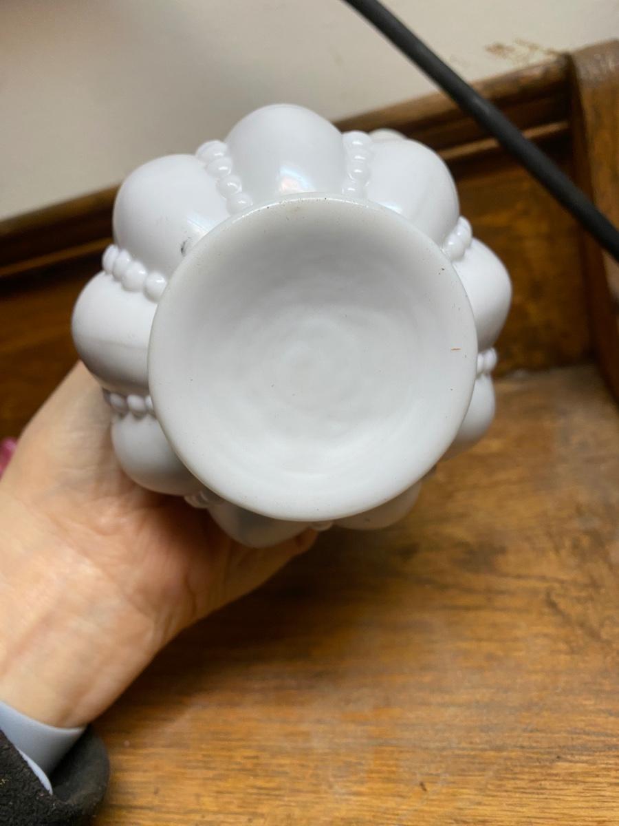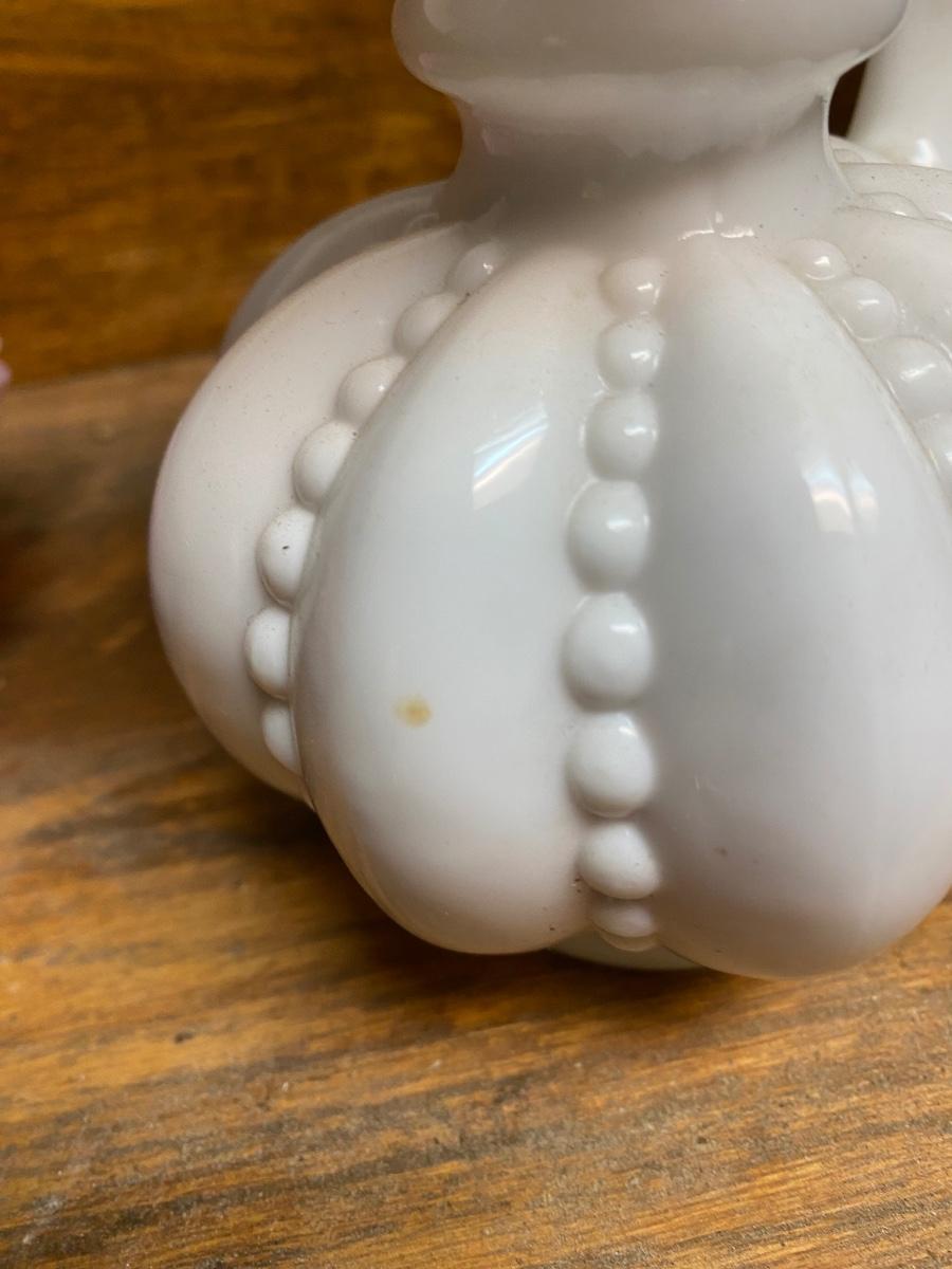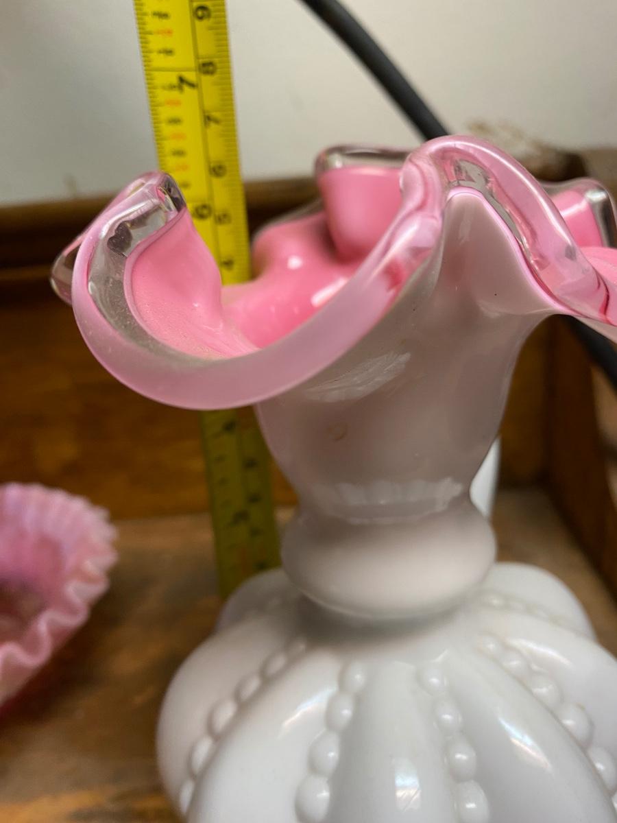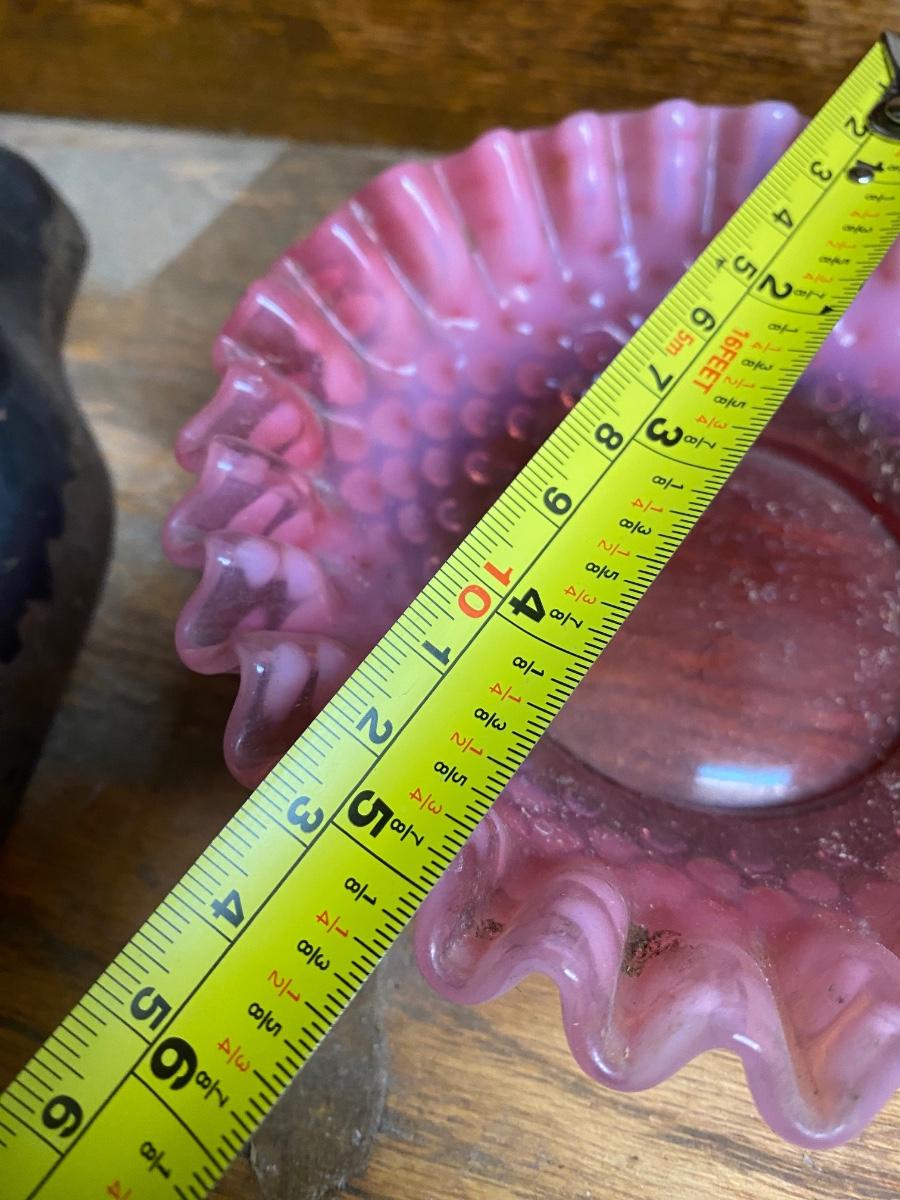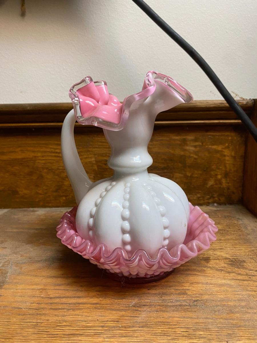 Fenton cranberry hobnail 5" dish and Fenton 6.5" Pink and White Cased Peach Crest Pitcher/Vase. Great condition.