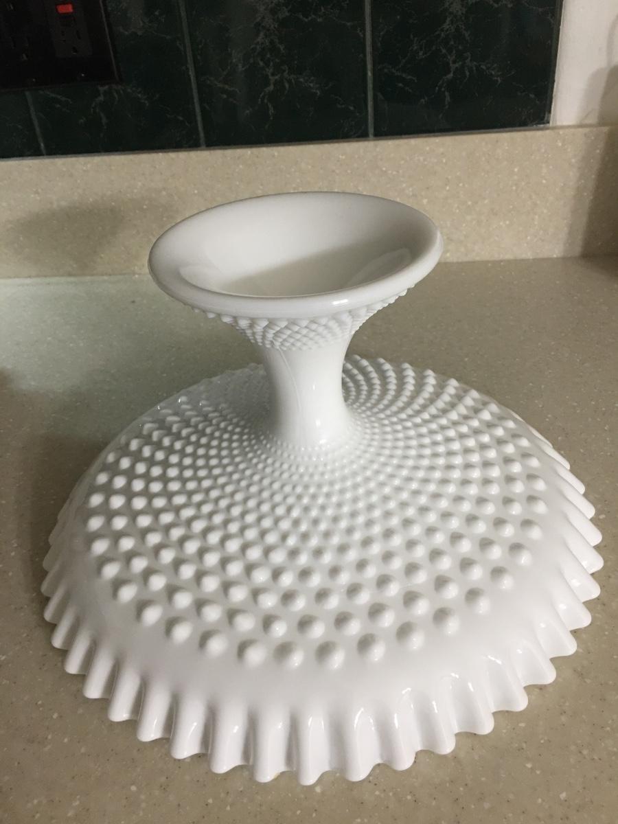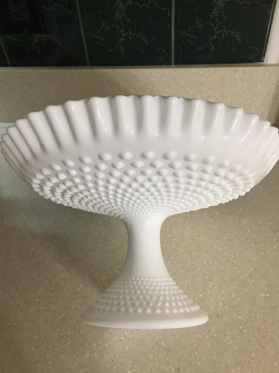 A Beautiful very large ruffled edge Fenton hobnail milk glass pedestal cake/pie stand. 6 1/2” tall and 12” in diameter in good condition with no chips, cracks or repairs of any kind. A great stand for a fancy occasion.