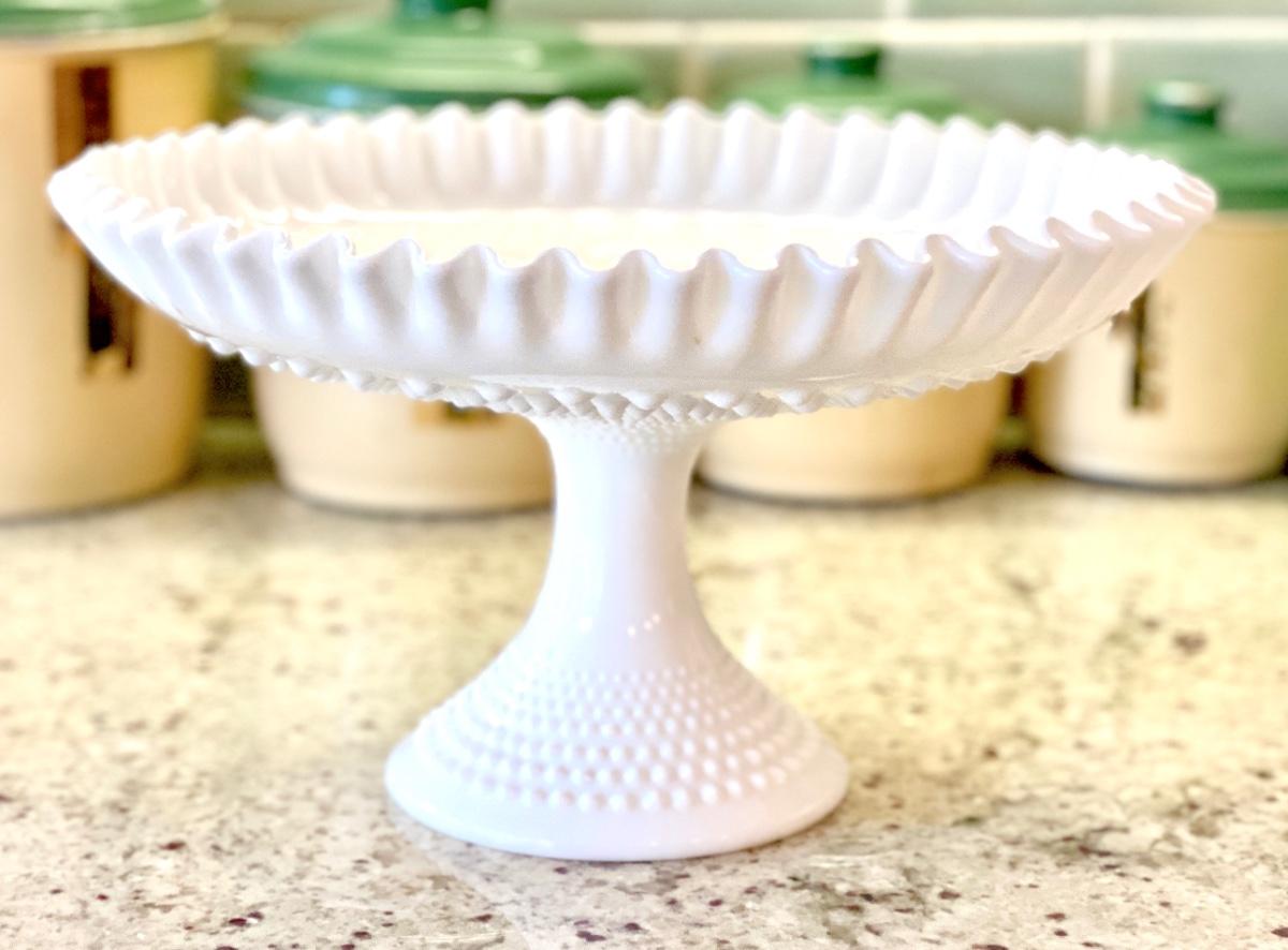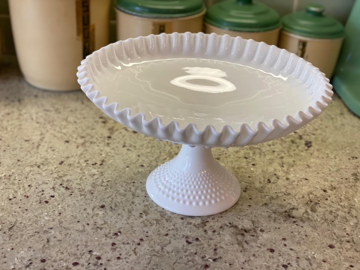Vintage Fenton ruffled edge hobnail milk glass pedestal cake/pie stand