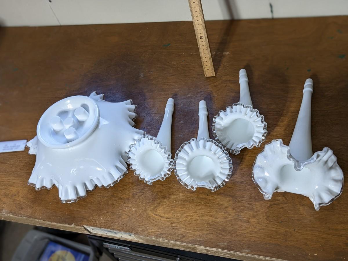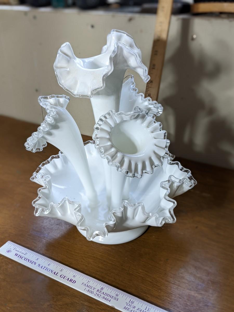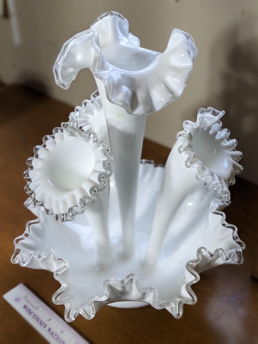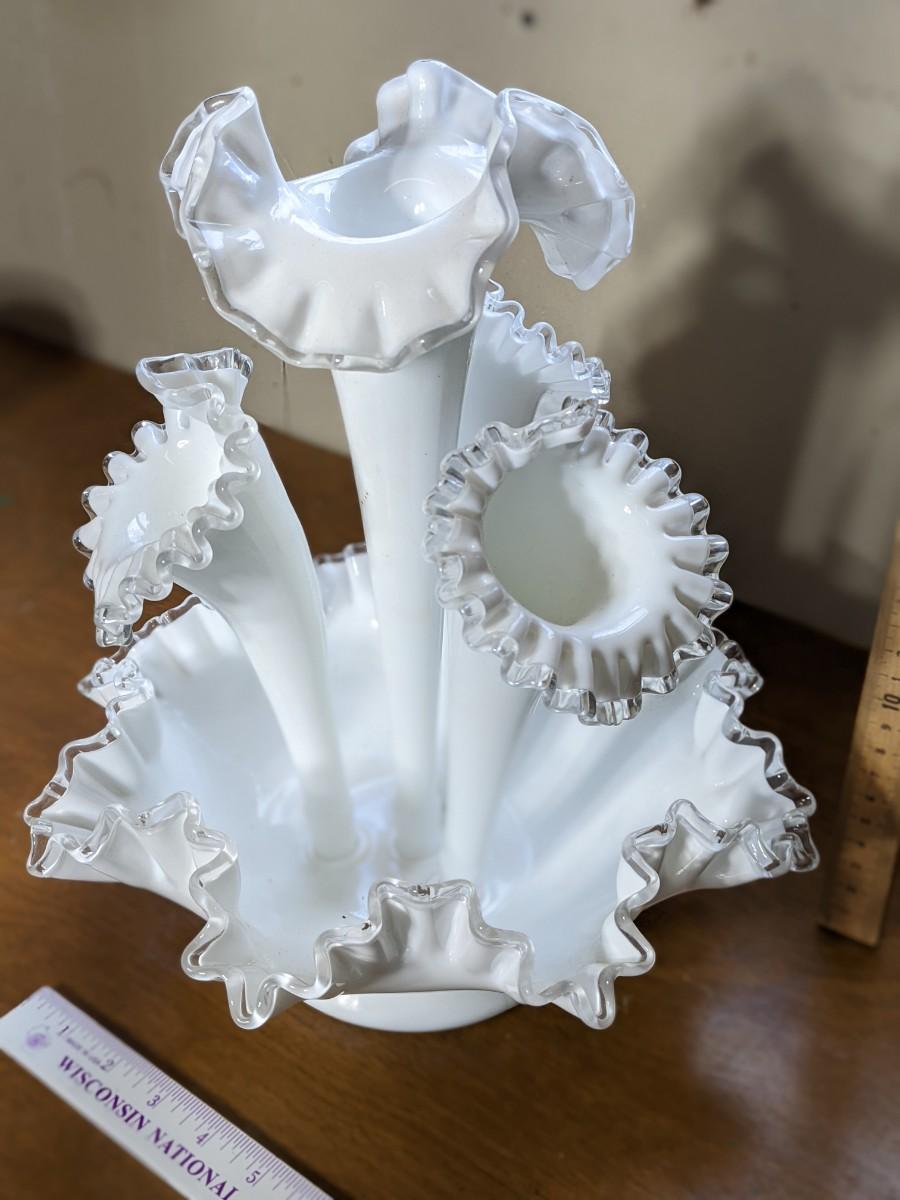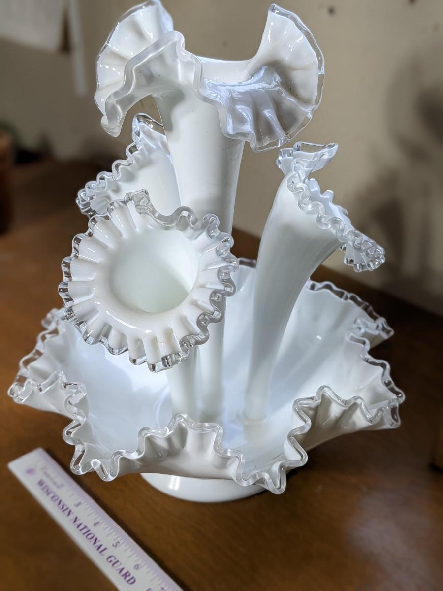 Vintage Fenton Silver Crest White Milk Glass 4 Horn Epergne Ruffled, No Chips or Cracks!
