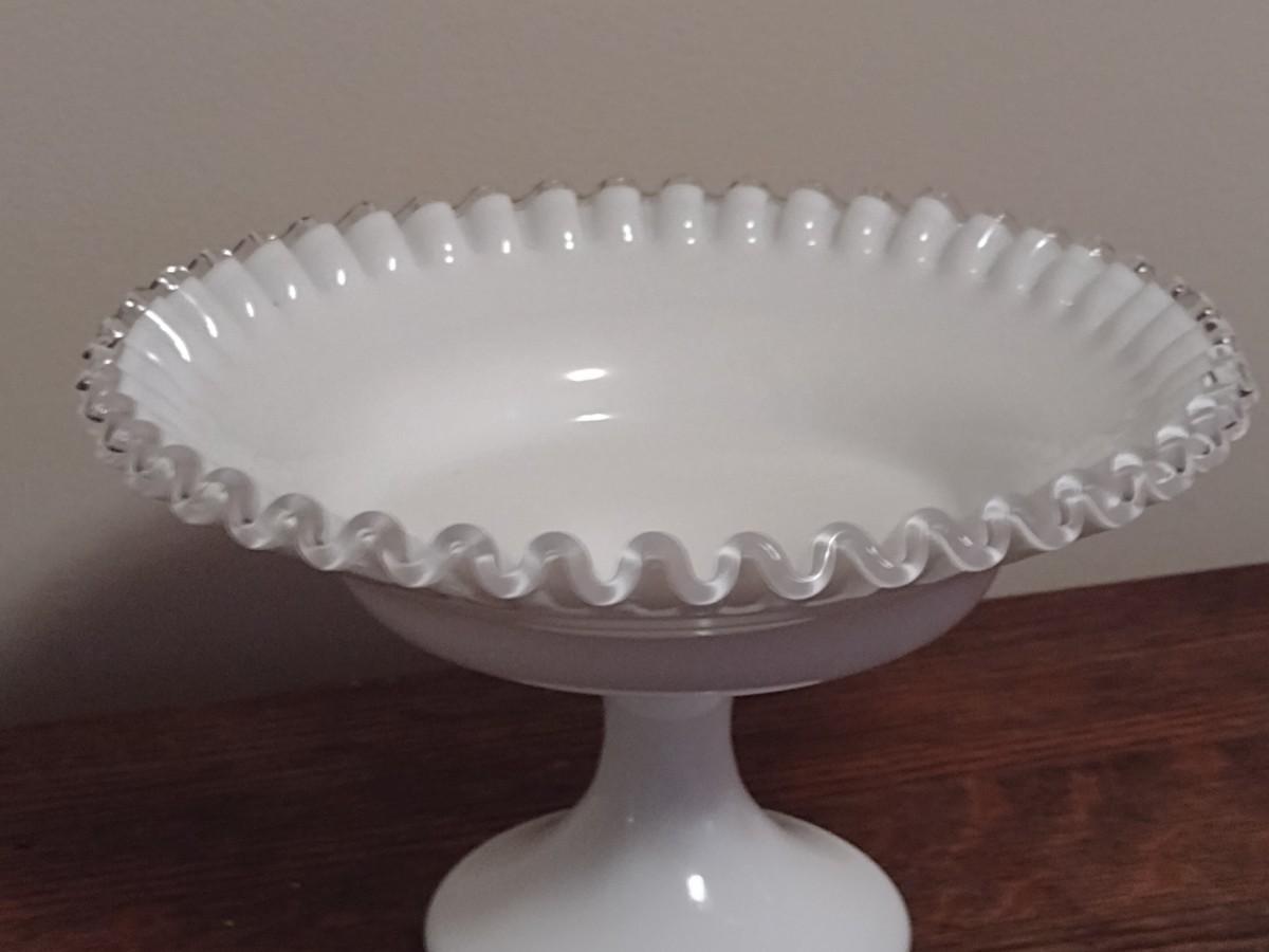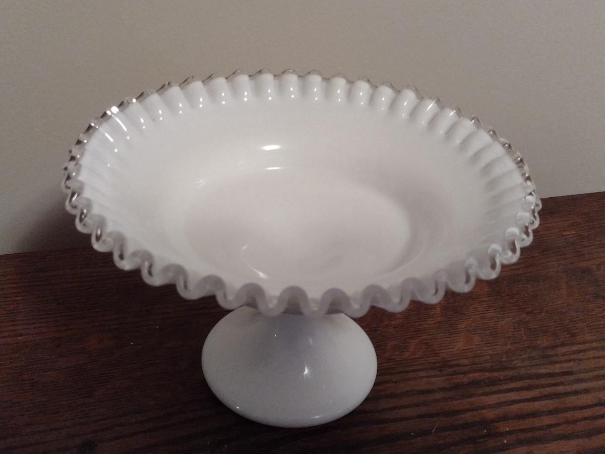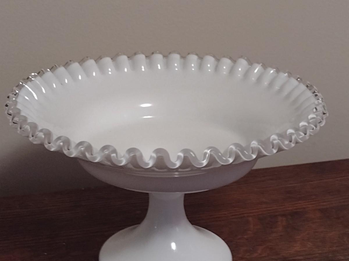 Vintage Fenton Style Silver Crest White Ruffled Edge Pedestal Bowl
