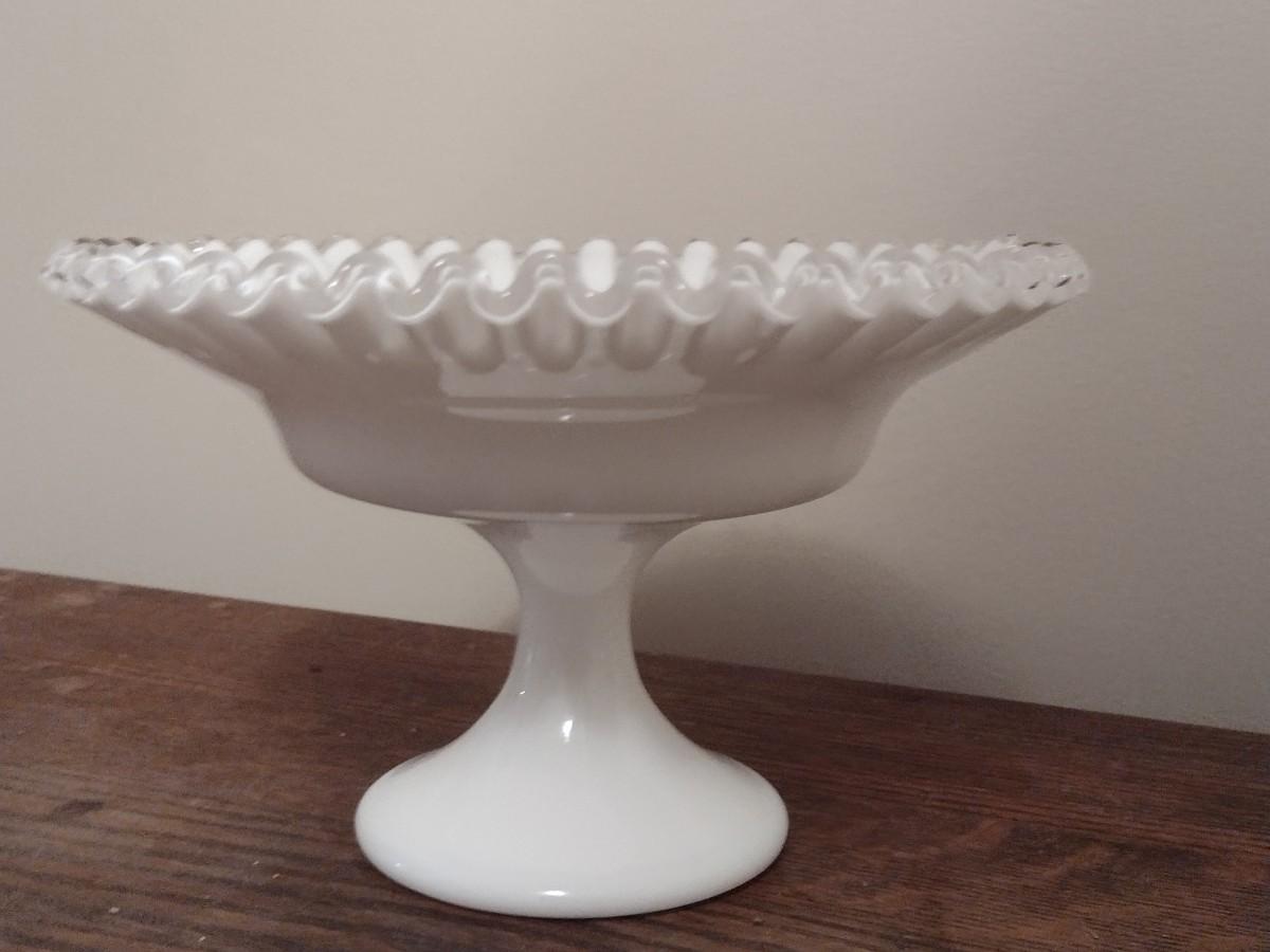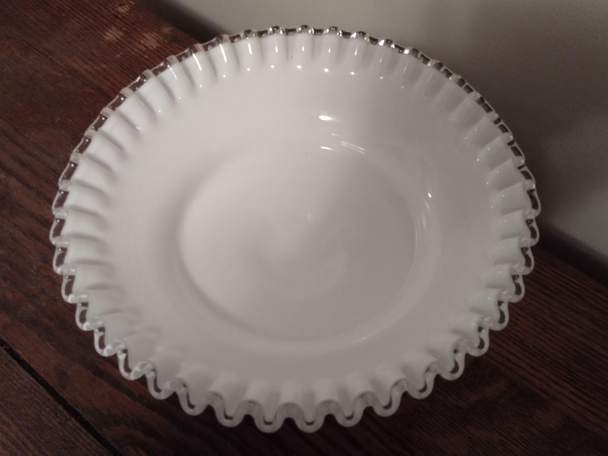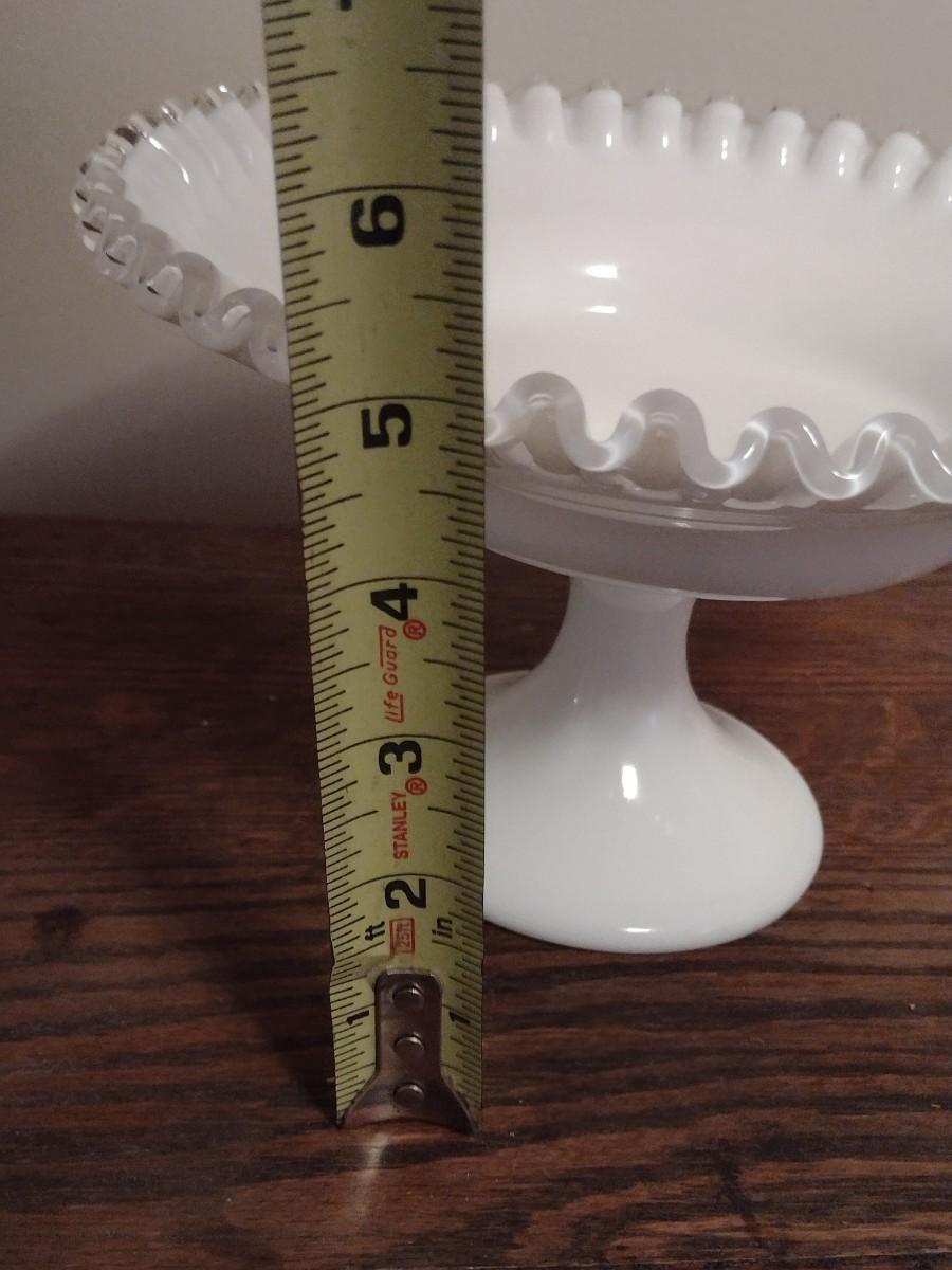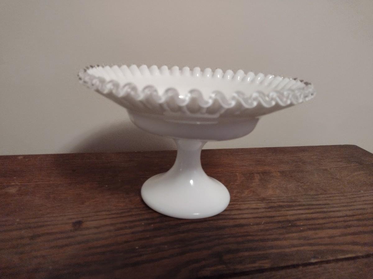 Vintage Fenton Style Silver Crest White Ruffled Edge Pedestal Bowl
