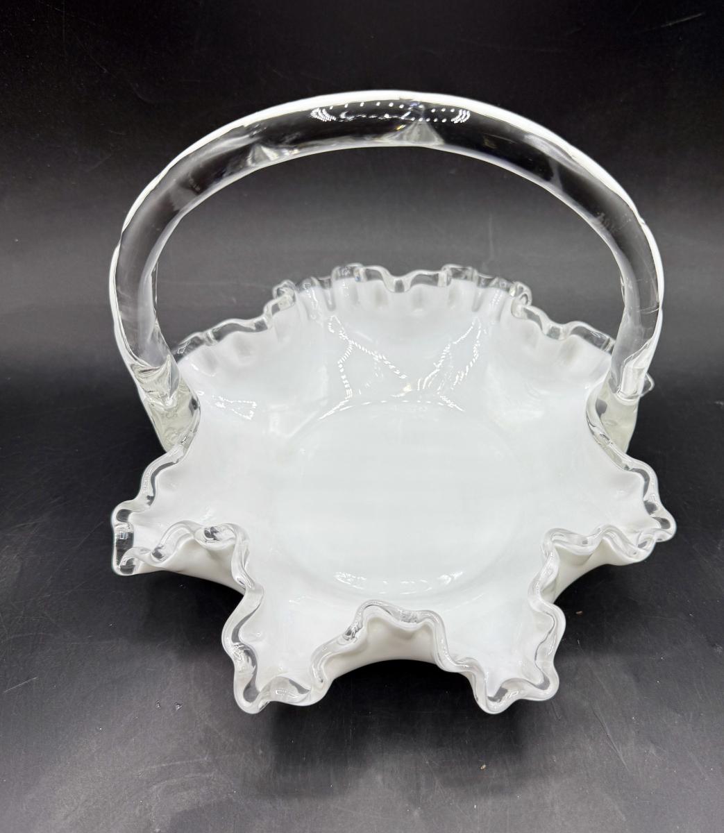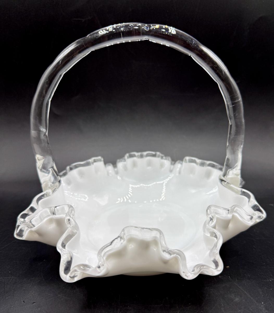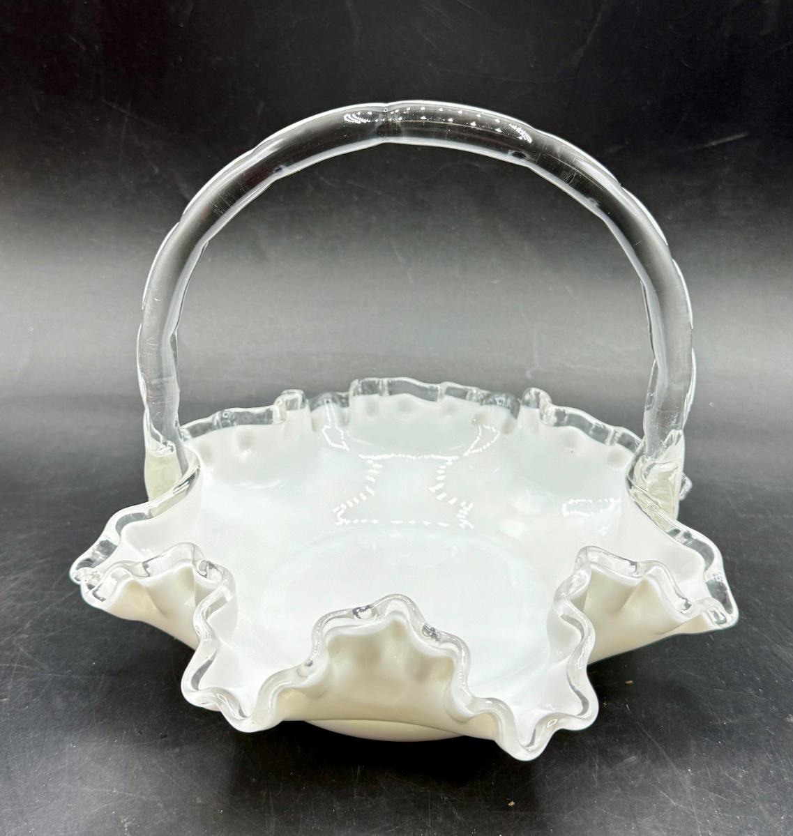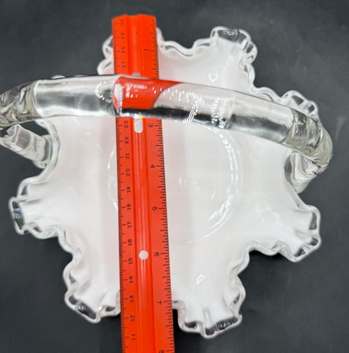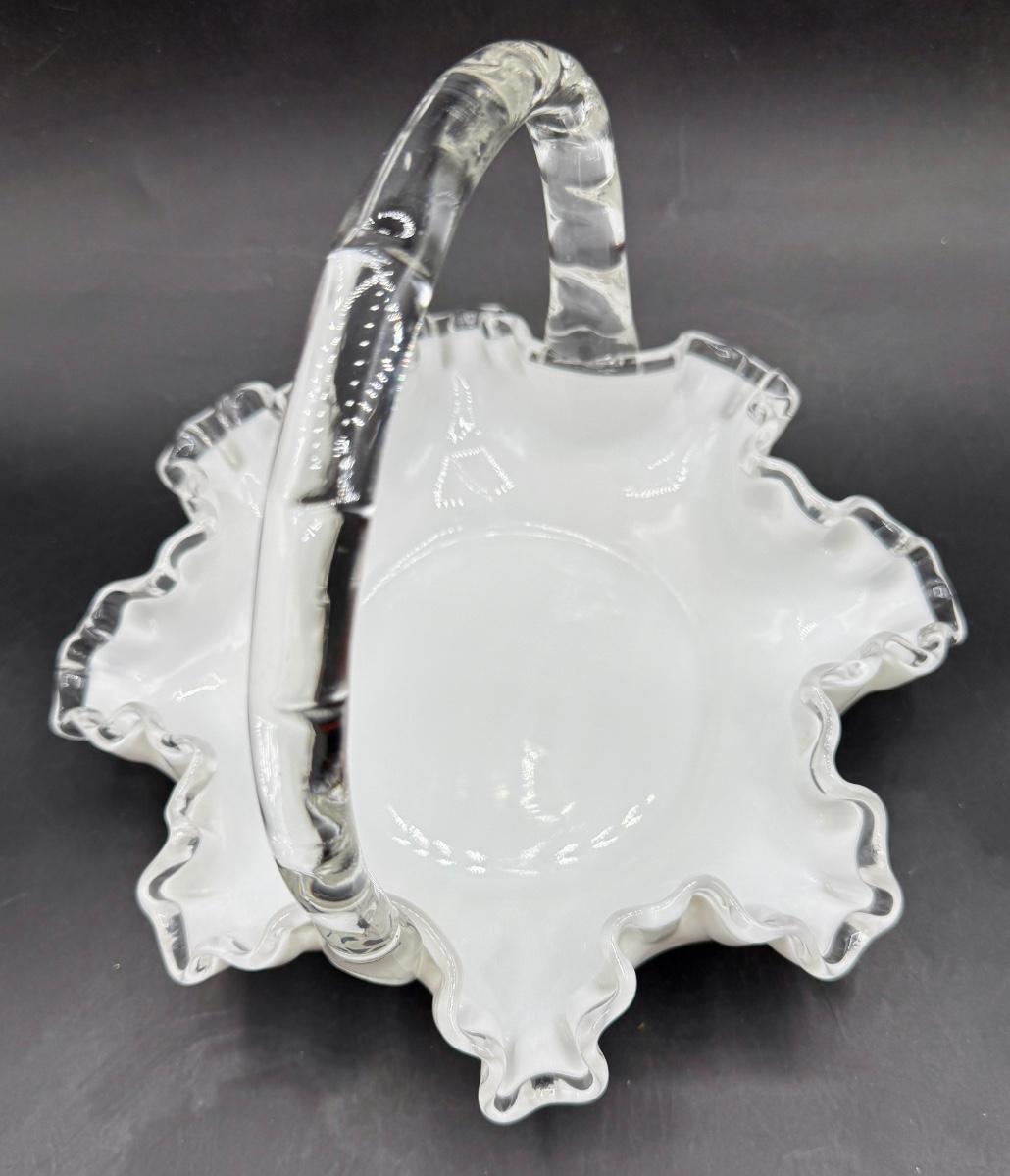 Vintage Fenton White Milk Glass Basket Clear Ruffled Rim Clear Handle