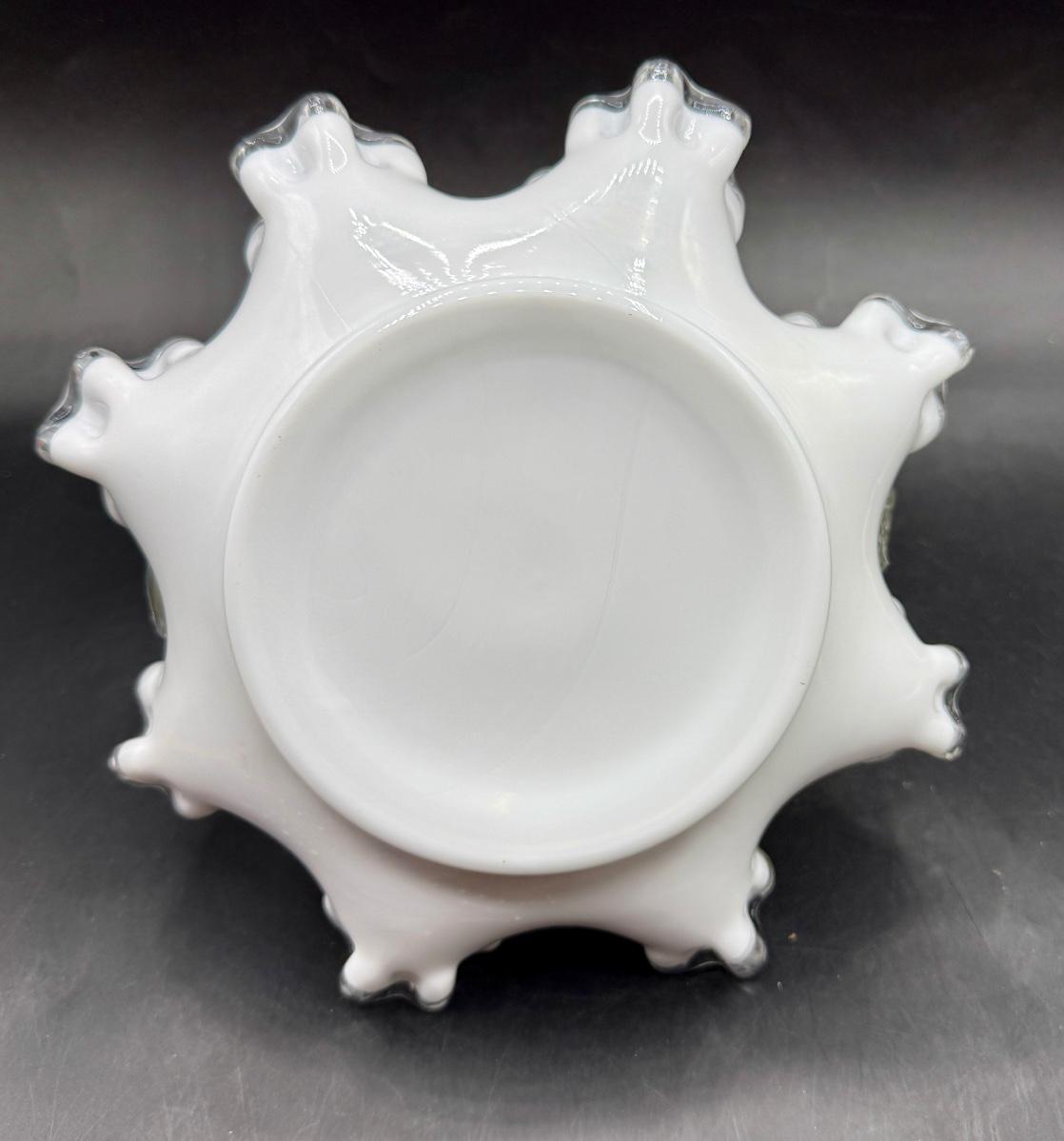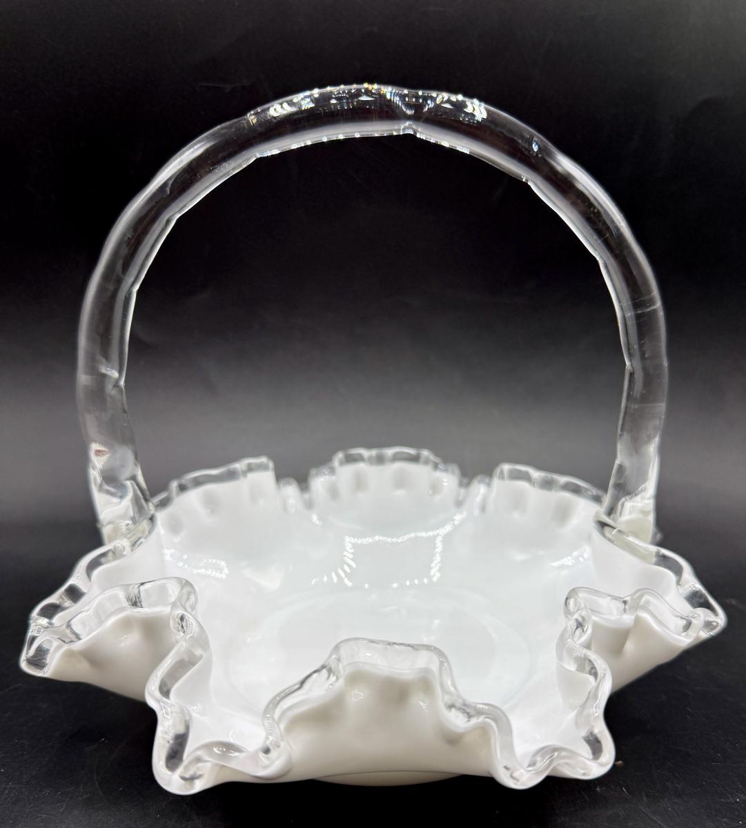 Vintage Fenton Silvercrest White Milk Glass Basket Clear Ruffled Rim Clear Handle
