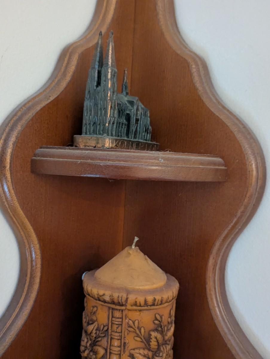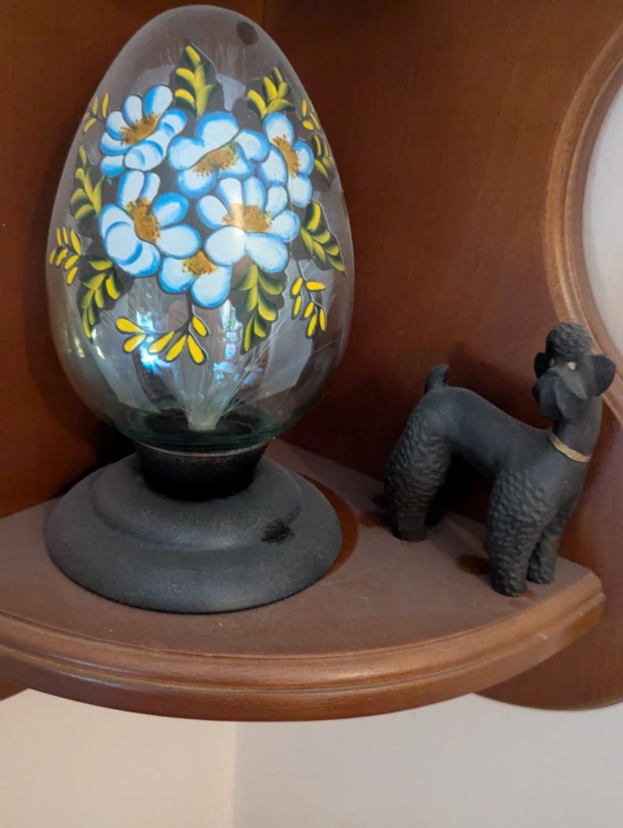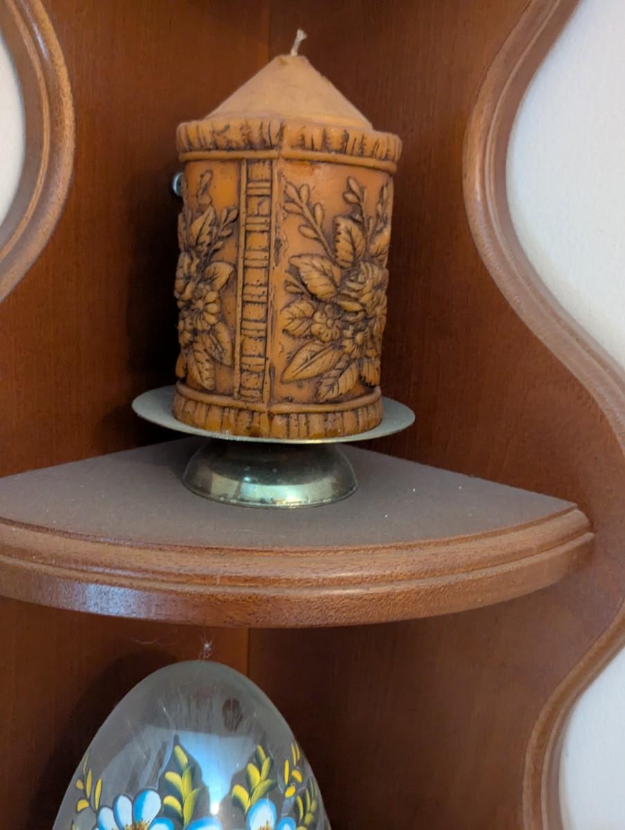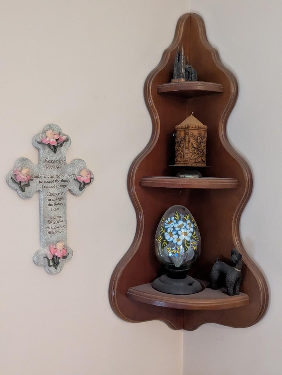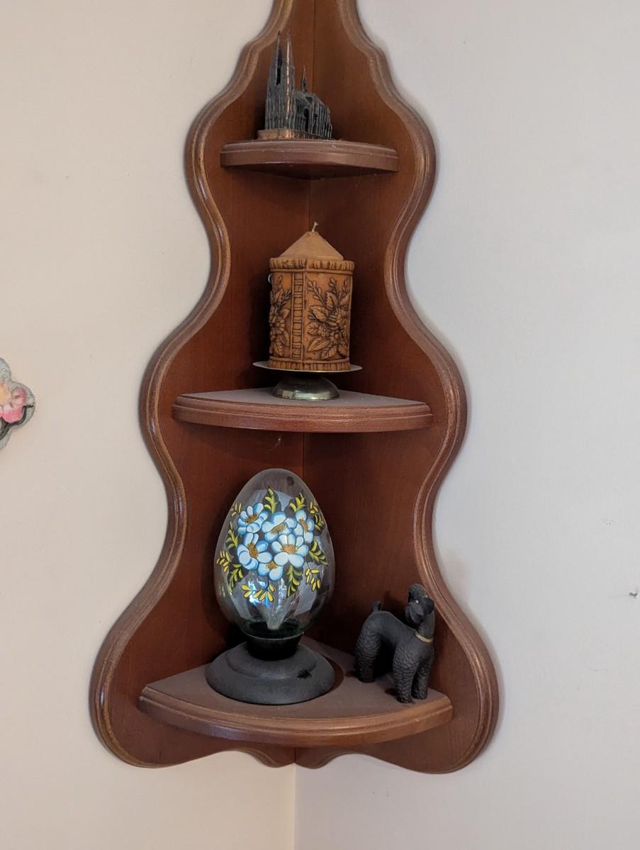 Wooden Corner Shelf With Vintage Fiber Optic Glass Egg Shaped Lamp Cross Wall Decor Candle & Building