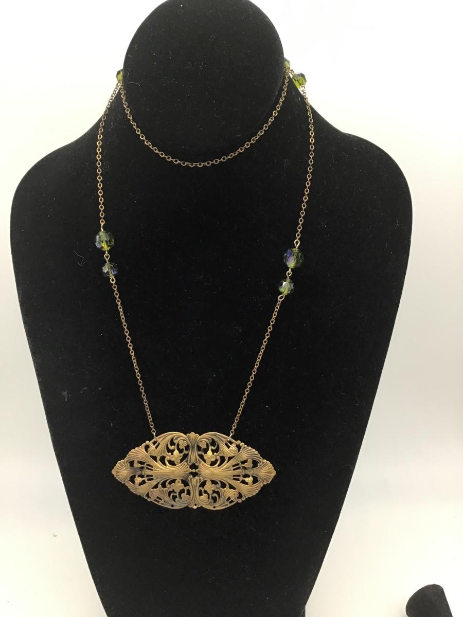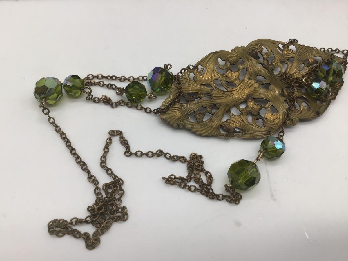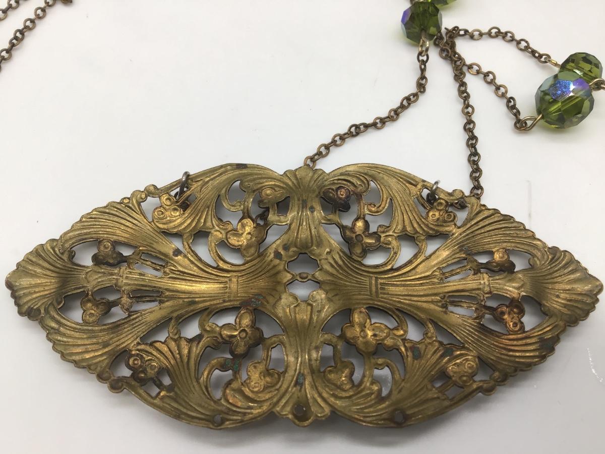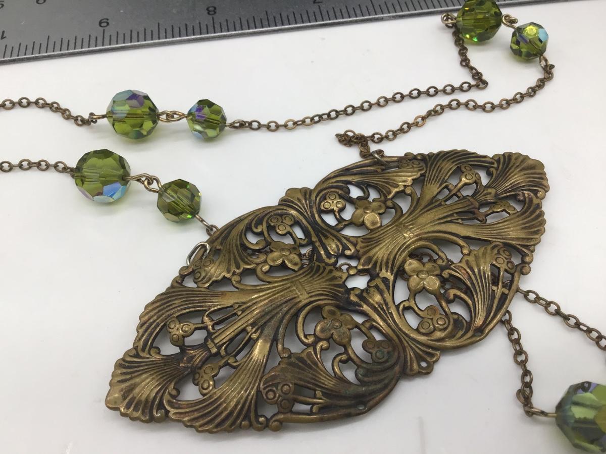 Vintage Filagree Pendant Green Aurora Borealis
