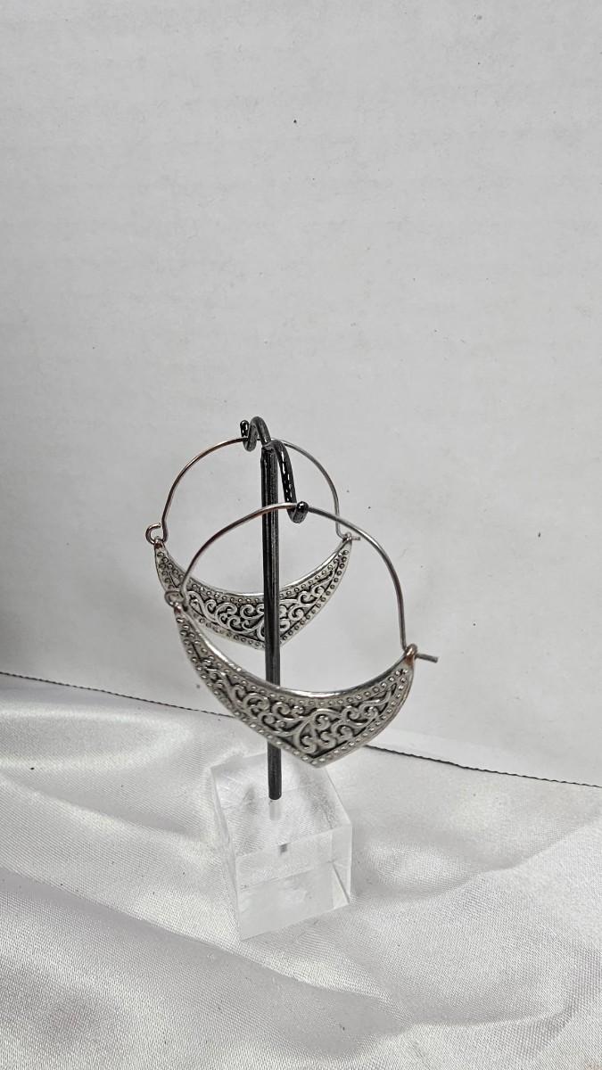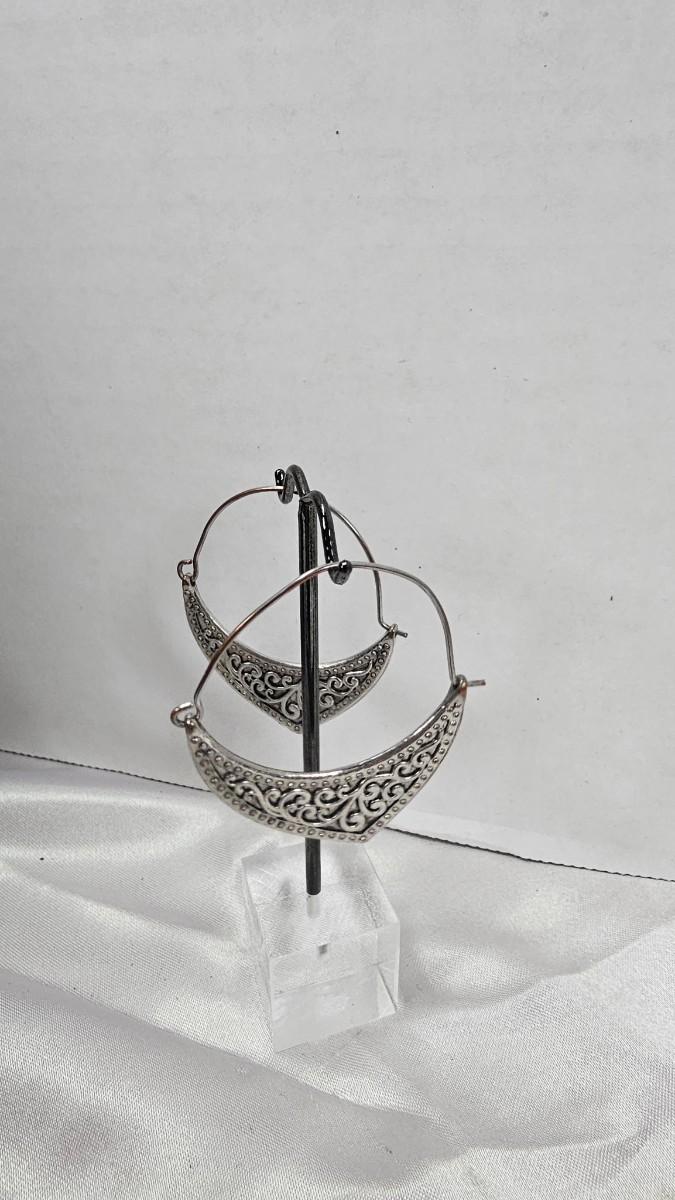 These vintage crescent hoop earrings present a refined balance of movement, texture, and ornamental detail. Each earring features a graceful open hoop silhouette anchored by a sculpted crescent element, richly decorated with raised filigree scrollwork that evokes classical European and Middle Eastern design influences. The metal carries an antiqued silver-tone finish, lending depth and dimension to the intricate patterns while maintaining a soft, elegant sheen rather than a high polish.