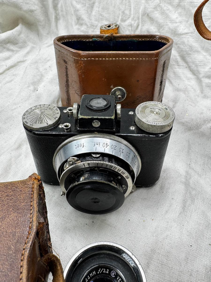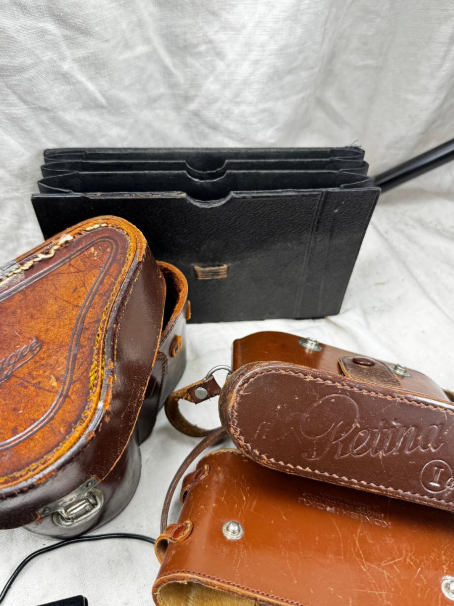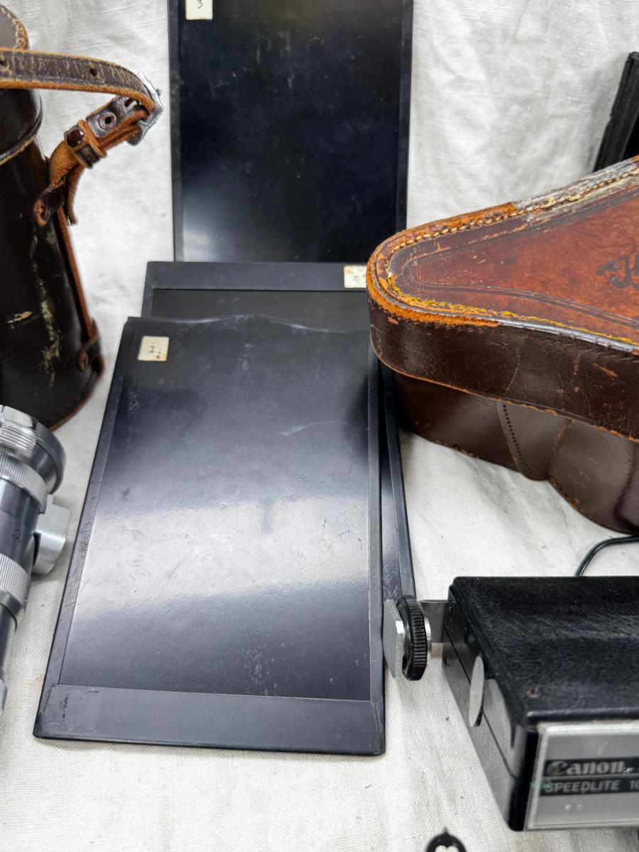Untested vintage cameras, film backs , empty cases . There is one intact French pupille camera with case.