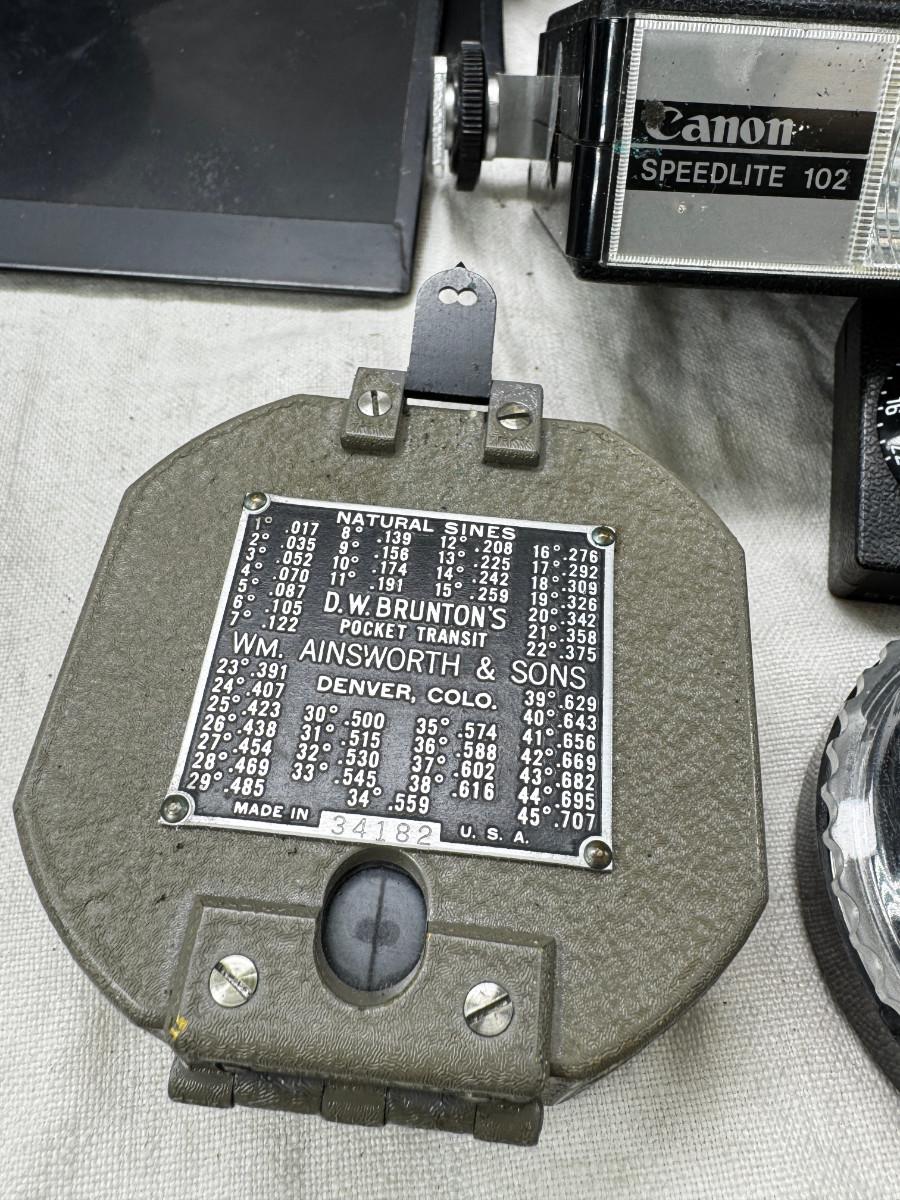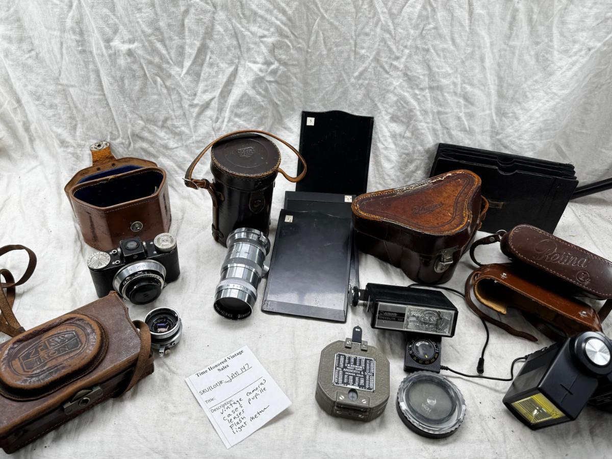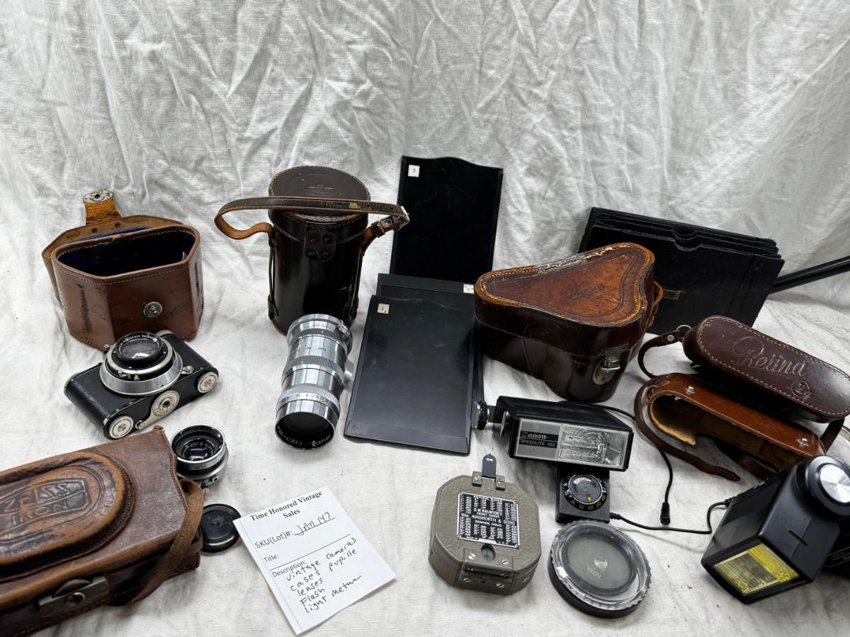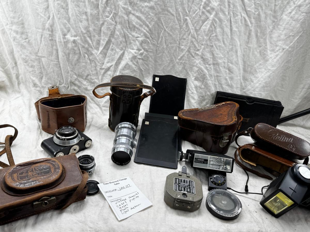 Vintage film cameras, cases light meters, flash lense