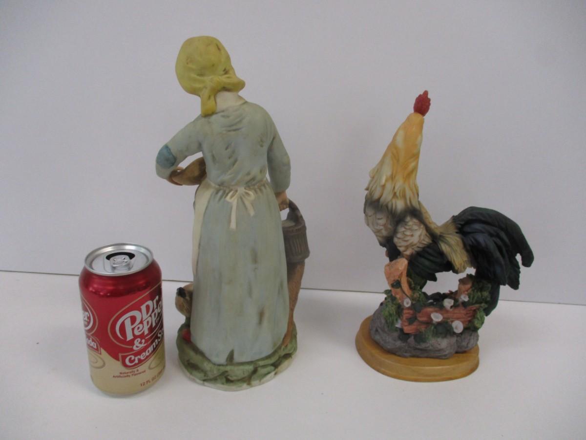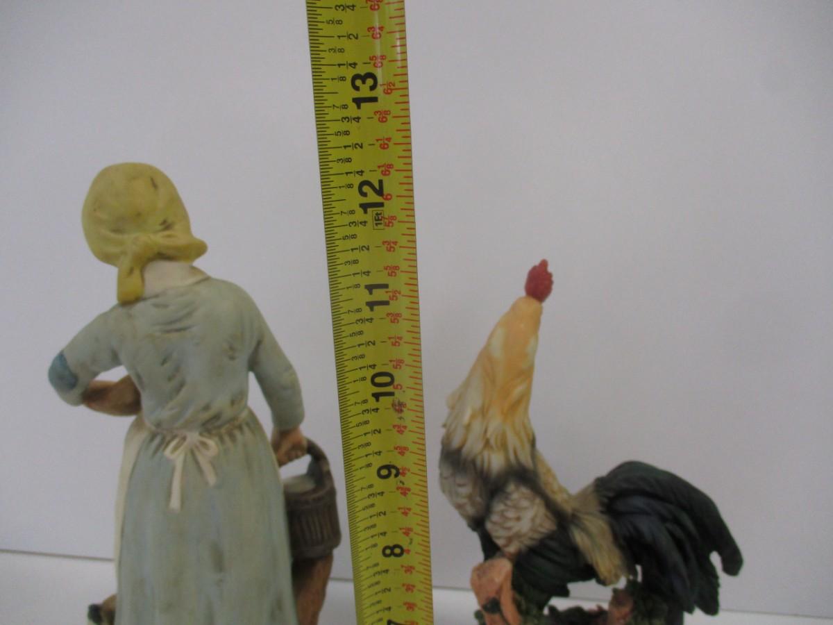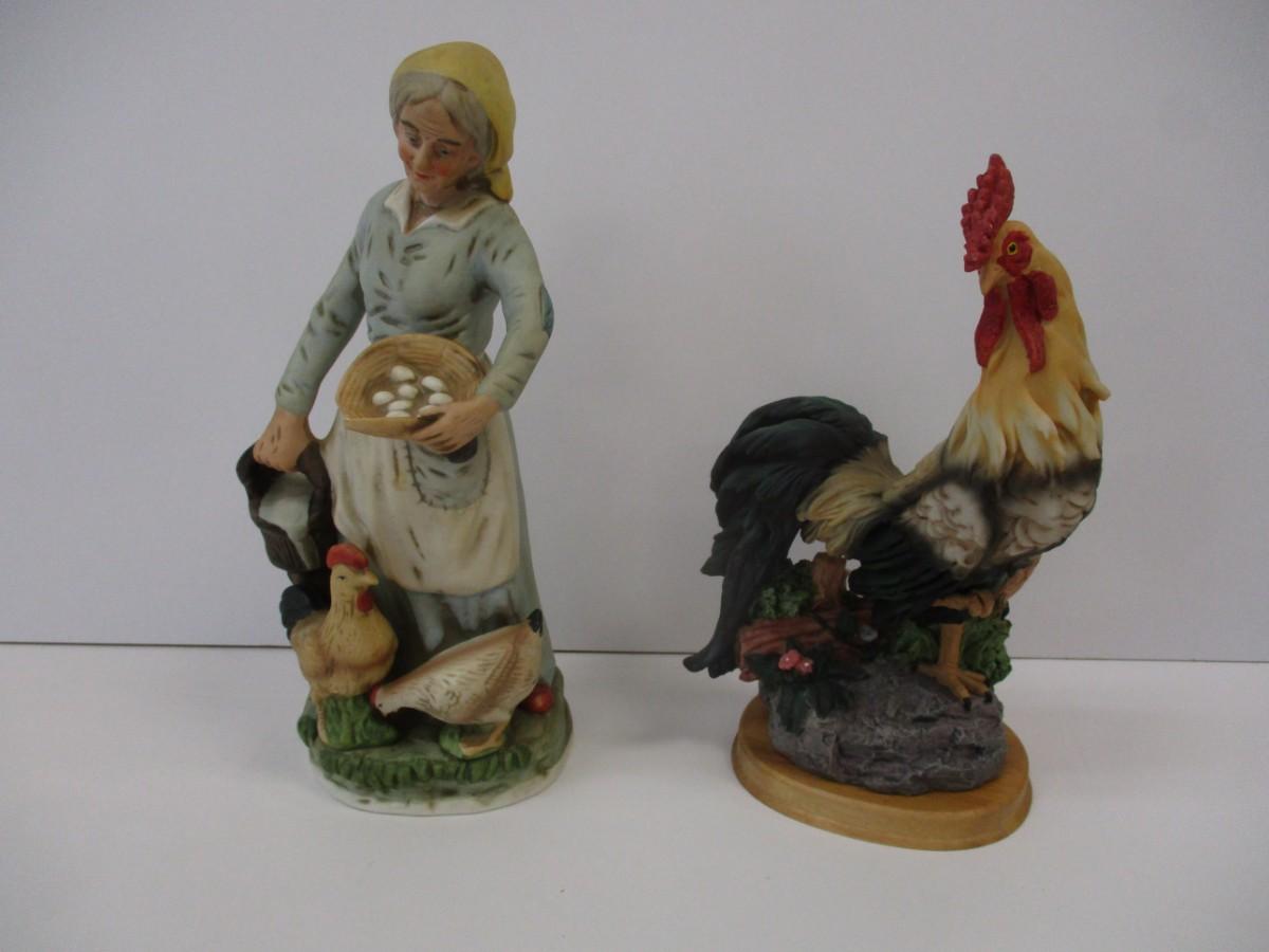 Vintage Fine Porcelain Bisque Farmhouse Woman Gathering Eggs & "Proud Rooster" 2001 Figure