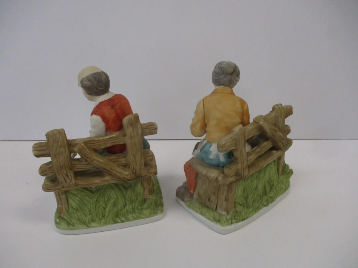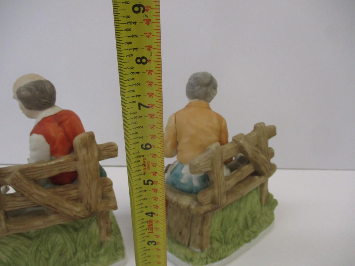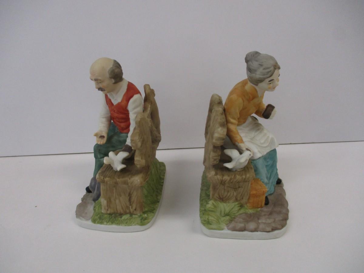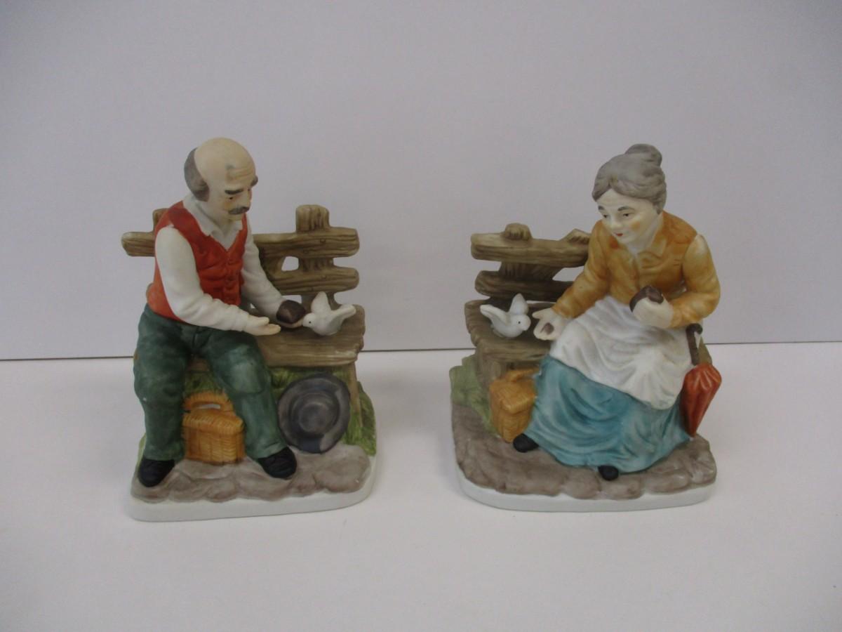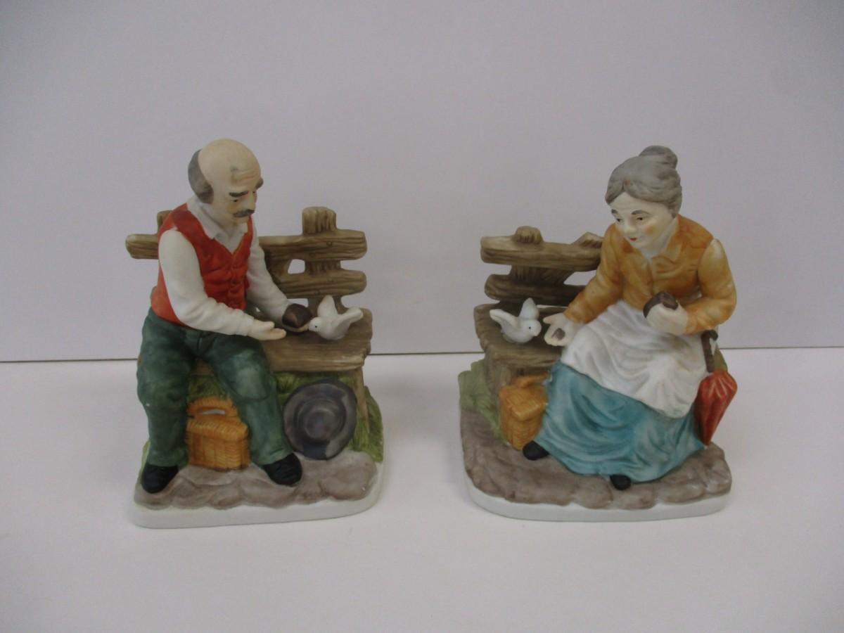 Vintage Fine Porcelain Bisque Older Man & Woman Sitting On A Bench Feeding Birds