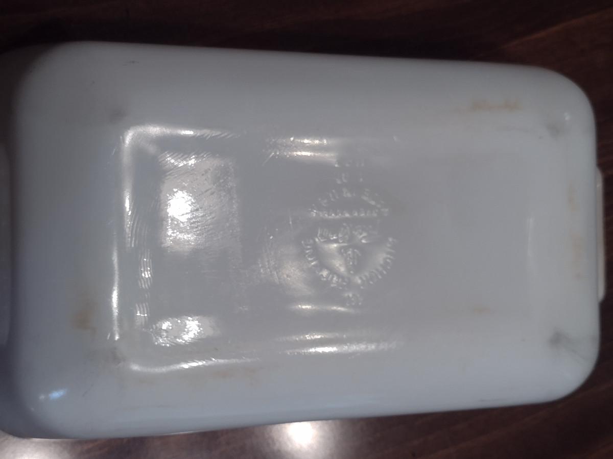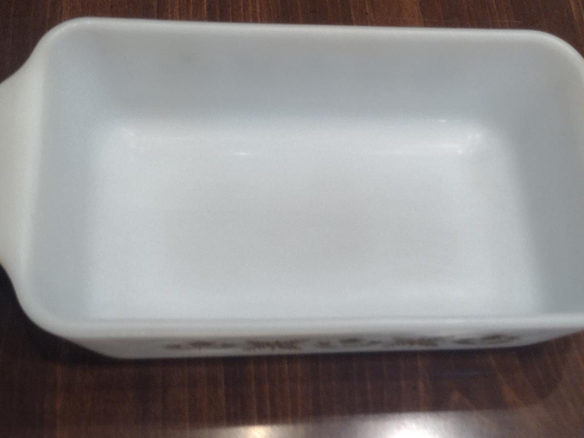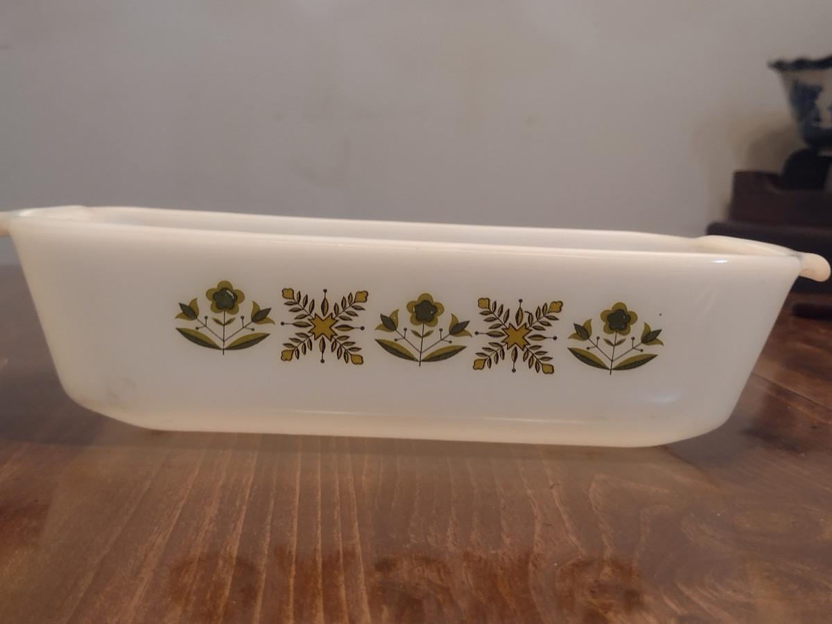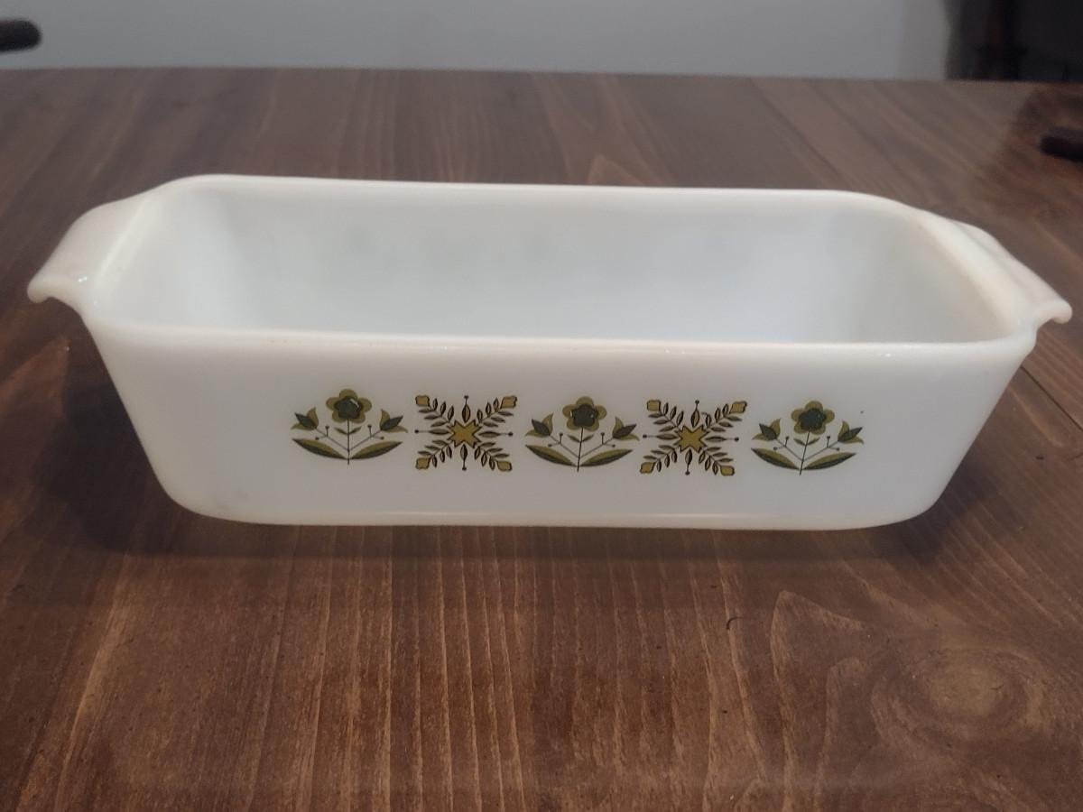 Vintage Fire King 'Green Meadow' Milk Glass Bread Pan. Item is in used condition and may have marking/signs of wear.