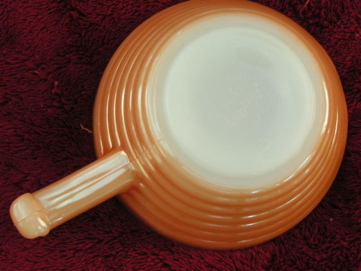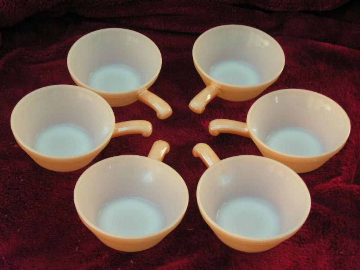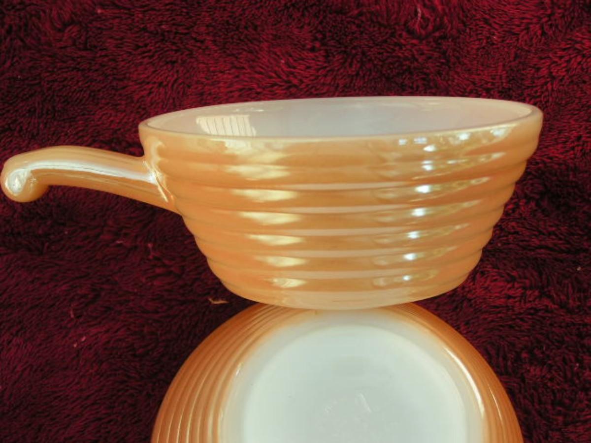 More great vintage and classic items like this elsewhere in this sale. Vintage Fire King Peach Luster Beehive Ovenware soup bowls w/handles. Made by Anchor Hocking. Believed c.1940s-50s. Opalescent milk glass w/ peach luster finish. Highly collectible. MINT!