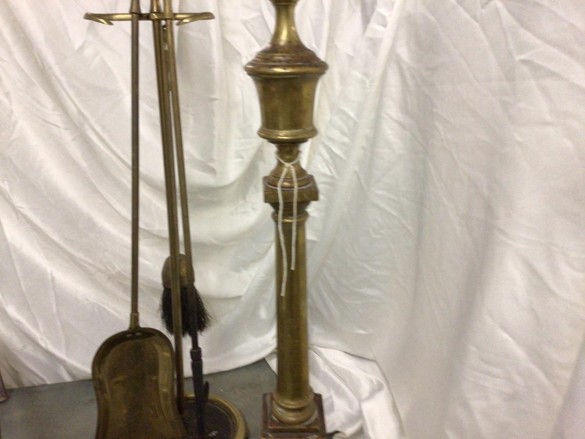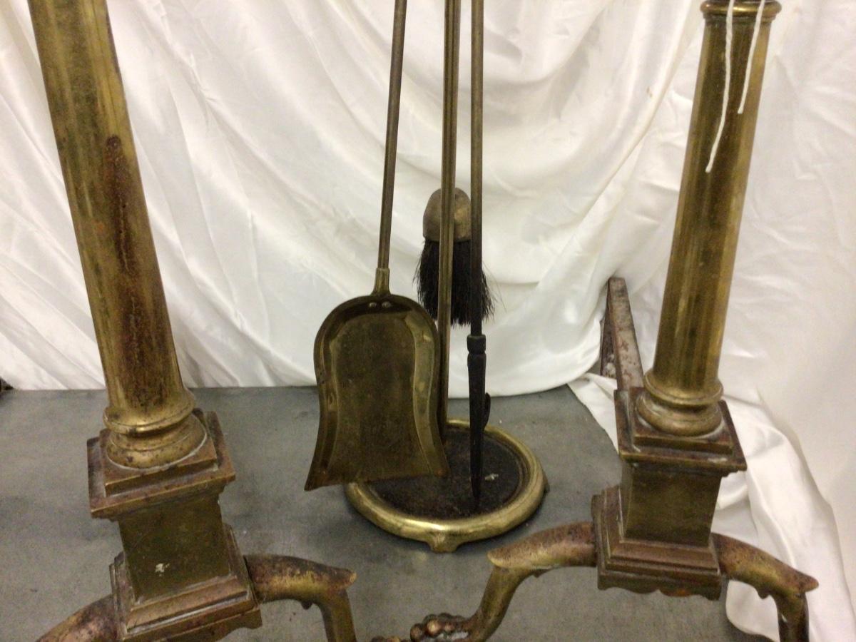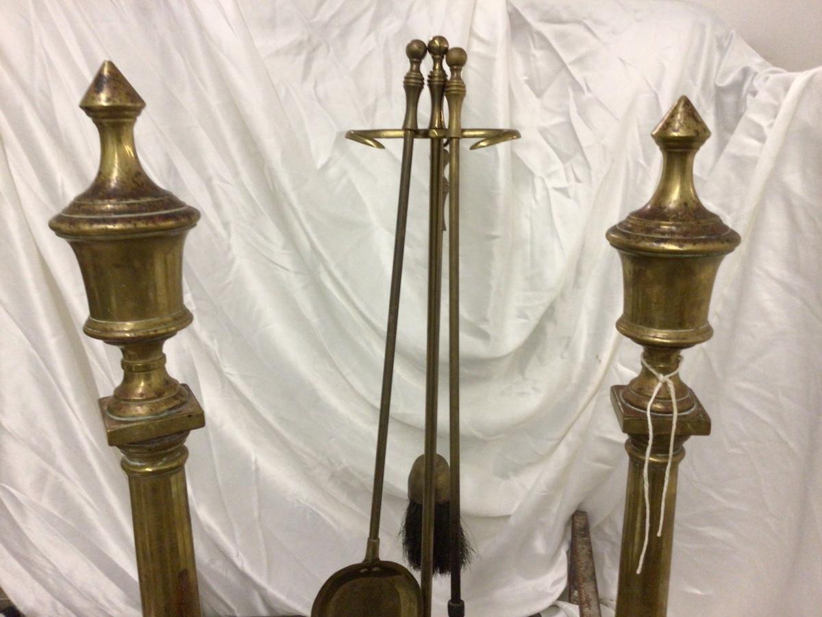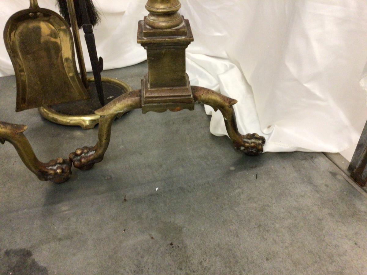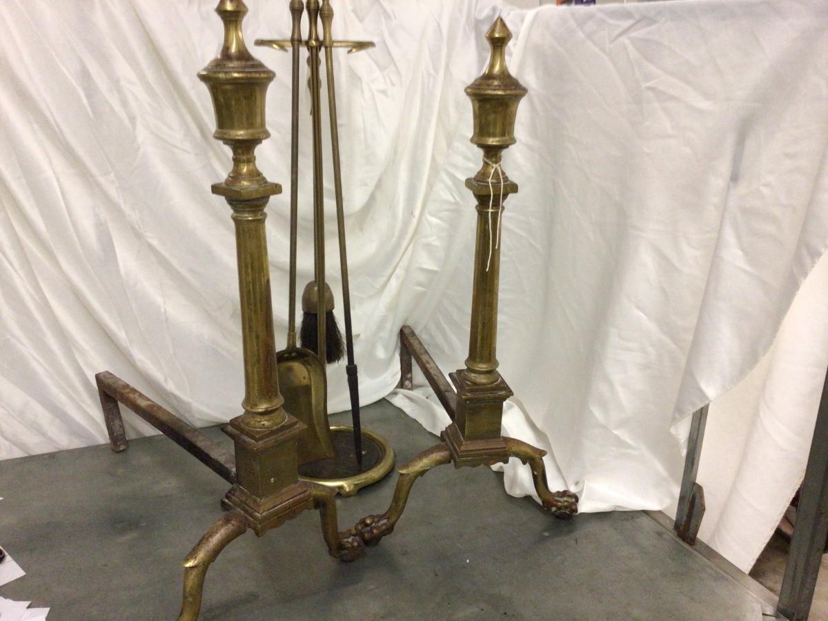 You get brass set of ire place tools, poker, broom, and shovel. Also felt vintage brass Andirons set.