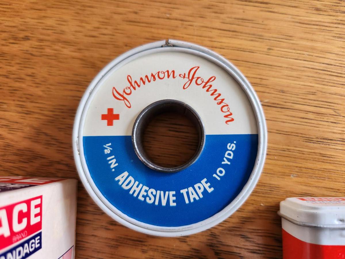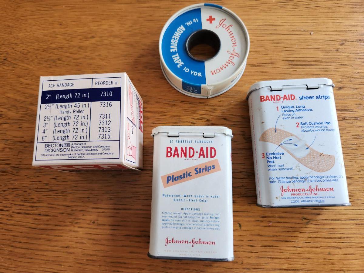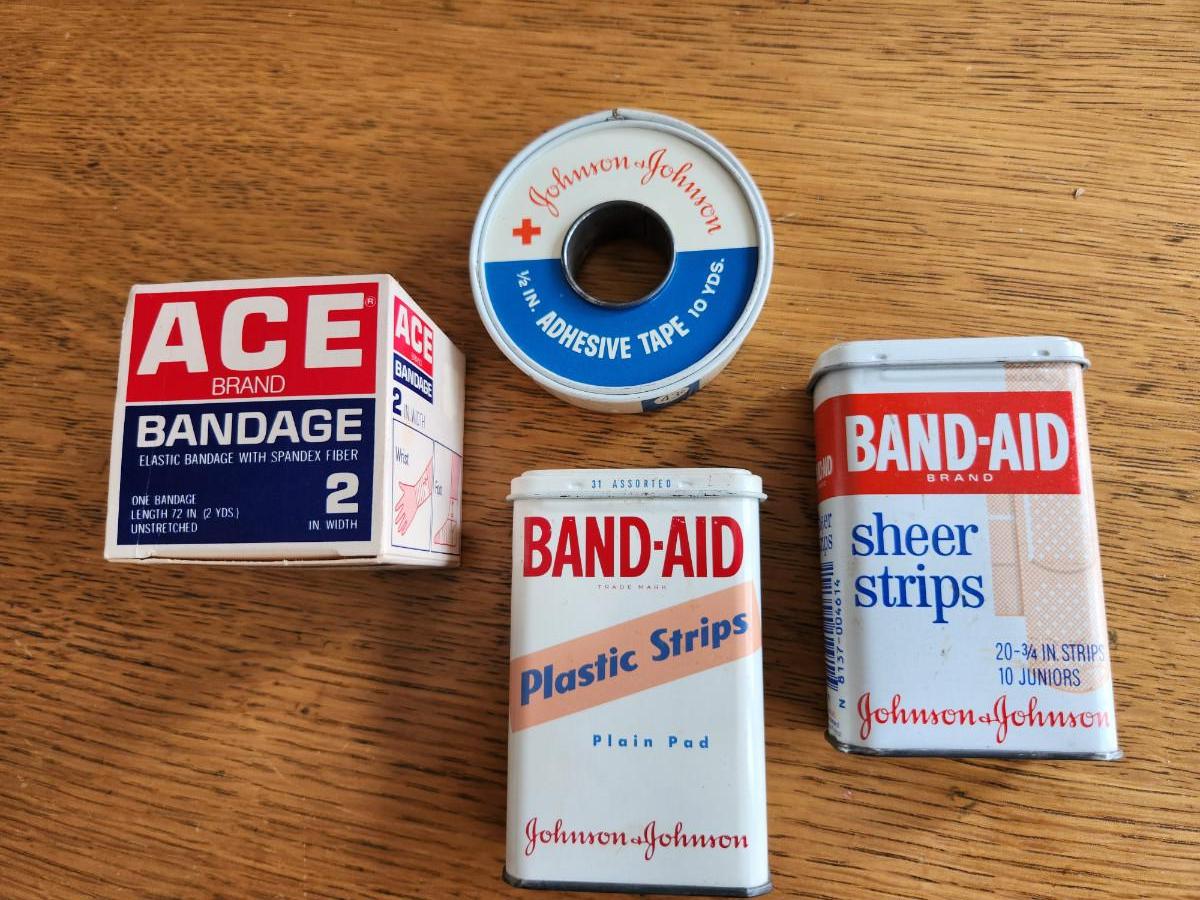 This auction lot is for a grouping of Vintage First Aid Supplies. The group includes 2 metal Band-Aid containers , one still full of produce, a paper box with an ACE wrap bandage and a round J&J Adhesive Tape container. Ready for display or other use of your choice.