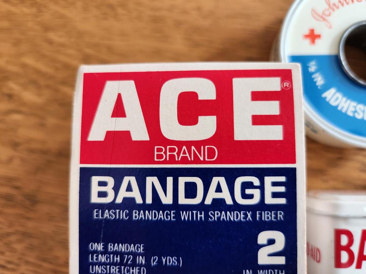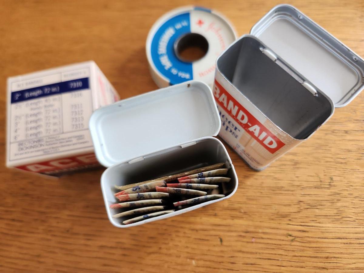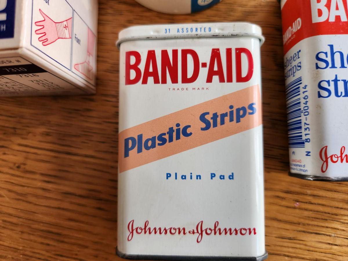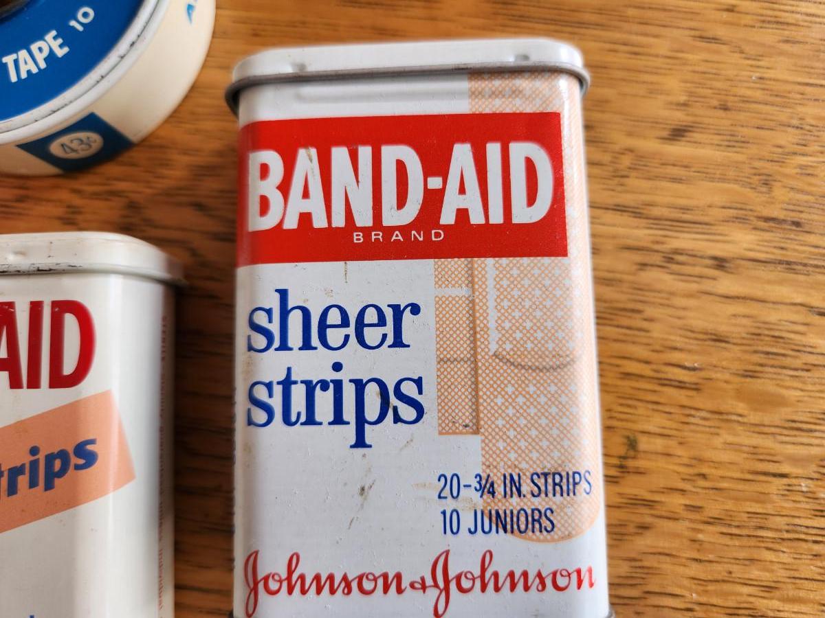 This auction lot is for a grouping of Vintage First Aid Supplies. The group includes 2 metal Band-Aid containers , one still full of produce, a paper box with an ACE wrap bandage and a round J&J Adhesive Tape container. Ready for display or other use of your choice.
