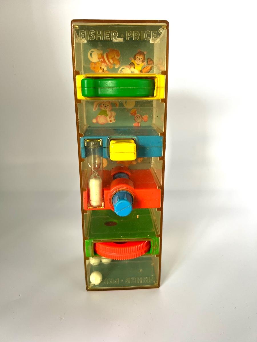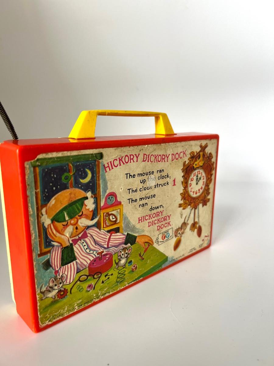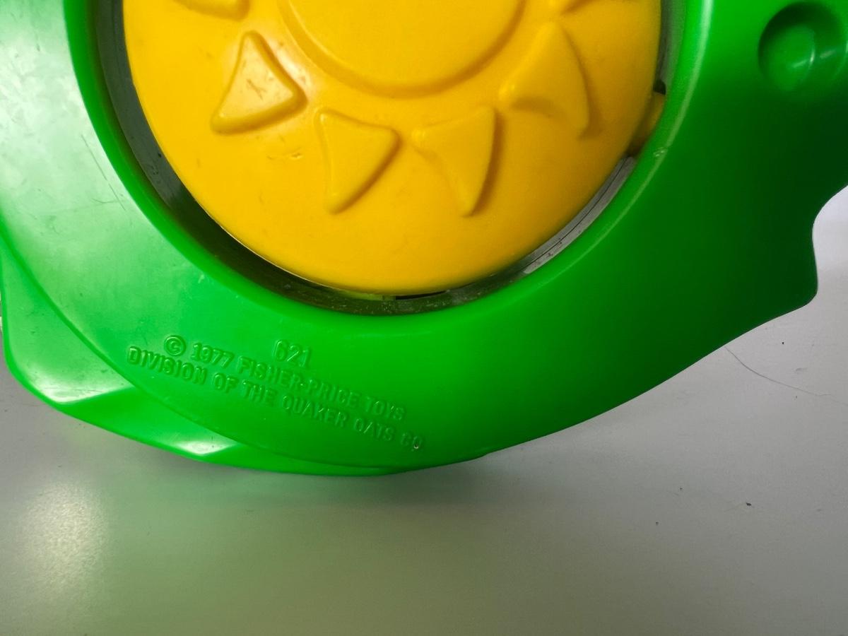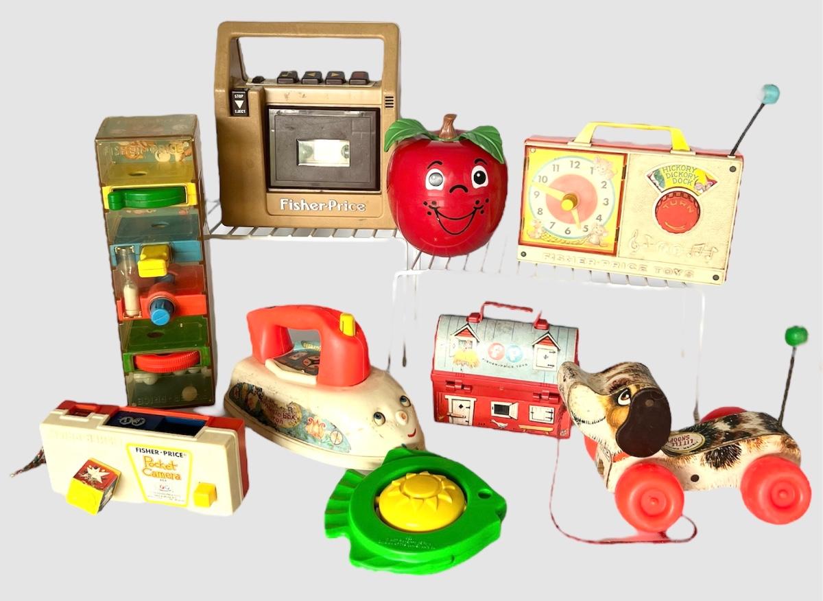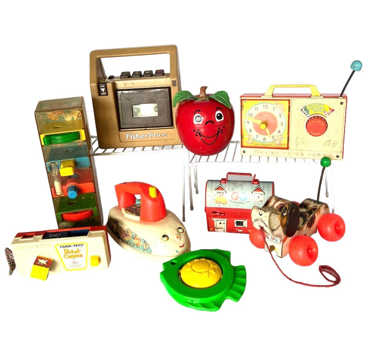 Doesn’t this take you back!! This lot covers toys from 60s, 70s, and 80s! In the lot you get one red apple, 1972, one recorder 1980, one hickory Dickory dock wind toy that works 1964, pocket camera, 1974 tumble tower, 1971, little snoopy wooden toy dog, 1968 green and yellow fish, 1977, Farm Box, does have a broken handle at the top 1962 and lastly Fisher-Price iron no date noted. these toys were all loved and played with. Please see pictures for details.