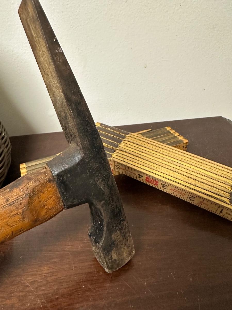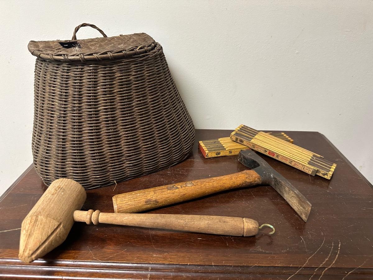 VINTAGE FISH BASKET, RULER, TOOL LOT