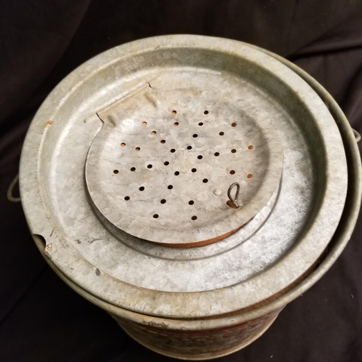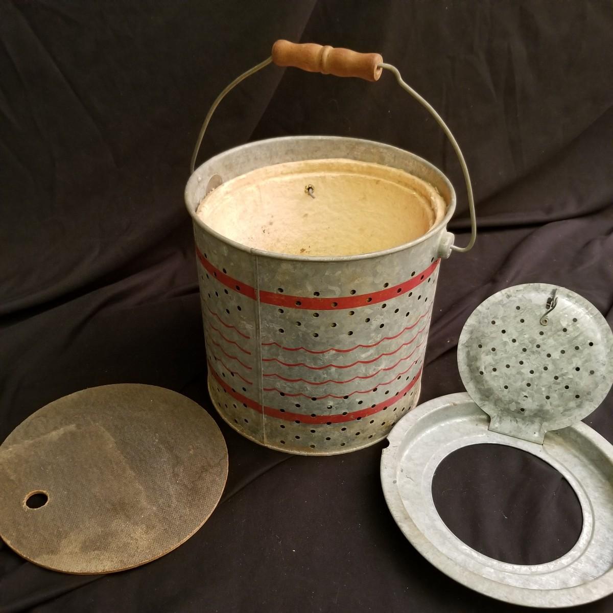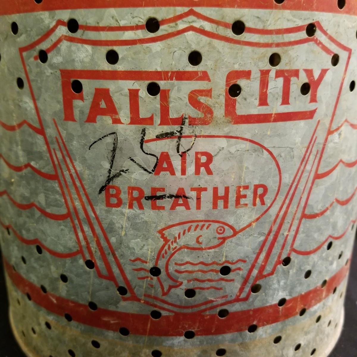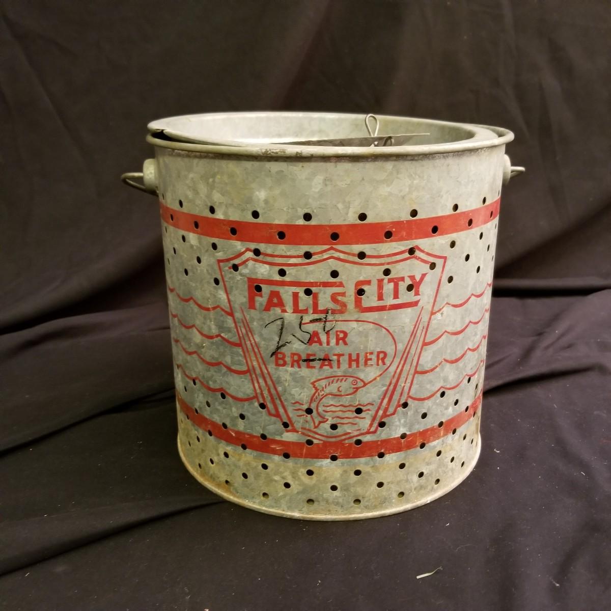 A vintage Falls City air breather to hold fish or small bait. Made of galvanized steel with a composite paper liner, this item measures 9"d x9" t. Has wood handle and a spring lock top lid for easy access. Sone rust but in fair shape. See photos for details. Shipping available.