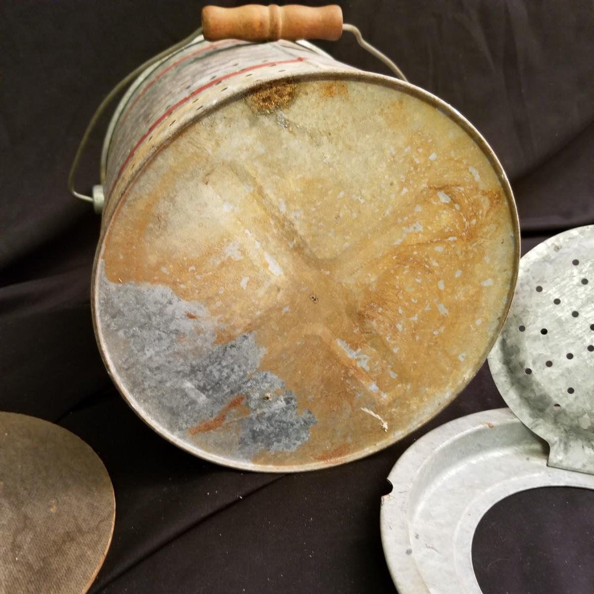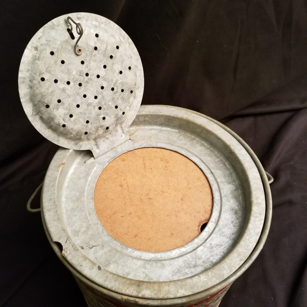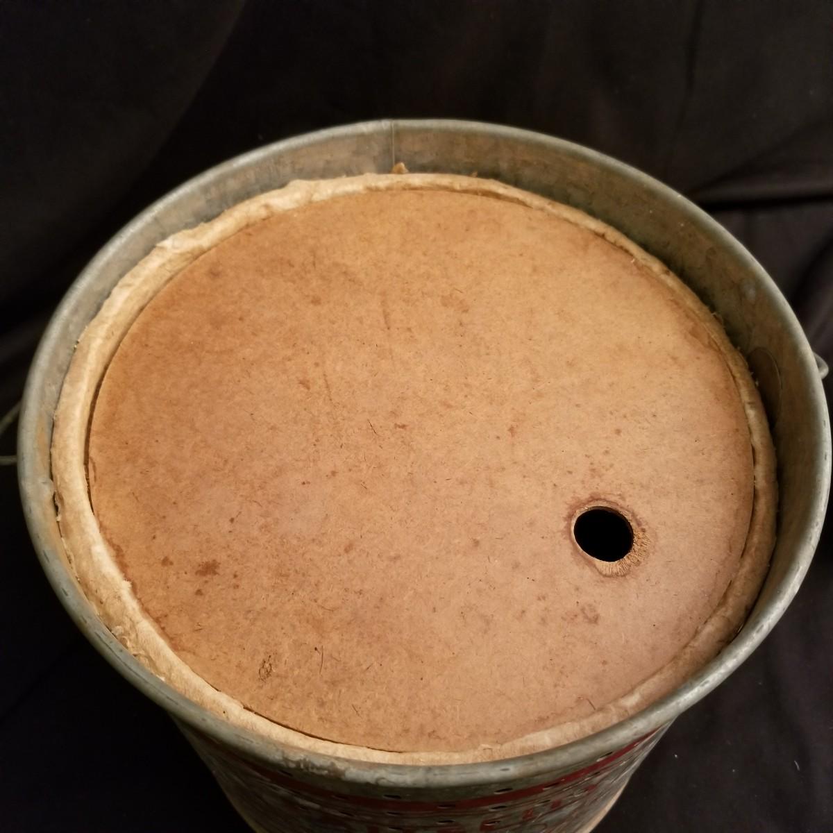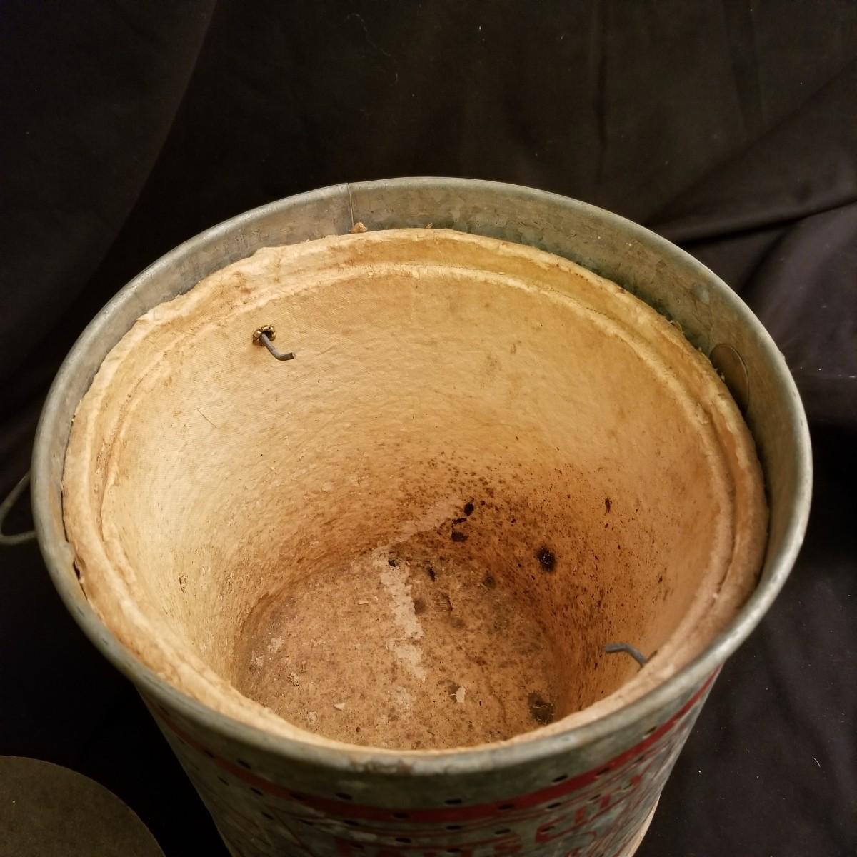 A vintage Falls City air breather to hold fish or small bait. Made of galvanized steel with a composite paper liner, this item measures 9"d x9" t. Has wood handle and a spring lock top lid for easy access. Sone rust but in fair shape. See photos for details. Shipping available.
