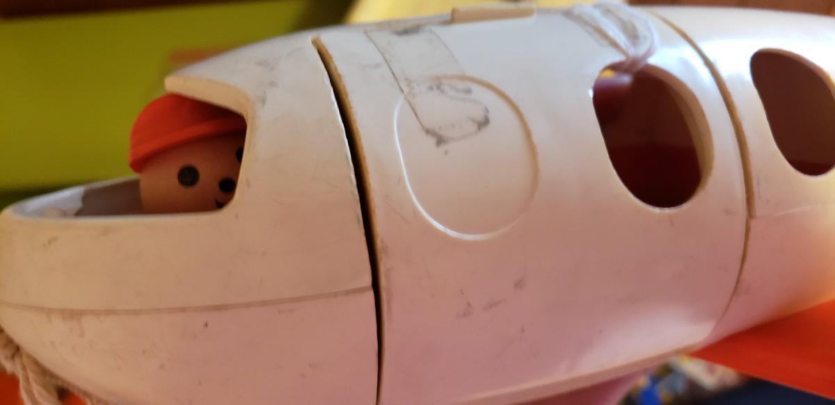 white/red/blue plane with little people & boat 1970s