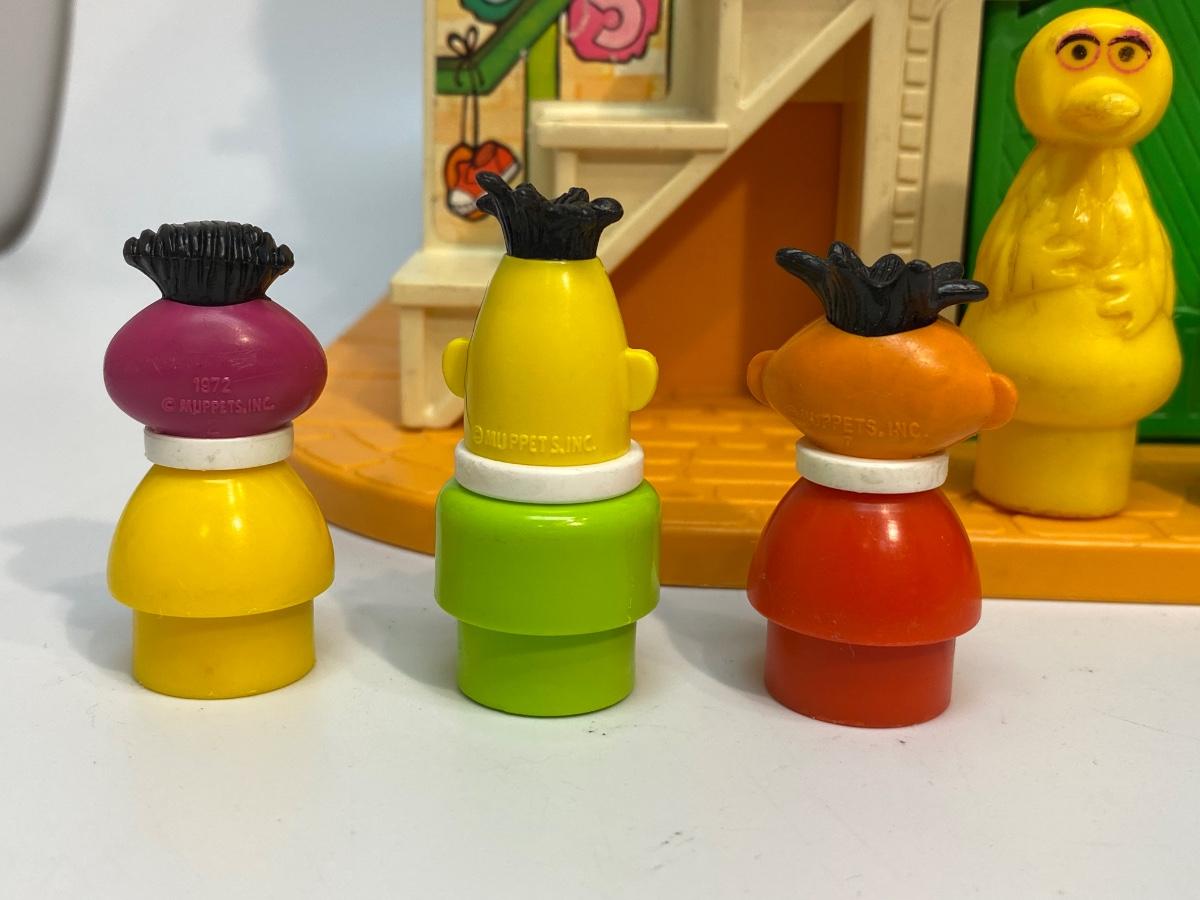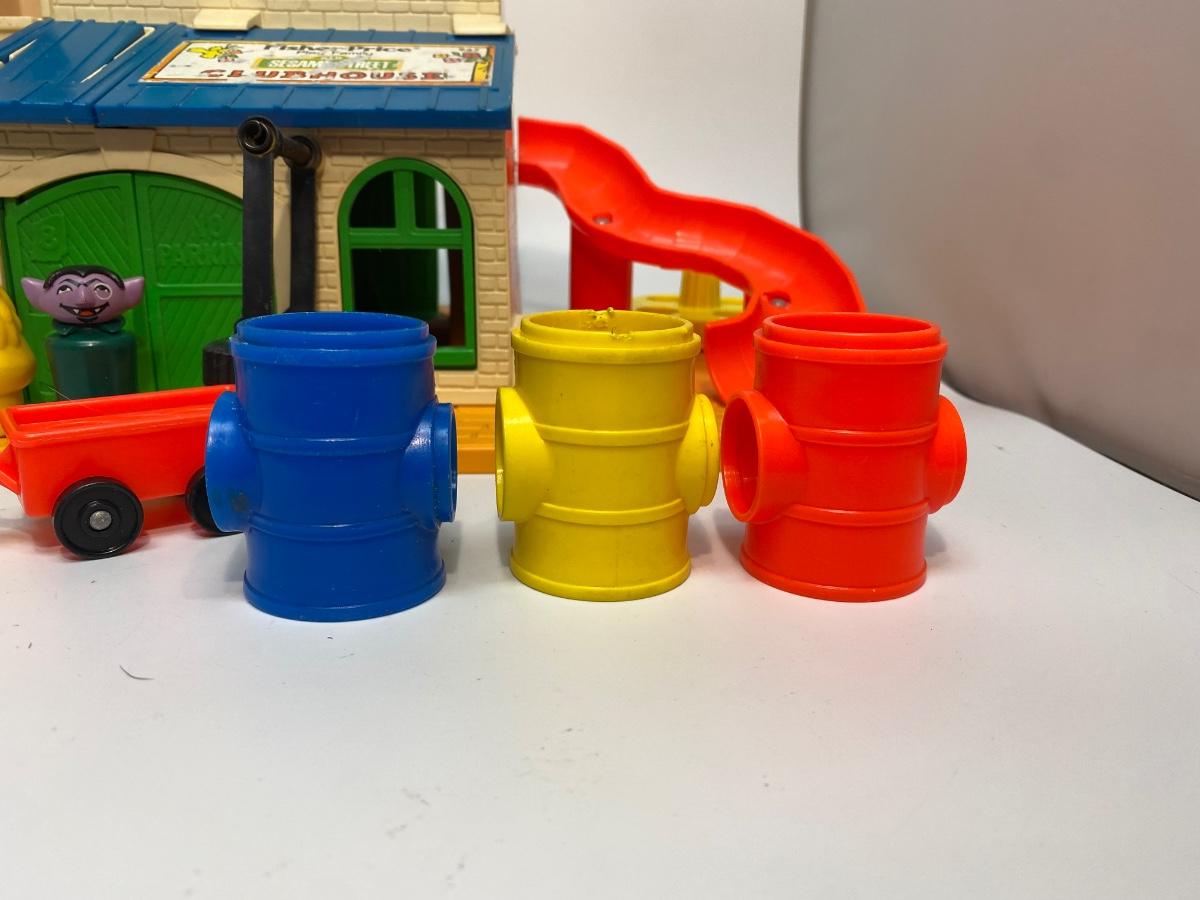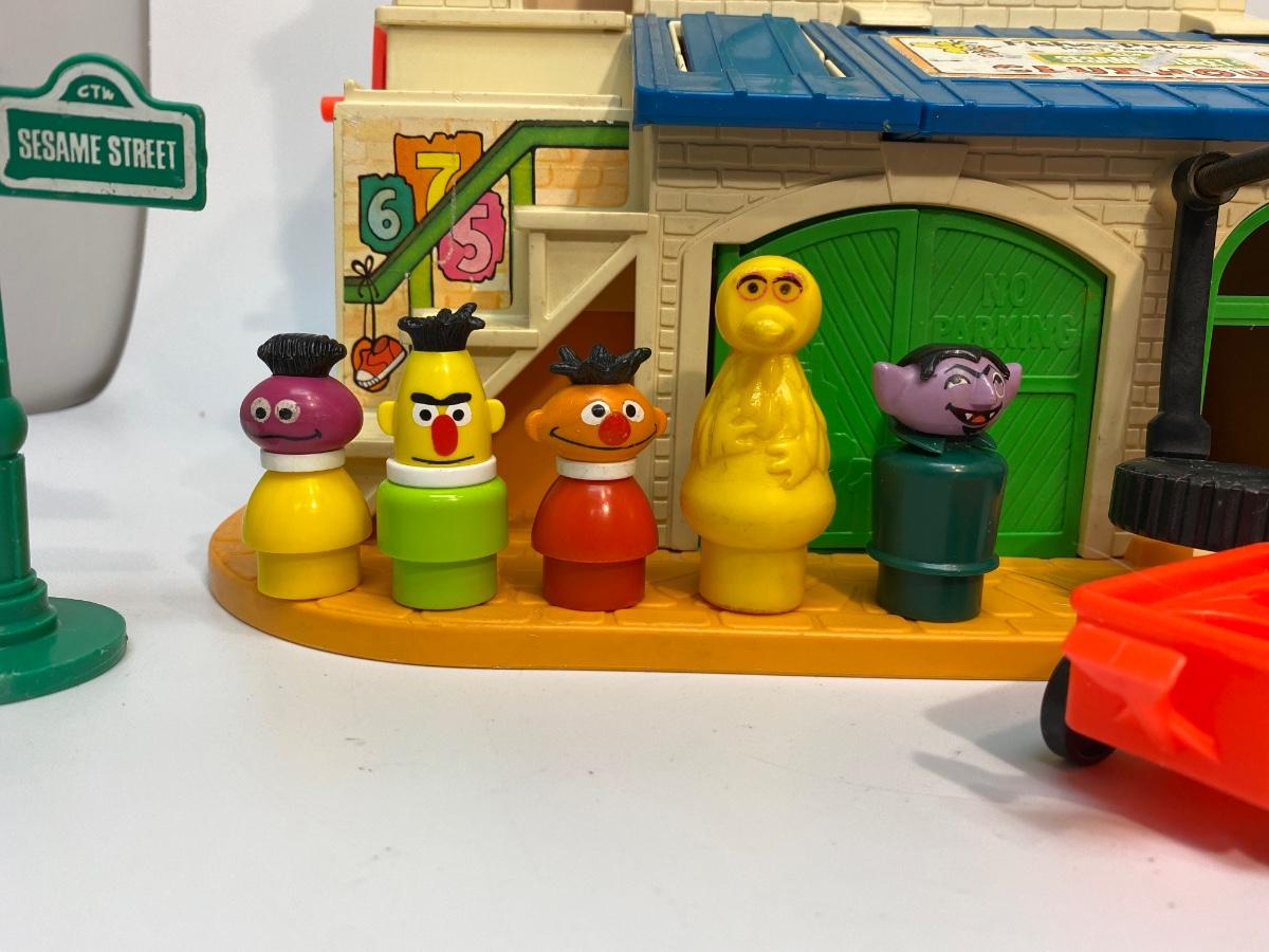 Vintage Fisher Price Little People play set #937, Sesame Street Clubhouse. In good played with vintage condition. Released in the late 1970s. Set includes clubhouse base, 3 snap together tubes (red, blue, yellow), red wagon, Sesame Street street sign lamp post, Bert, Ernie, Big Bird, The Count, and Roosevelt Franklin. Missing only a few pieces and Grover. Street sign was part of a different set.