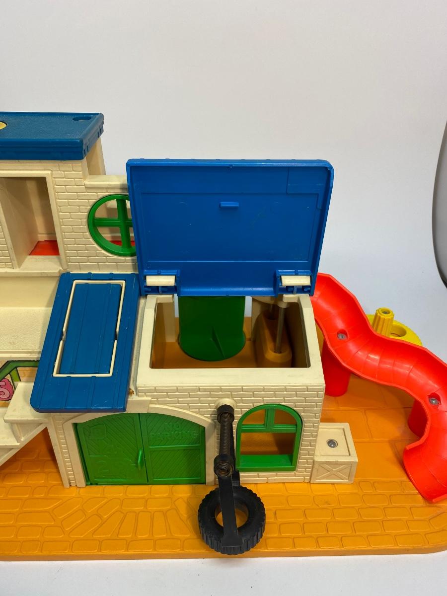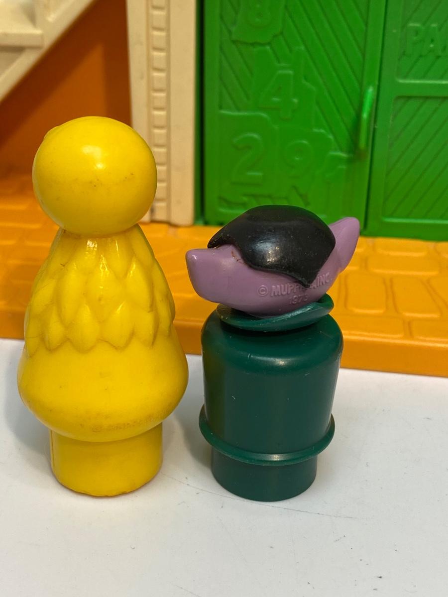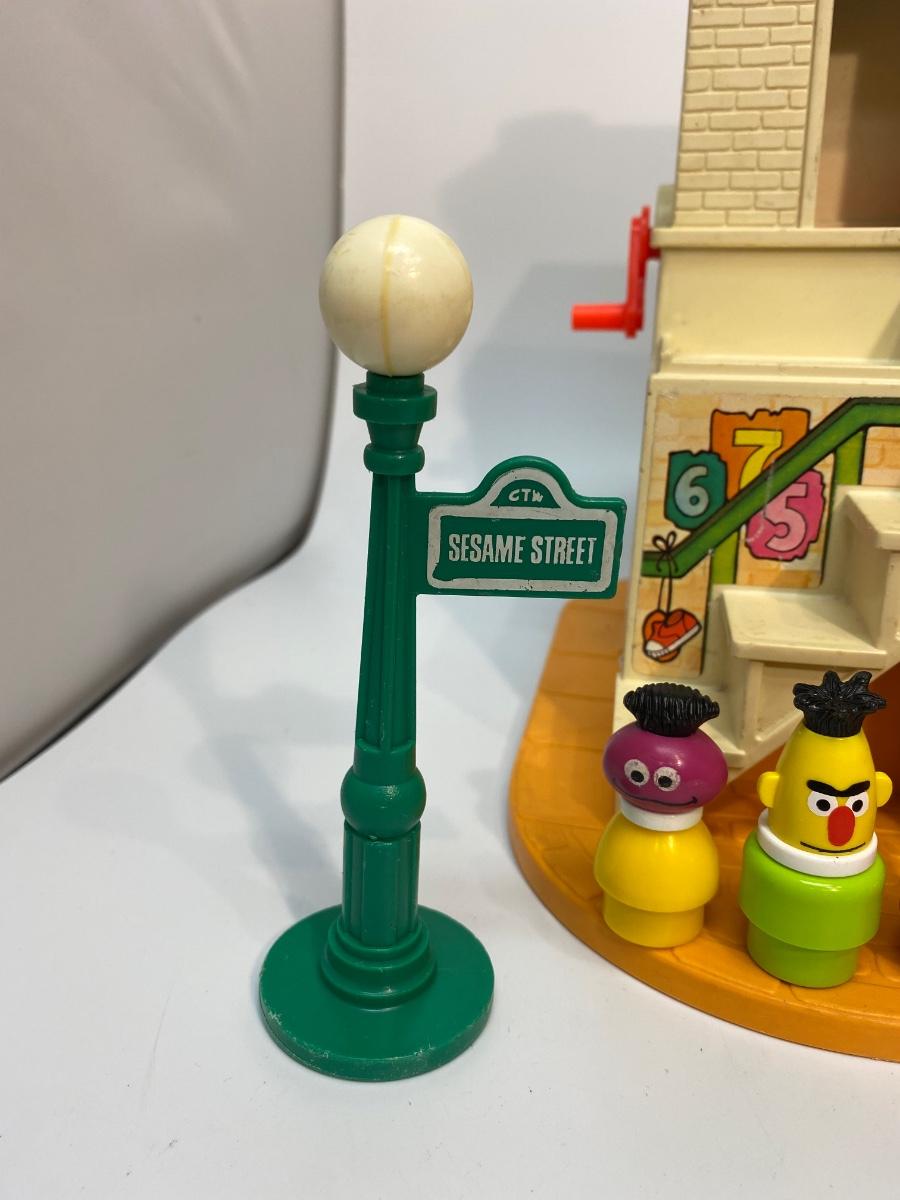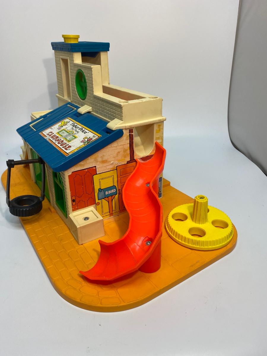 Vintage Fisher Price Little People play set #937, Sesame Street Clubhouse. In good played with vintage condition. Released in the late 1970s. Set includes clubhouse base, 3 snap together tubes (red, blue, yellow), red wagon, Sesame Street street sign lamp post, Bert, Ernie, Big Bird, The Count, and Roosevelt Franklin. Missing only a few pieces and Grover. Street sign was part of a different set.