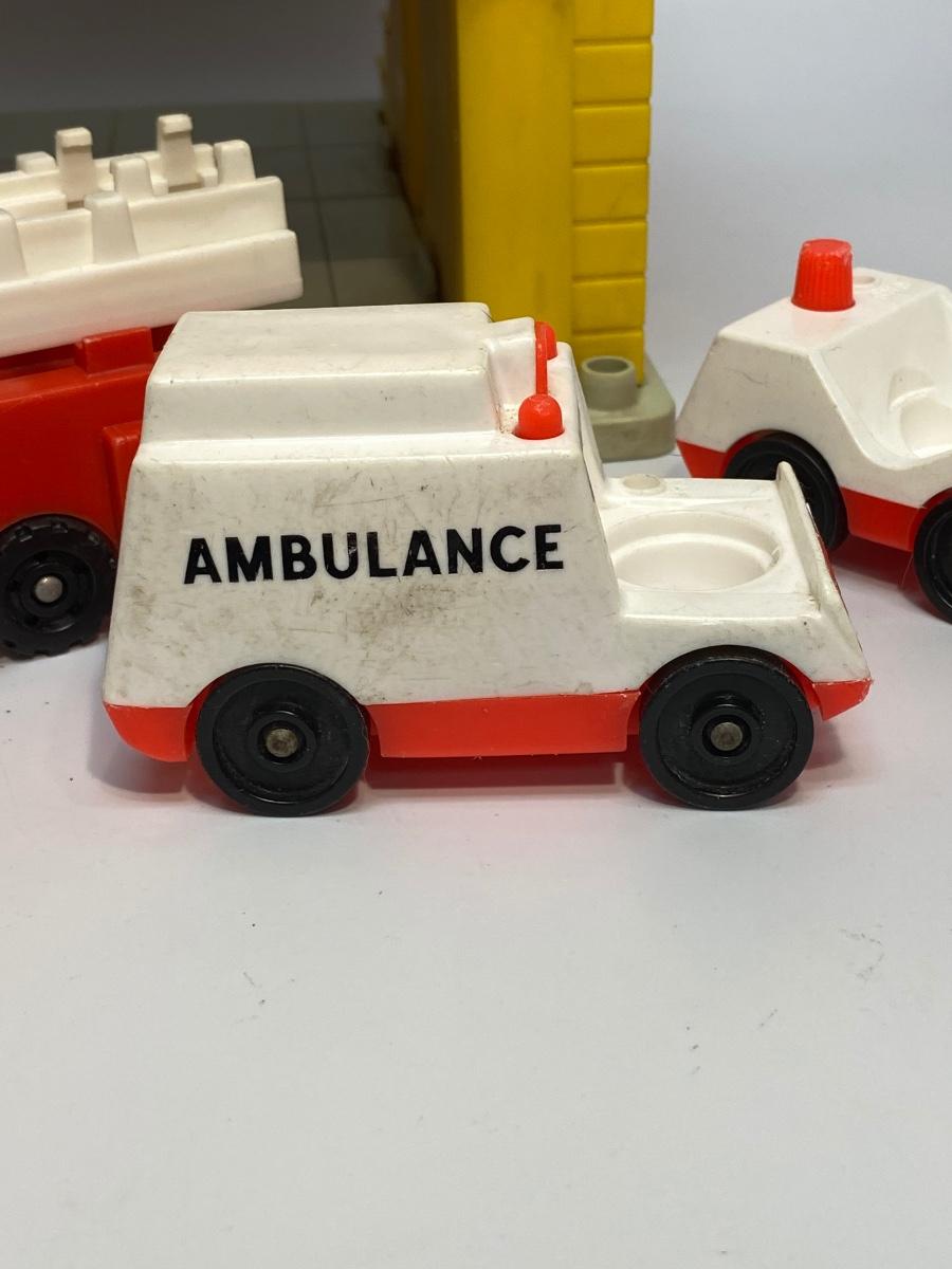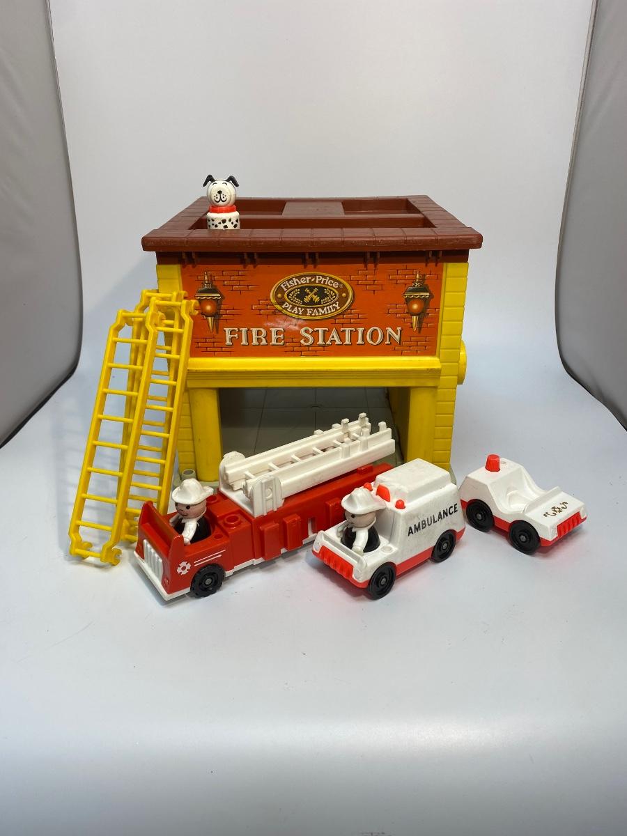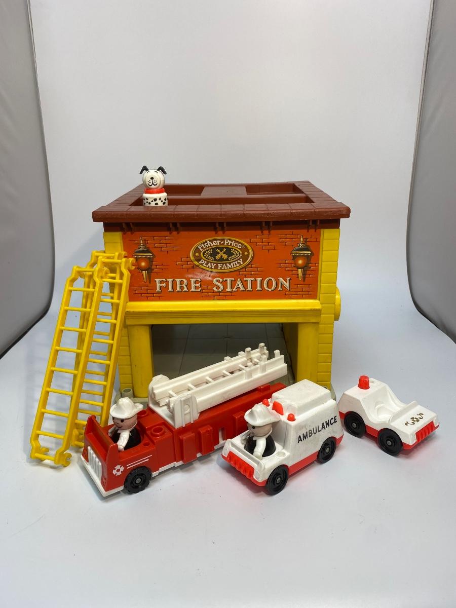 Vintage early 1980s Fisher Price Little People Play Family Fire Station #928. In good previously played with vintage condition. Play set includes the fire house, ladder truck, ambulance, fire chief's car, 3 yellow long ladders, 2 firemen with white hats, and dalmatian dog with red collar. Set is not complete. See photos for better idea of condition and any wear.