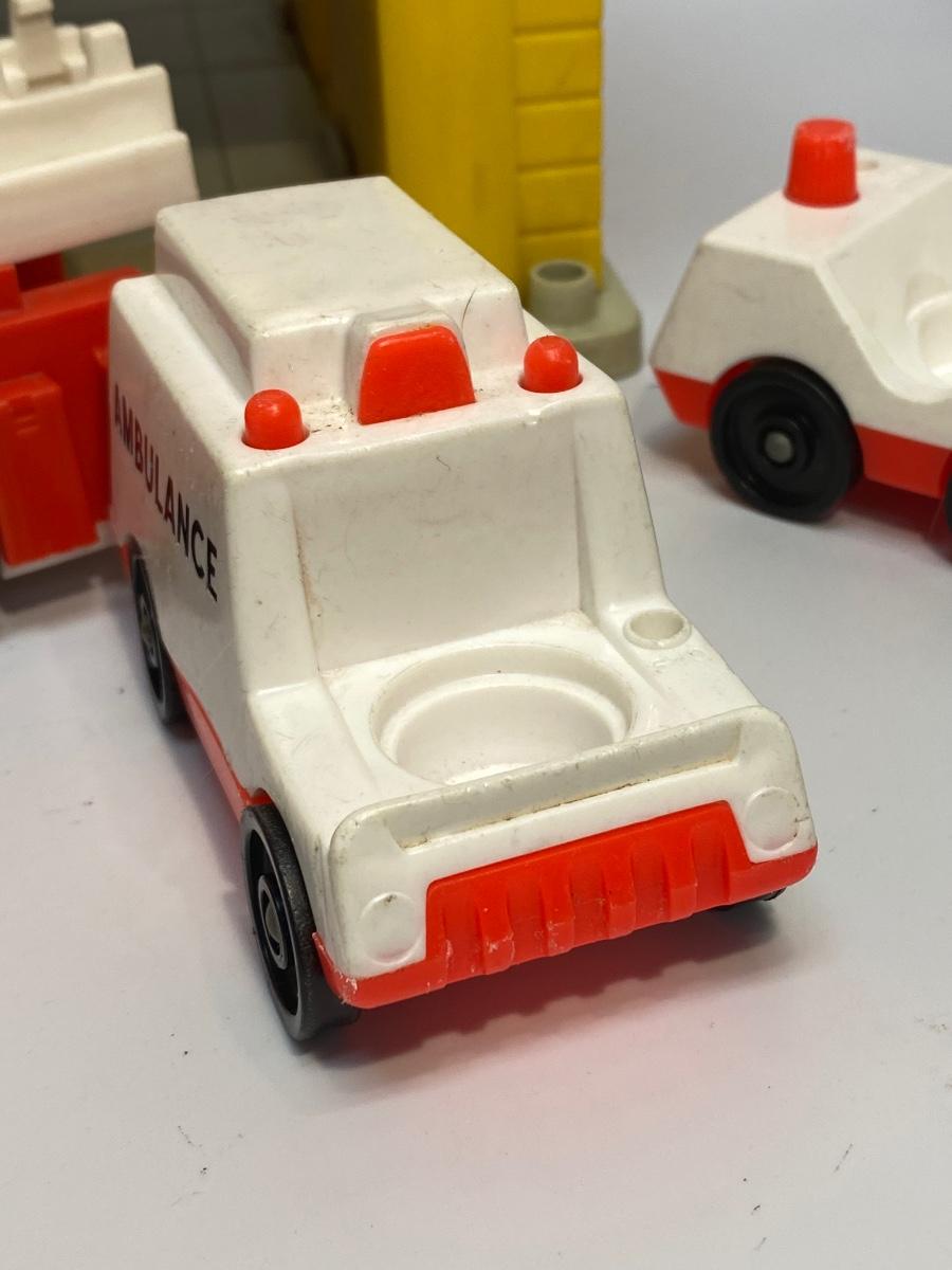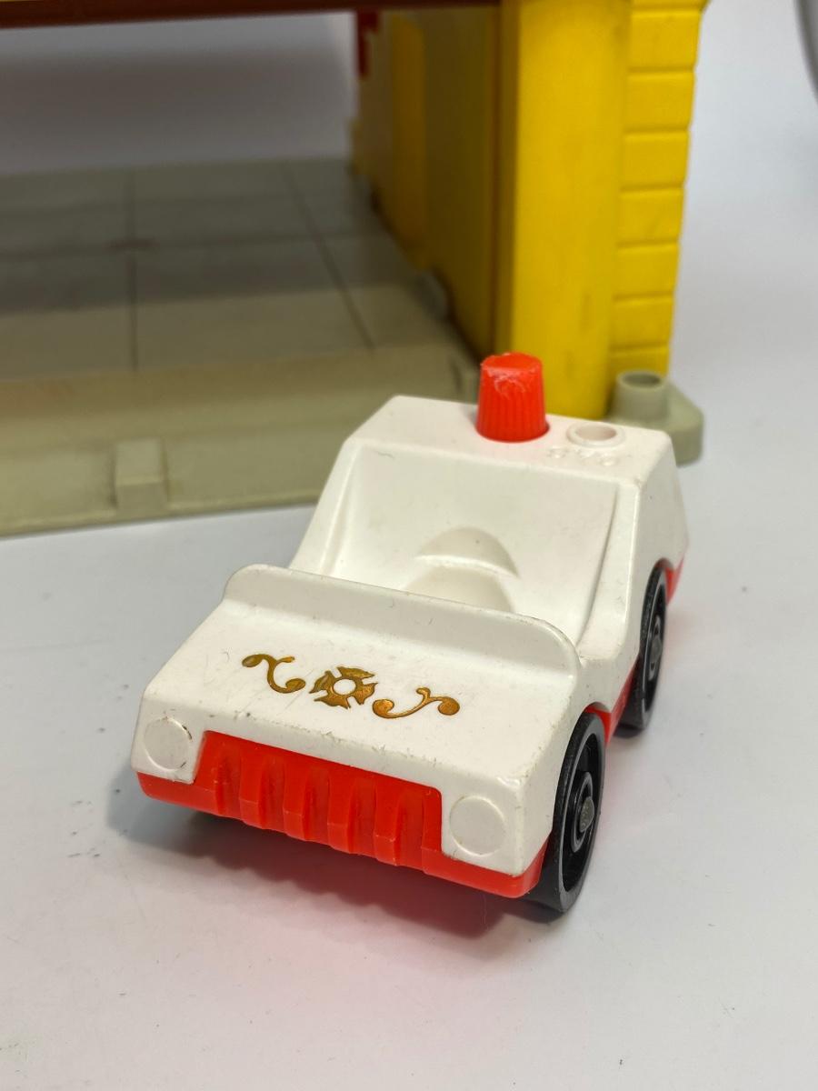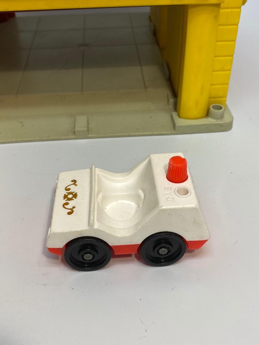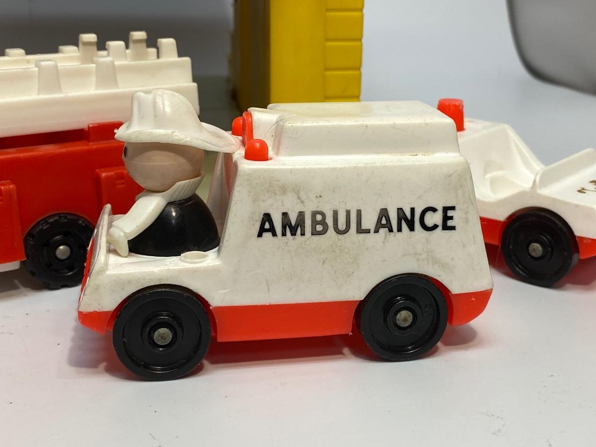 Vintage early 1980s Fisher Price Little People Play Family Fire Station #928. In good previously played with vintage condition. Play set includes the fire house, ladder truck, ambulance, fire chief's car, 3 yellow long ladders, 2 firemen with white hats, and dalmatian dog with red collar. Set is not complete. See photos for better idea of condition and any wear.