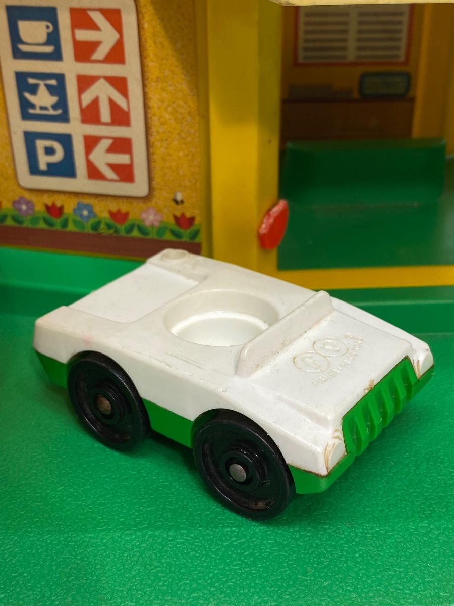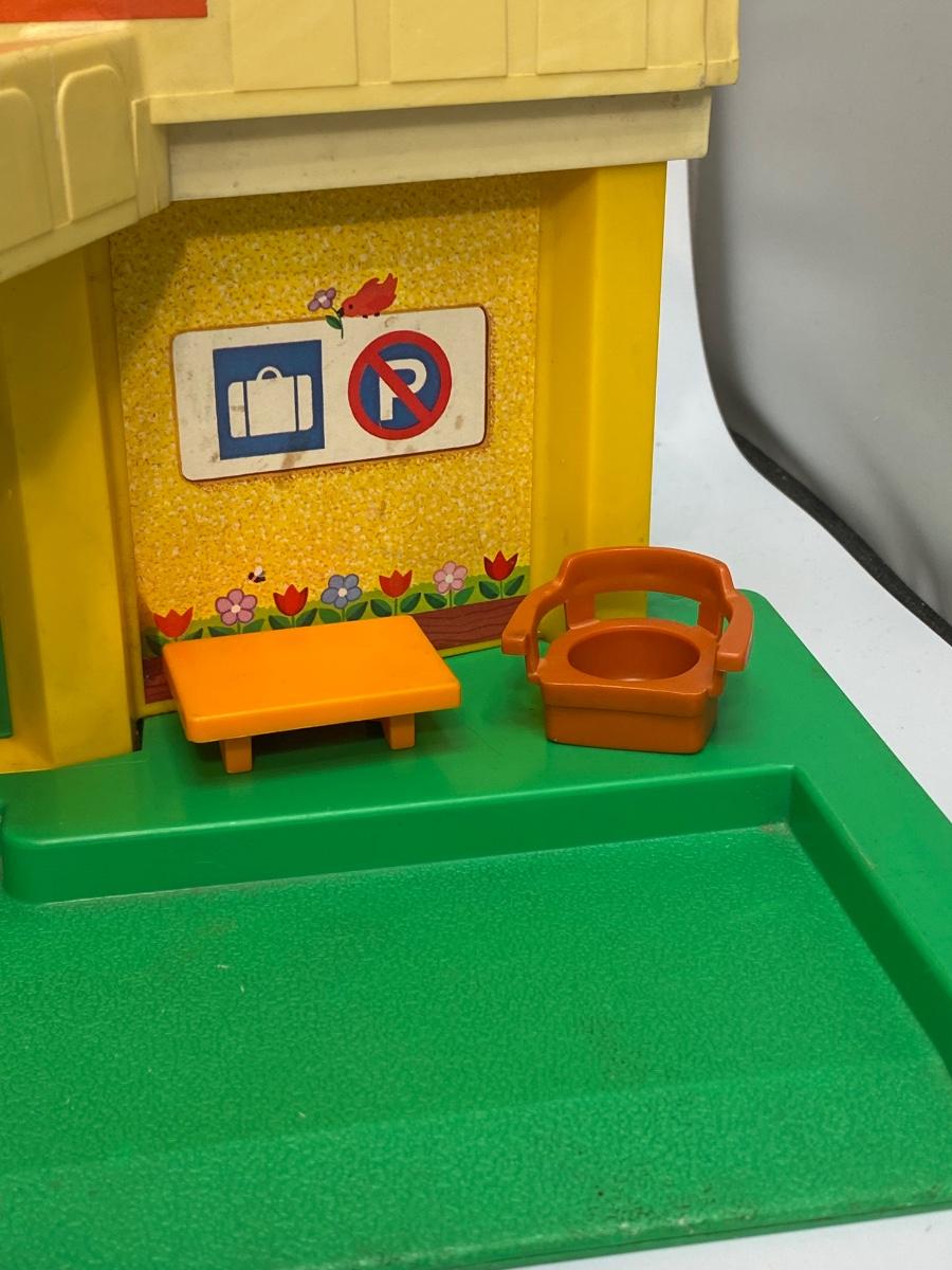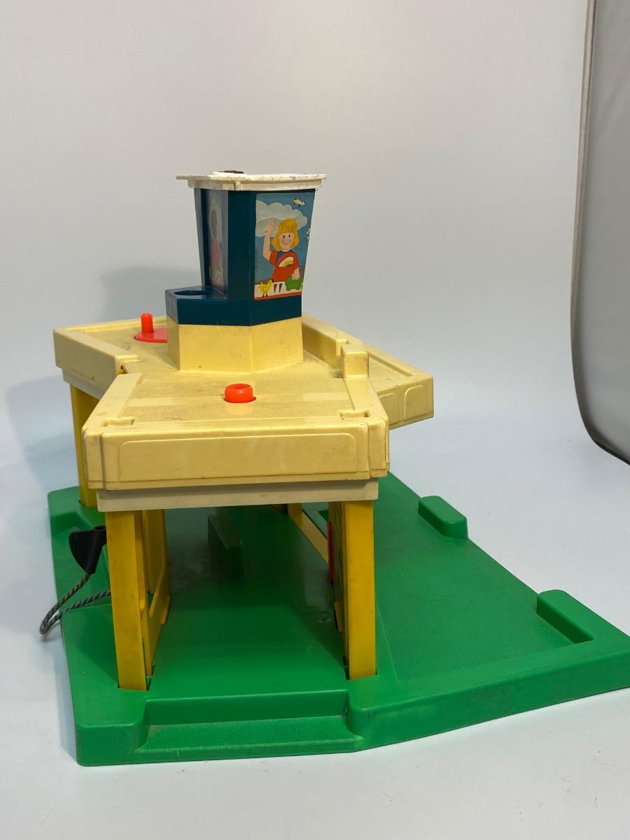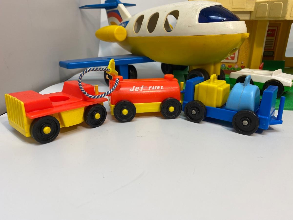 Vintage Fisher Price Little People Jetport play set #933. Different variations in pieces, not a complete set. In good played with vintage condition. There are signs of age and wear. Included in the set is the airport base building (sonar antenna is broken off the top), blue wing airplane (worn stickers), helicopter, 3-piece luggage/fuel tram, 2 pieces of luggage, green and white car, green pilot, 1 captain's chair, 1 coffee table, green dad with molded hair, blue mom with fancy eyes, yellow boy w brown hair, and blue girl with brown hair.