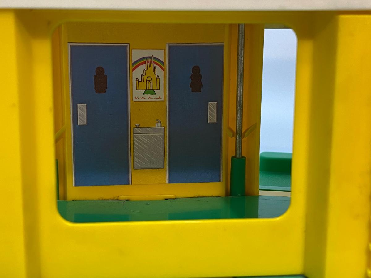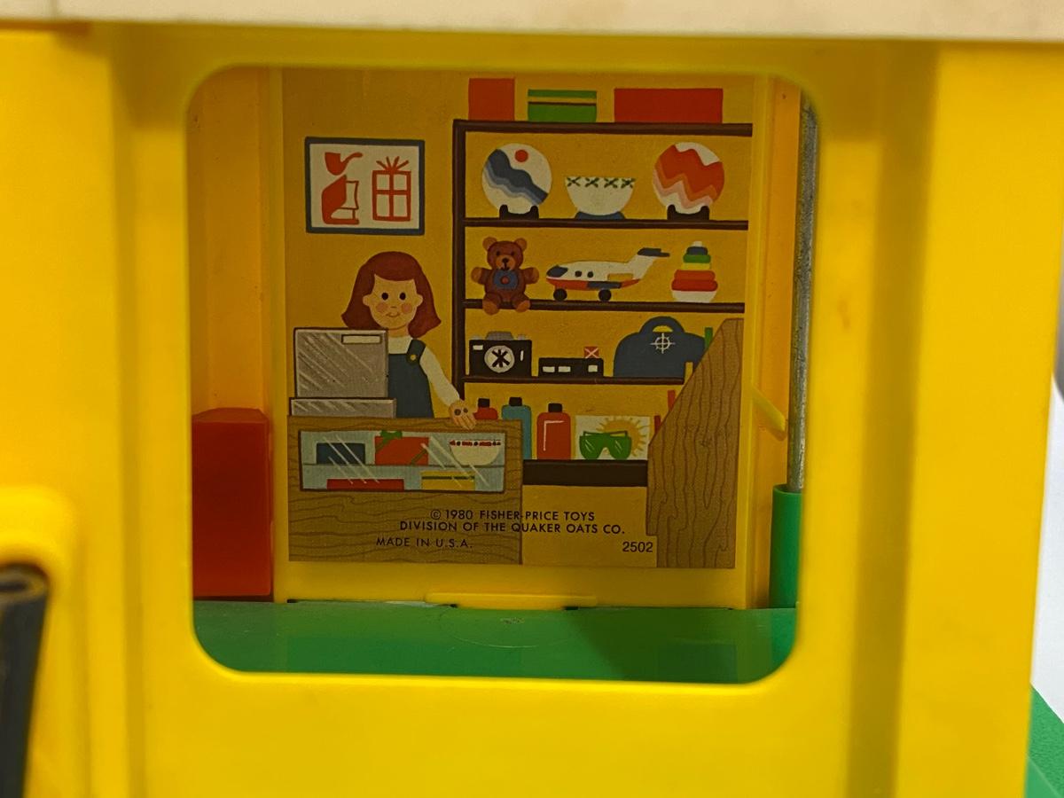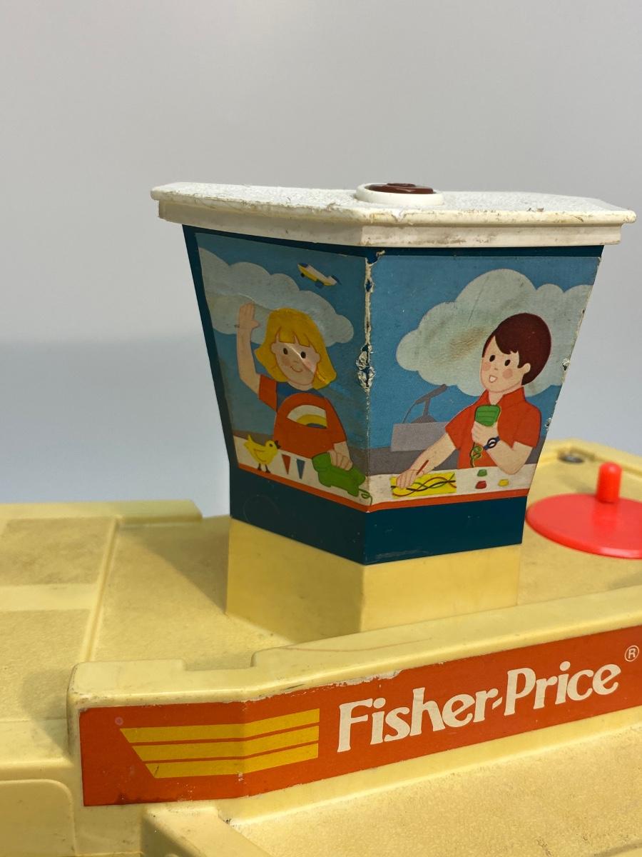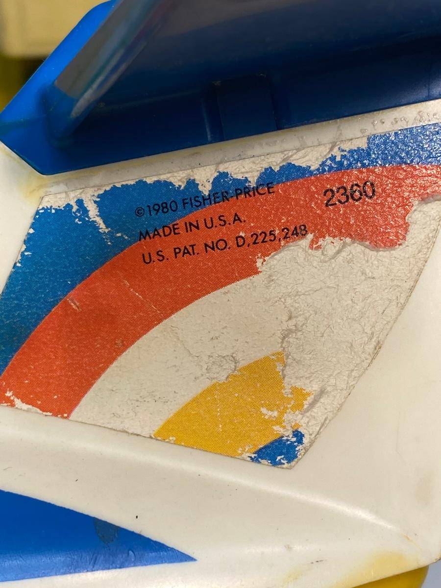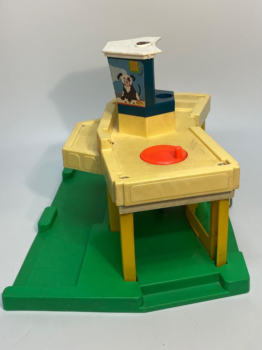 Vintage Fisher Price Little People Jetport play set #933. Different variations in pieces, not a complete set. In good played with vintage condition. There are signs of age and wear. Included in the set is the airport base building (sonar antenna is broken off the top), blue wing airplane (worn stickers), helicopter, 3-piece luggage/fuel tram, 2 pieces of luggage, green and white car, green pilot, 1 captain's chair, 1 coffee table, green dad with molded hair, blue mom with fancy eyes, yellow boy w brown hair, and blue girl with brown hair.