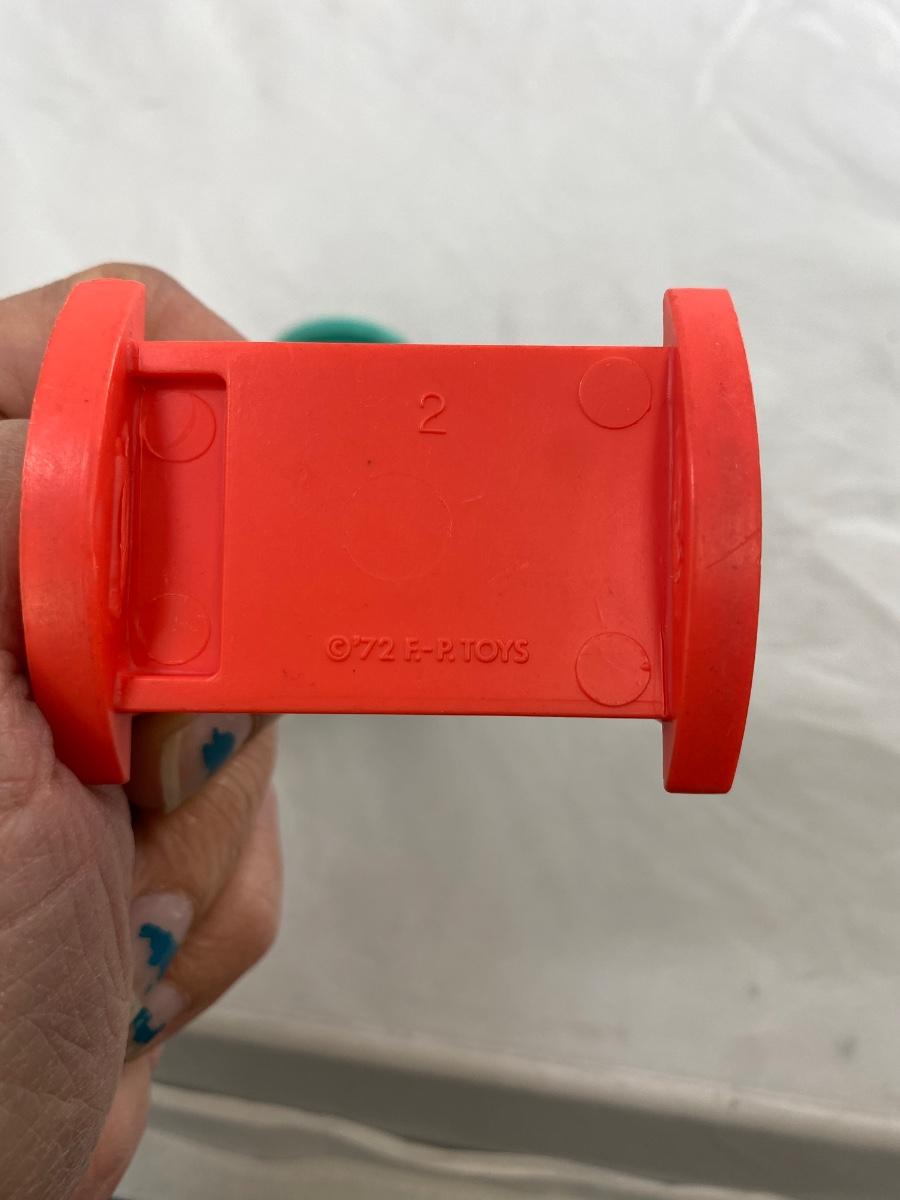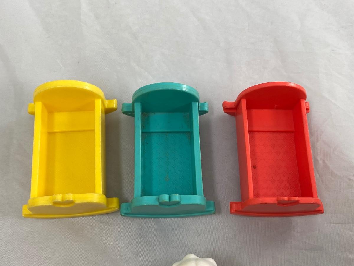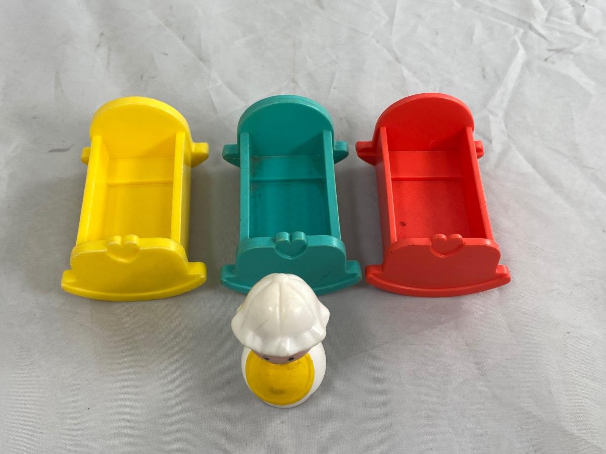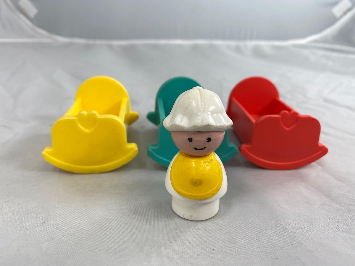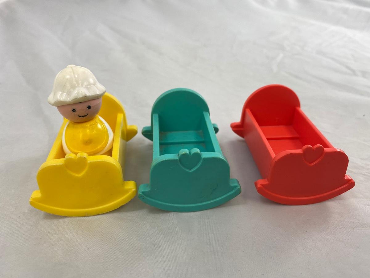 Vintage Fisher Price Little People accessory lot. Set of three cradles and a baby. Baby is wearing a bonnet and yellow bib. Some light wear from play and age. Cradles are dated 1972 on the bottom.