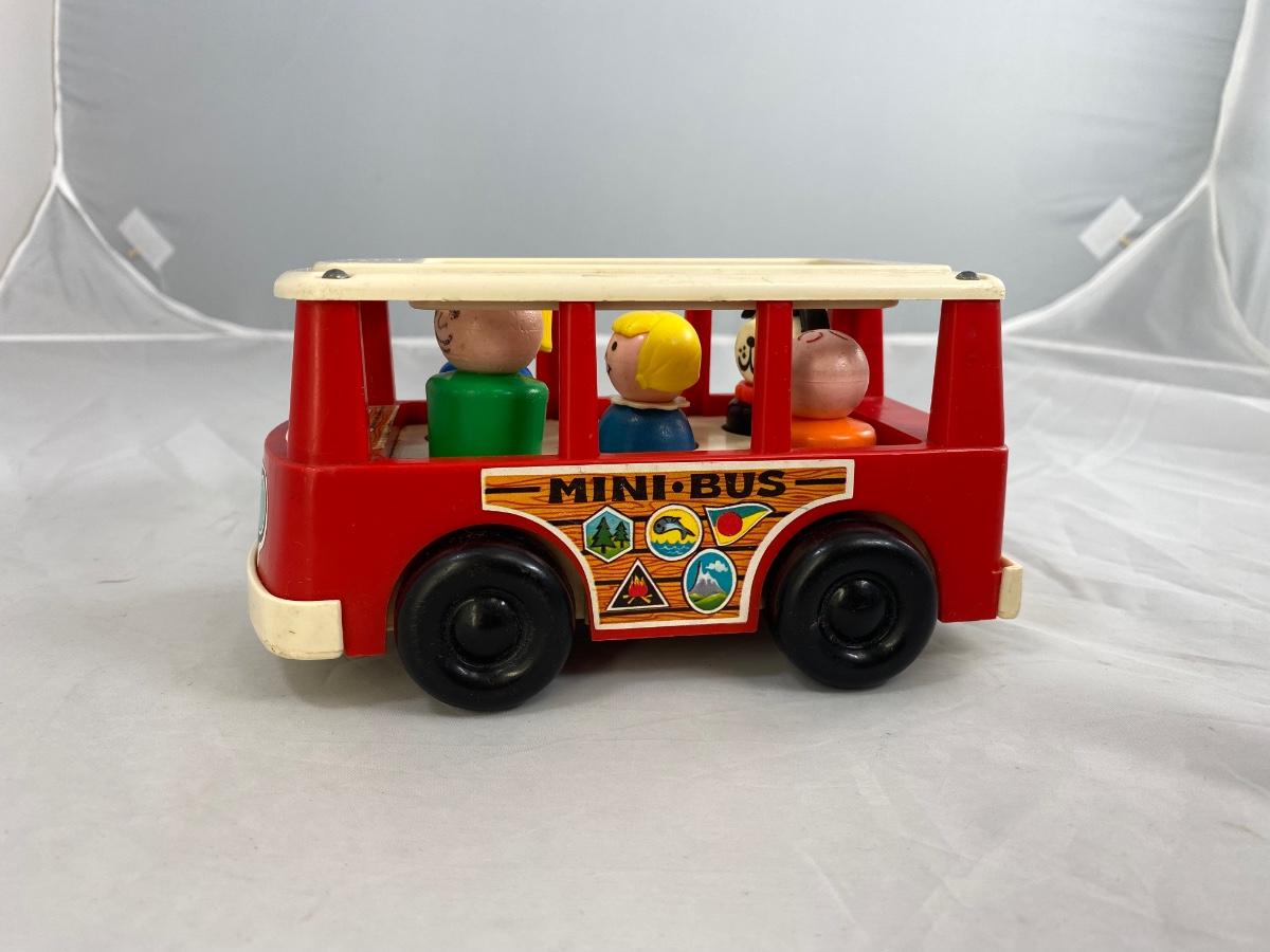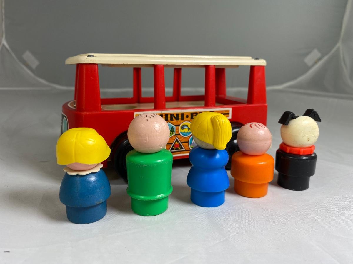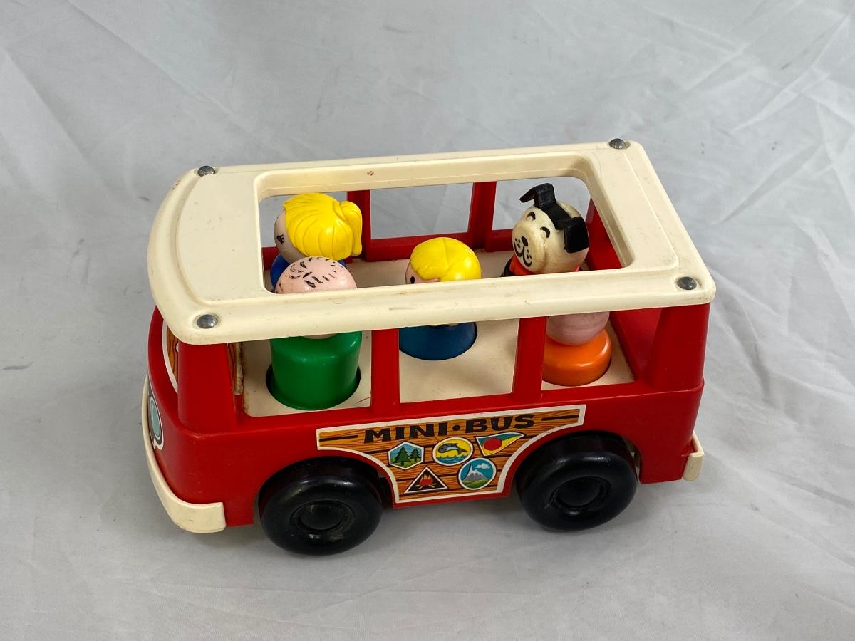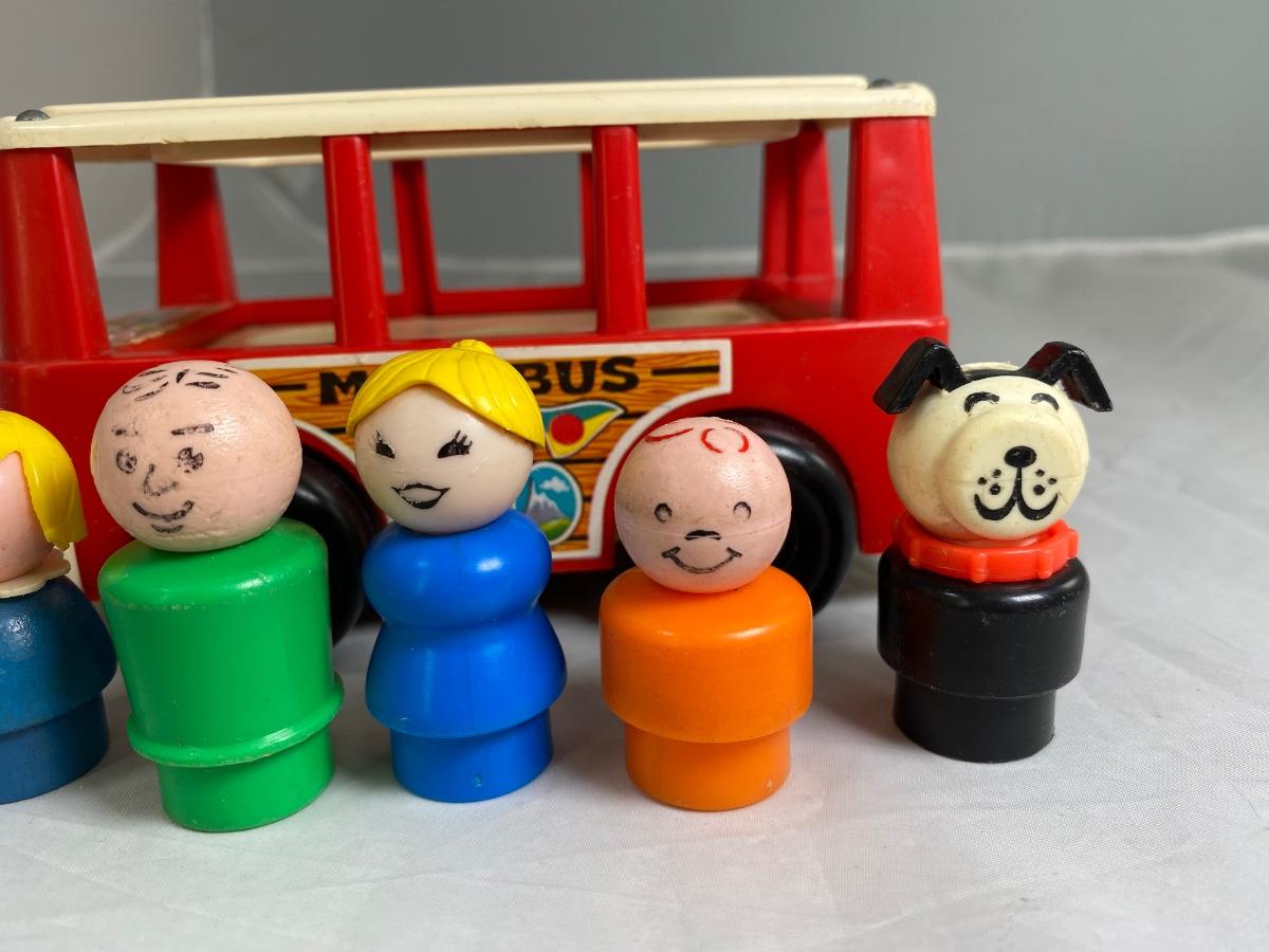 Vintage Fisher Price classic Mini Bus with family and dog. Included is mini bus, green dad, blue mom, blue sister, orange brother, and Black bog with red collar. There is wear from age and play.