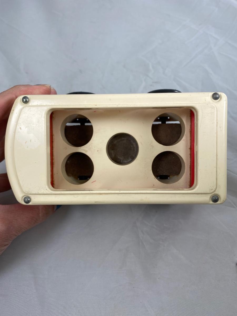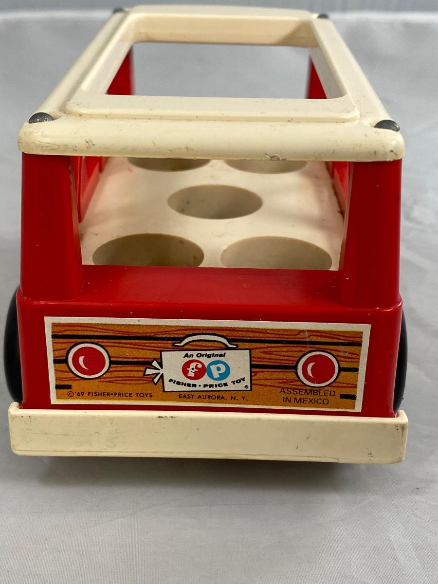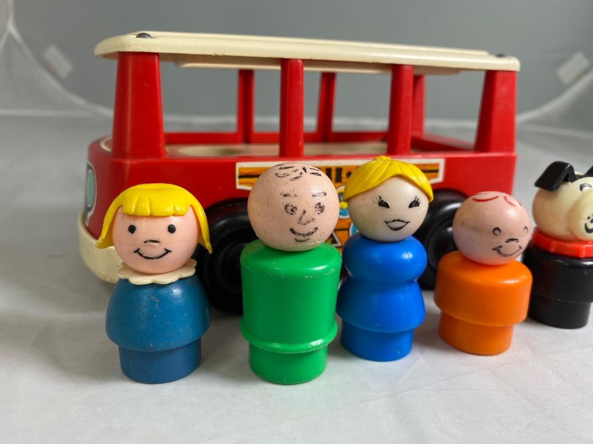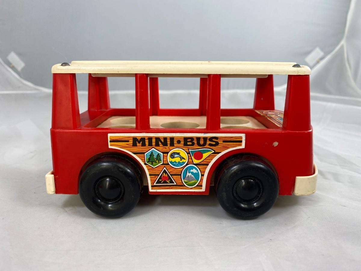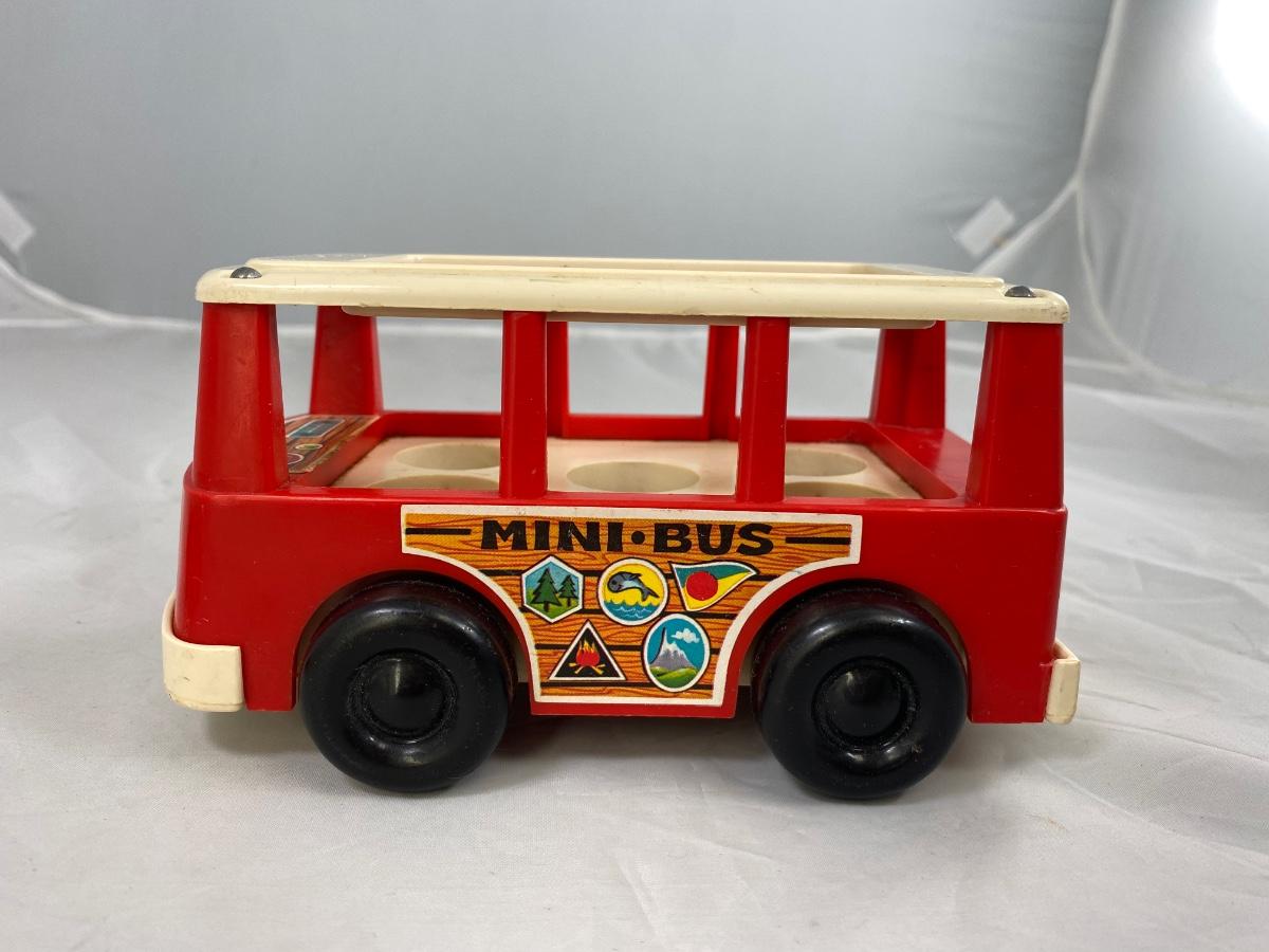 Vintage Fisher Price classic Mini Bus with family and dog. Included is mini bus, green dad, blue mom, blue sister, orange brother, and Black bog with red collar. There is wear from age and play.