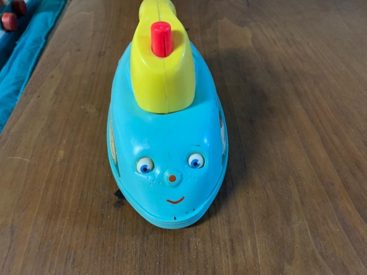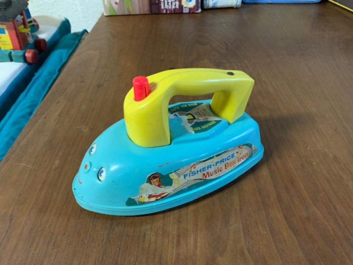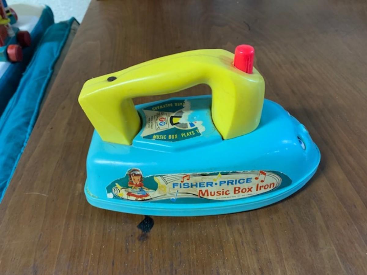 Vintage fisher price music box iron - make noise when wheeled and eyes move. It is old and is being sold as is.