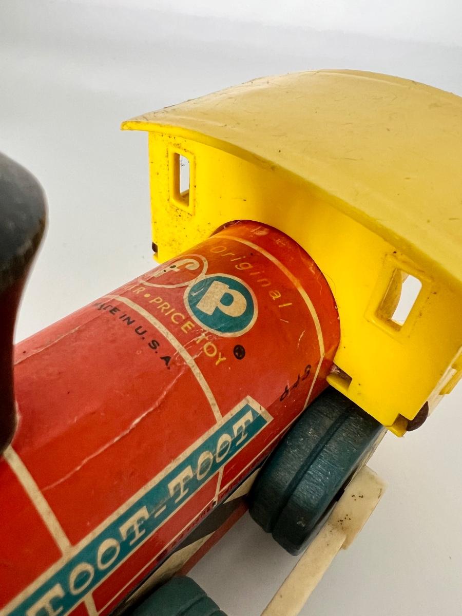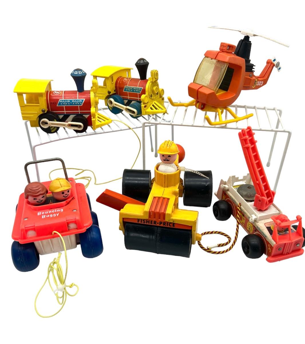 Exciting vintage lot of Fisher-Price toys. lot includes vintage steam roller construction vehicle with blade, 66 fire truck with wooden bottom. helicopter number 323 bouncing buggy truck, and two 2643 Toot Toot trains. All toys measure between largest 5 1/2 inches tall 8 inches deep and the smallest measuring 4 inches tall by 6 inches deep. These toys have been played with and loved. Please see pictures for condition.