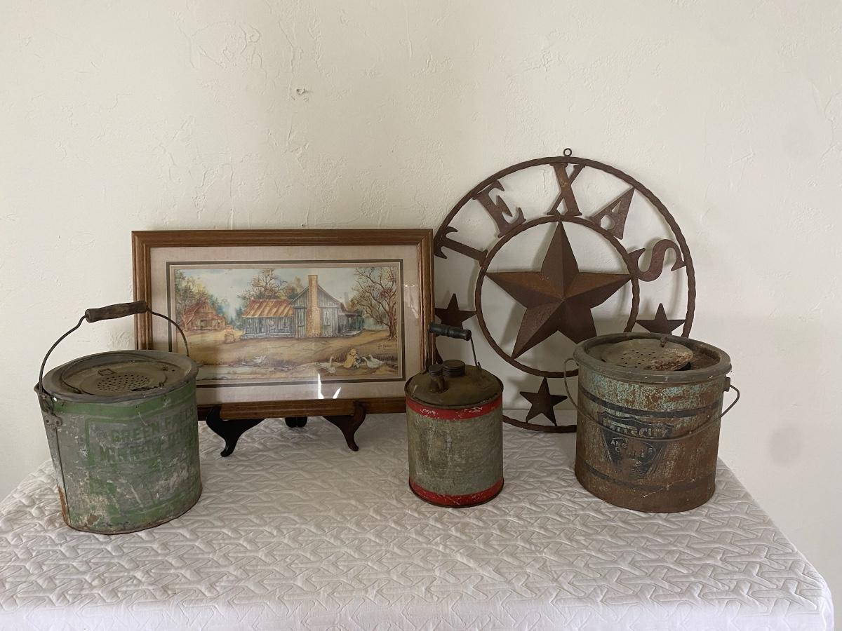 2 minnow buckets - gas can - Metal Texas Star - Farmhouse pic