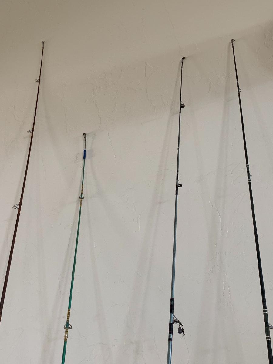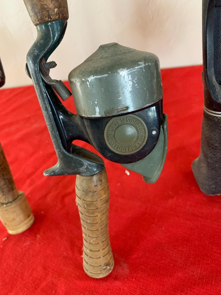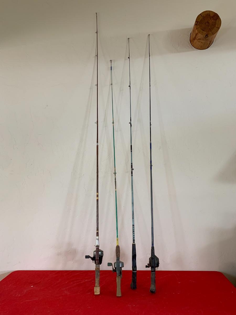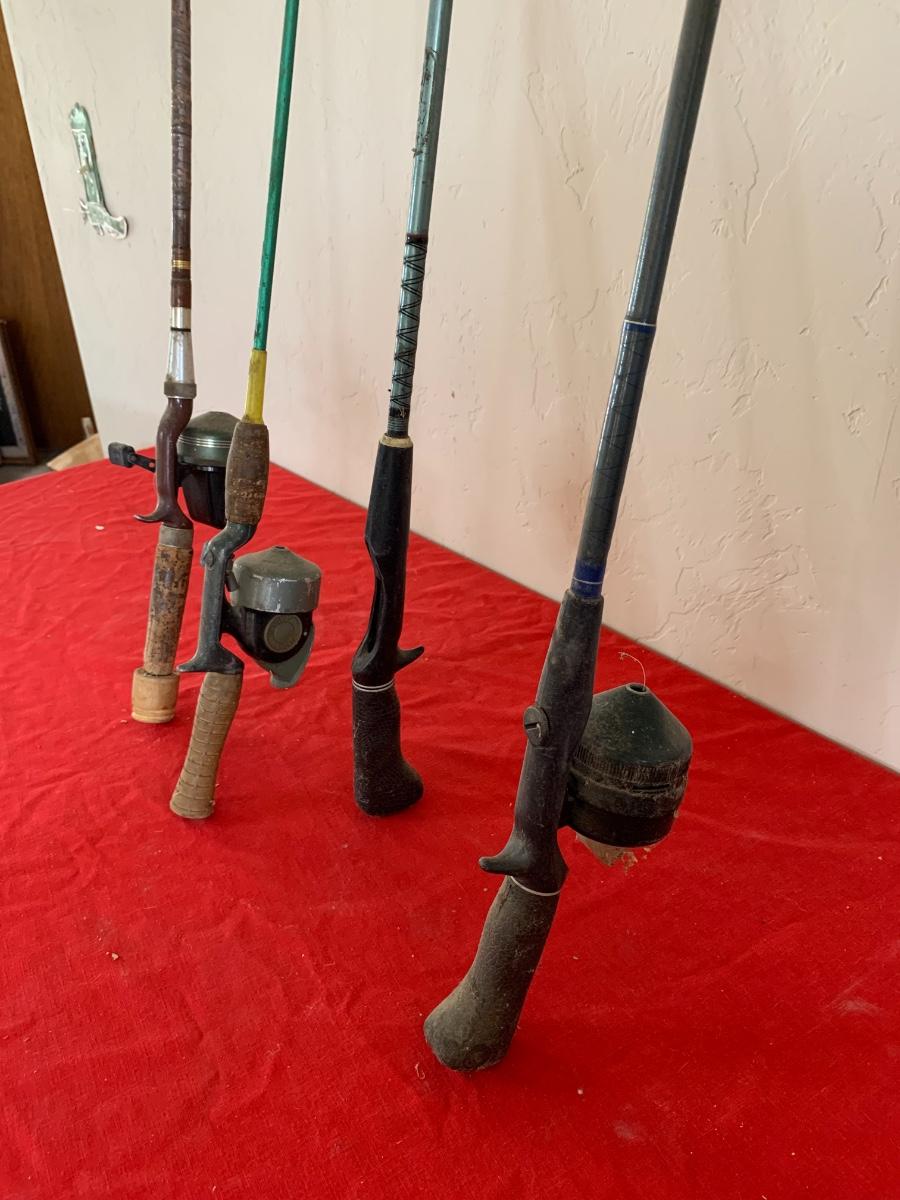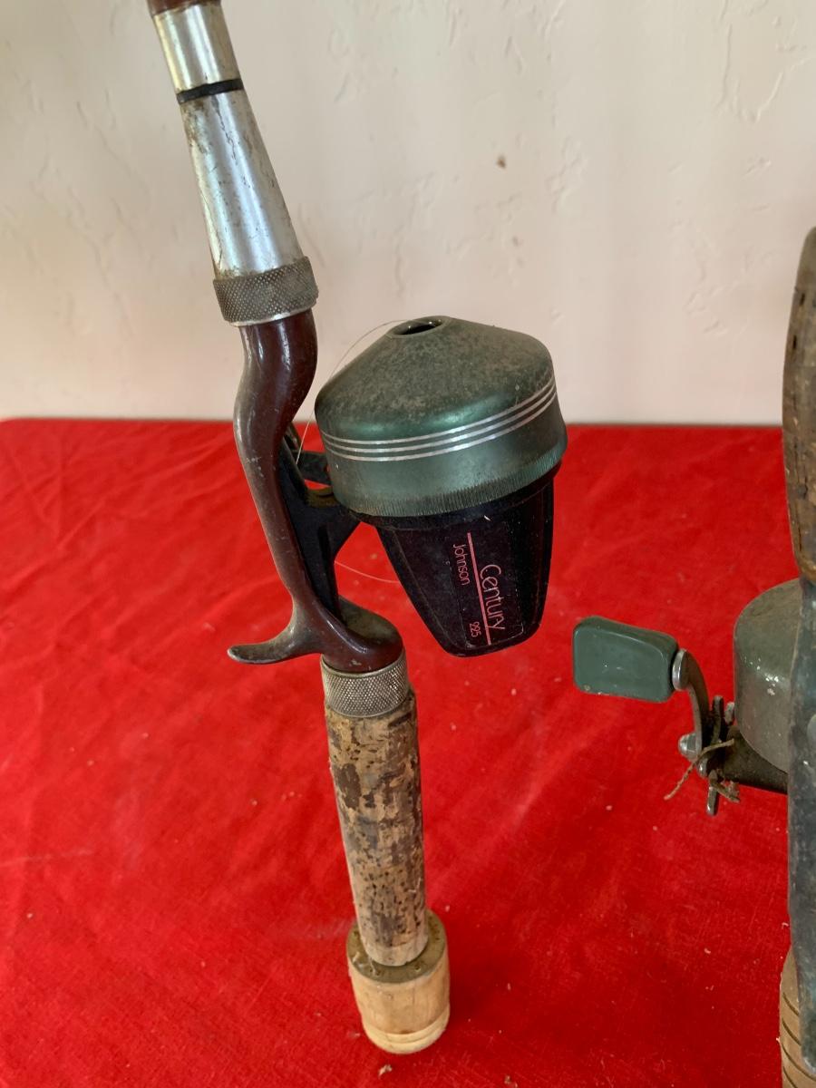 Lot includes 4 vintage fishing poles -one is marked Century Johnson 225. All in used condition, need clean and maintenance.