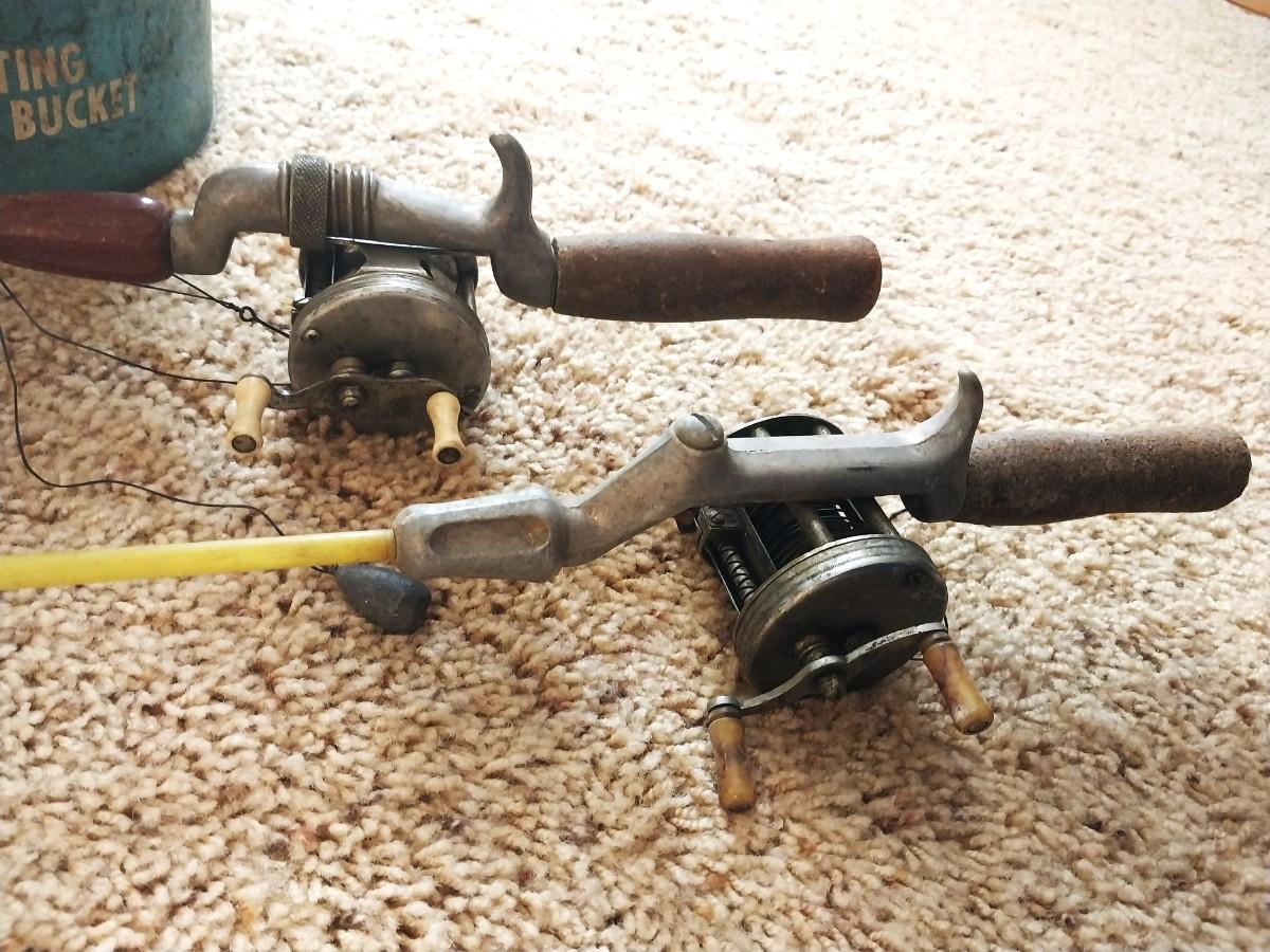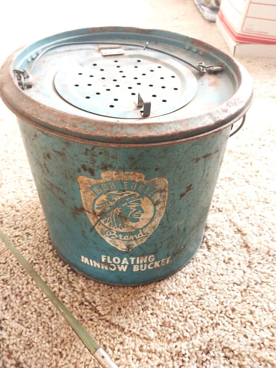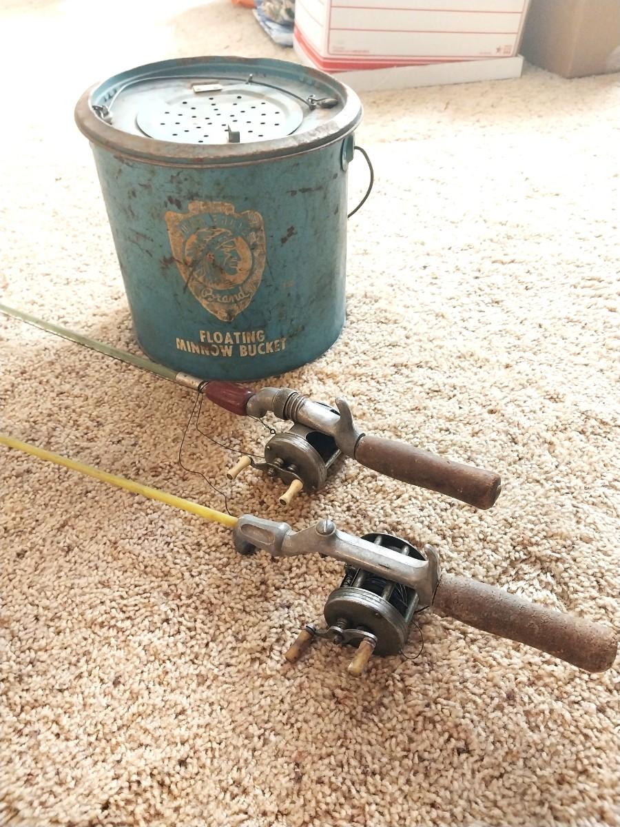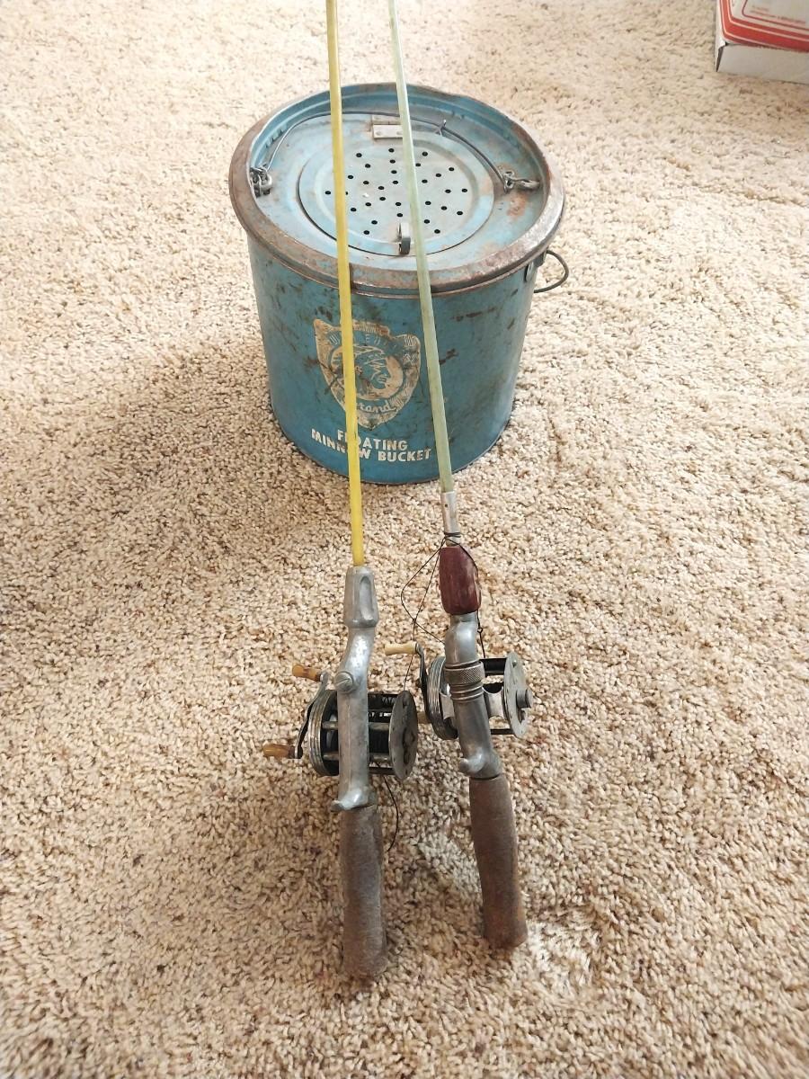 VINTAGE FISHING POLES AND FLOATING MINNOW BUCKET