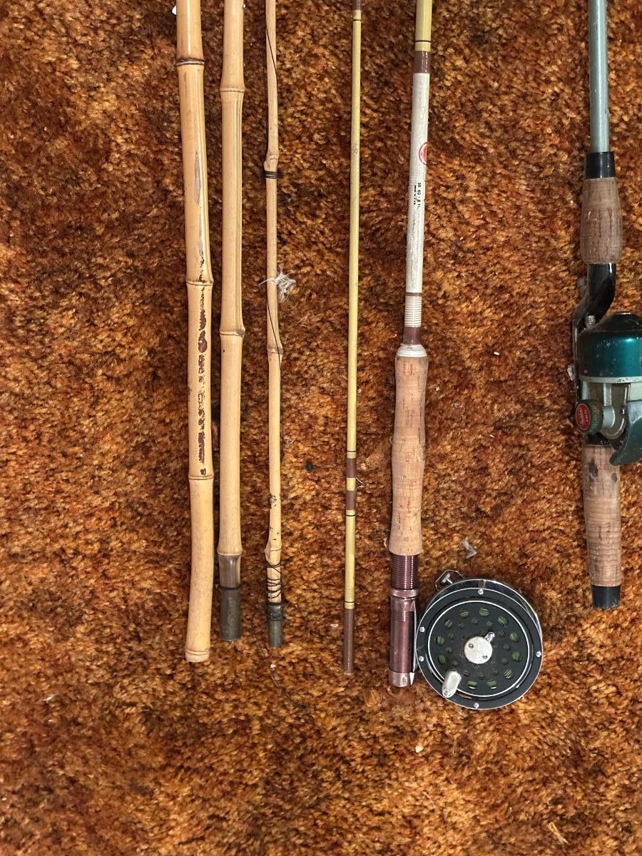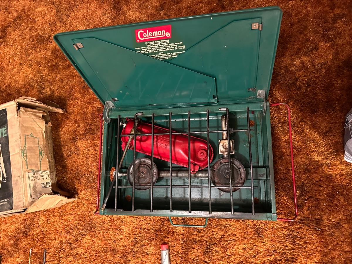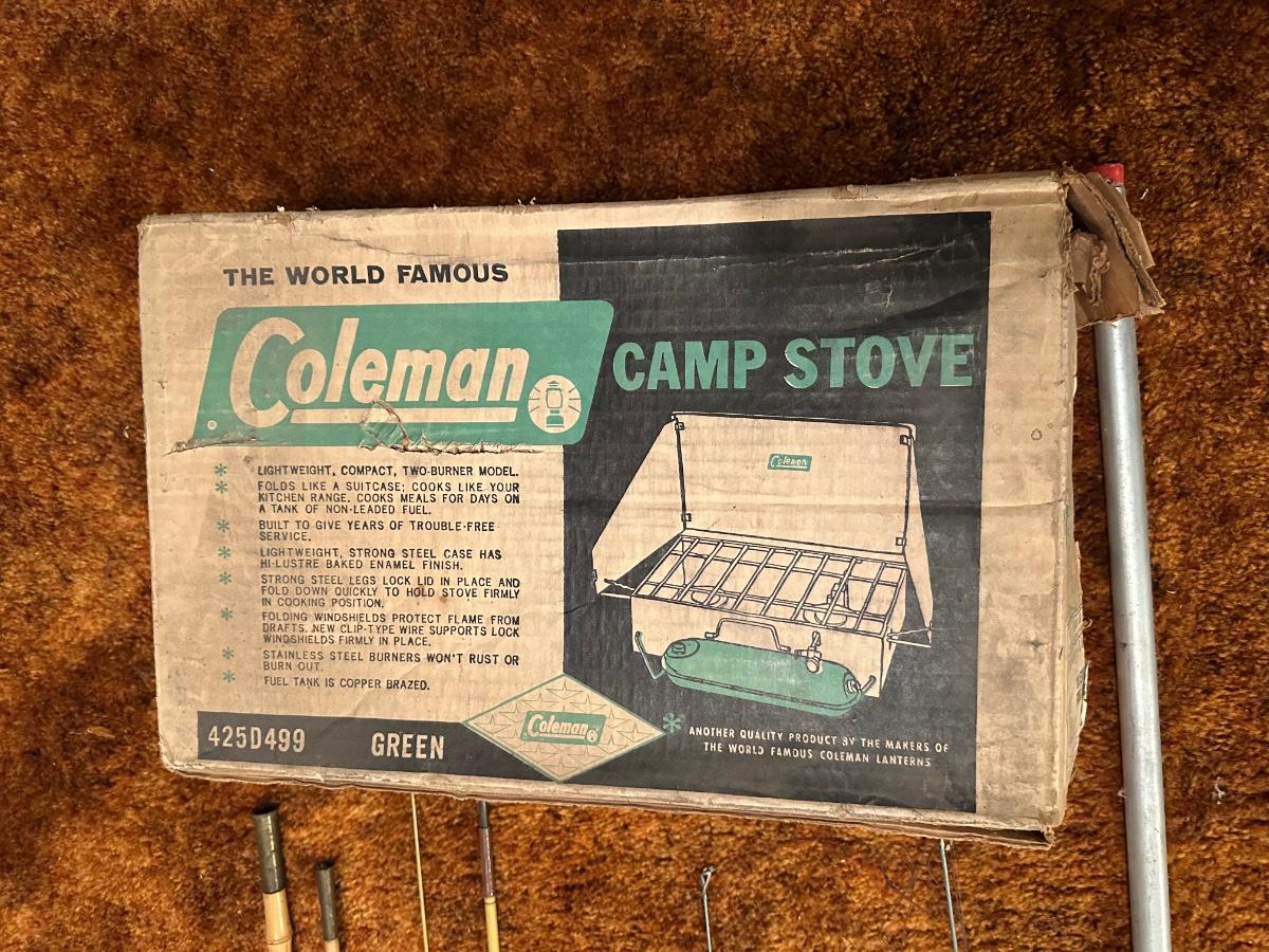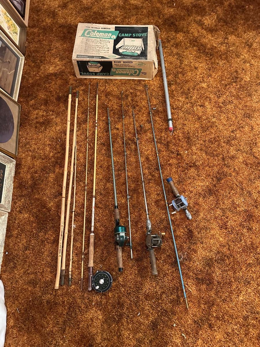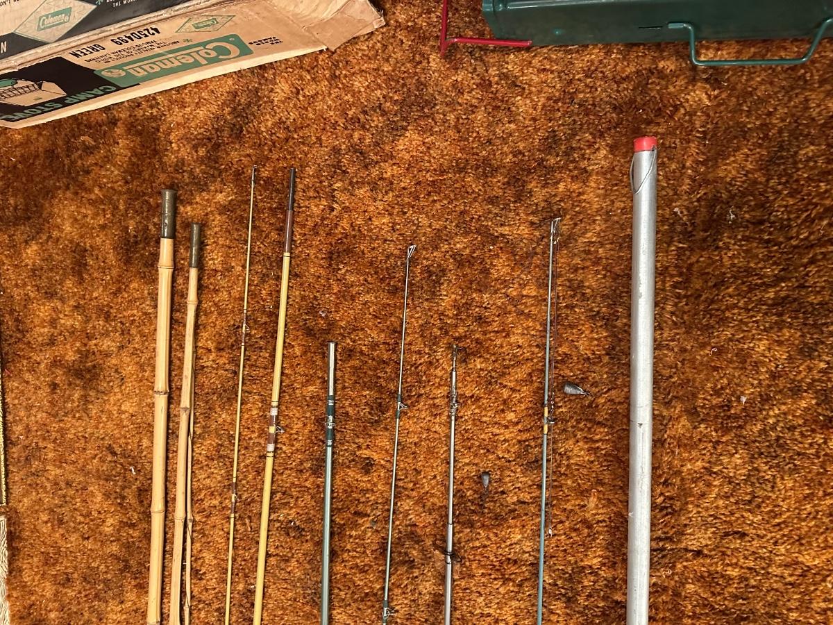 VINTAGE FISHING RODS AND COLEMAN CAMP STOVE