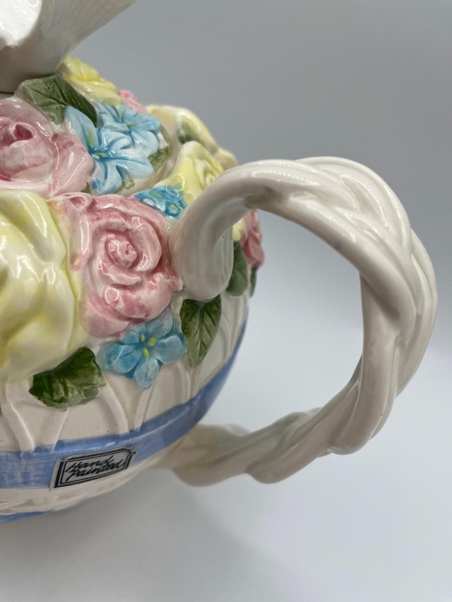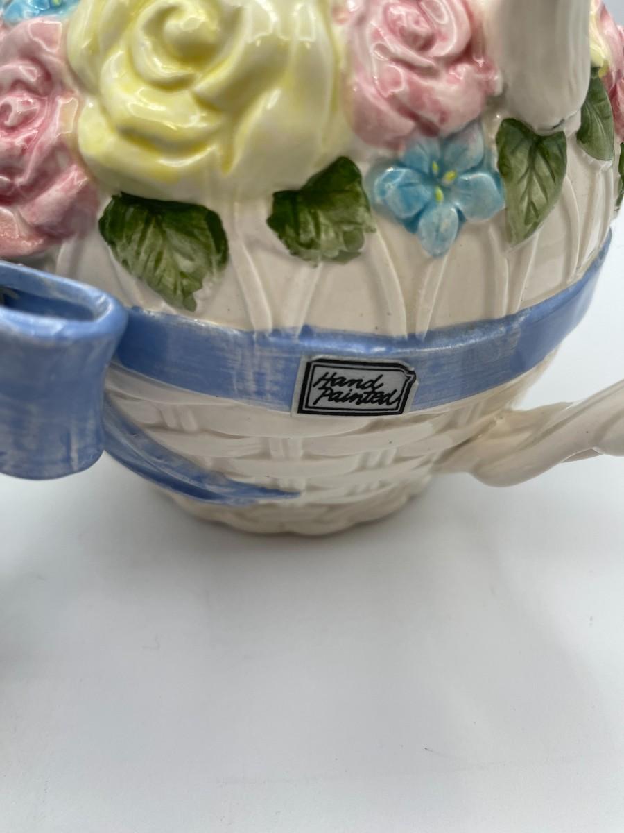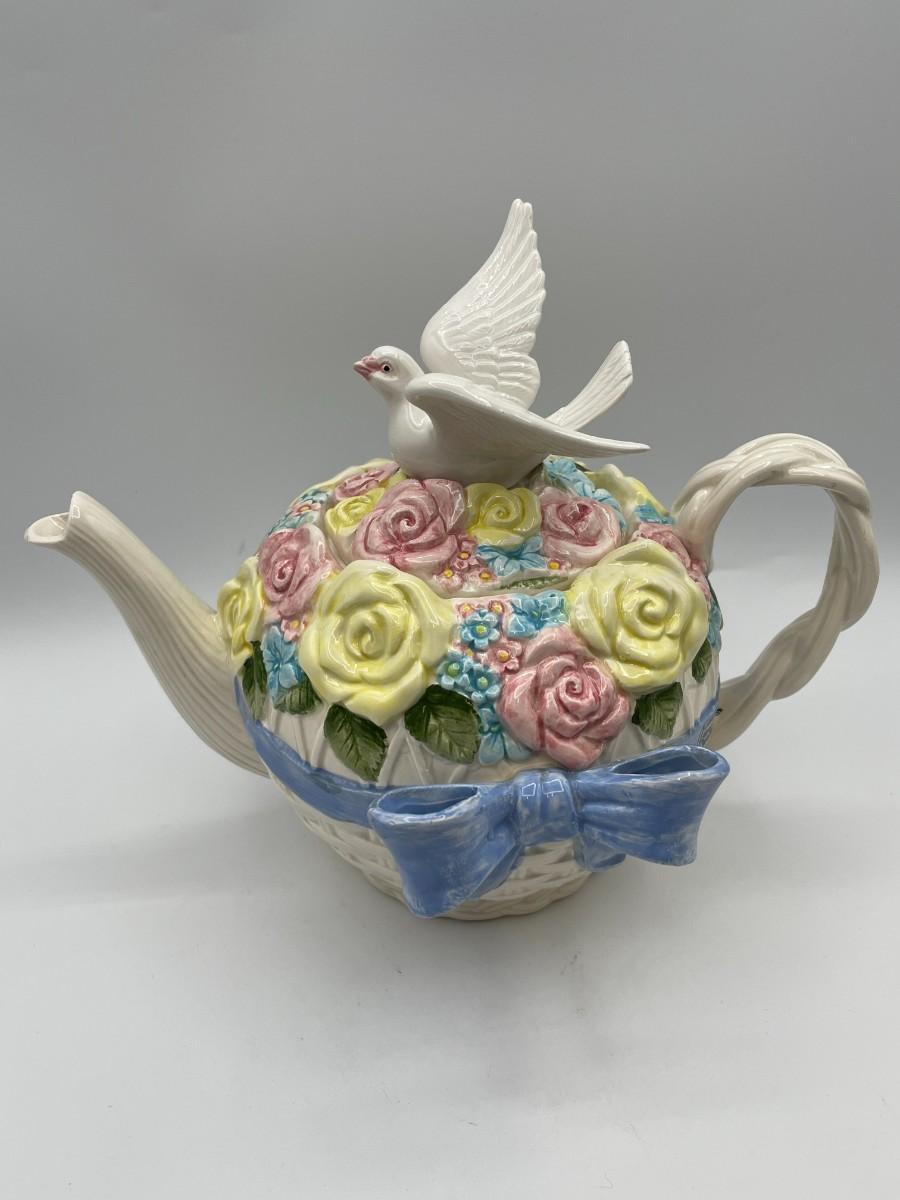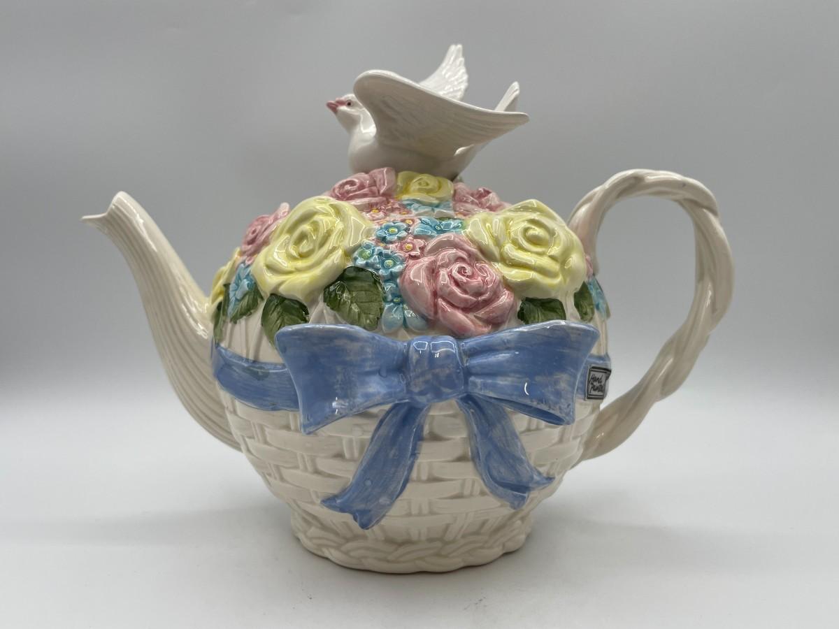 Smell the roses every time you pour a cup of tea from! Pastel, springtime ready vintage teapot from Fitz & Floyd. Hand painted, basket motif, floral embellishments, dove finial. 38 oz capacity, minor wear from loving use. # 734