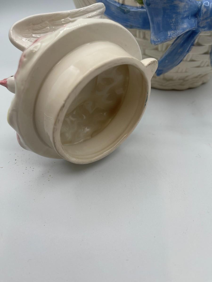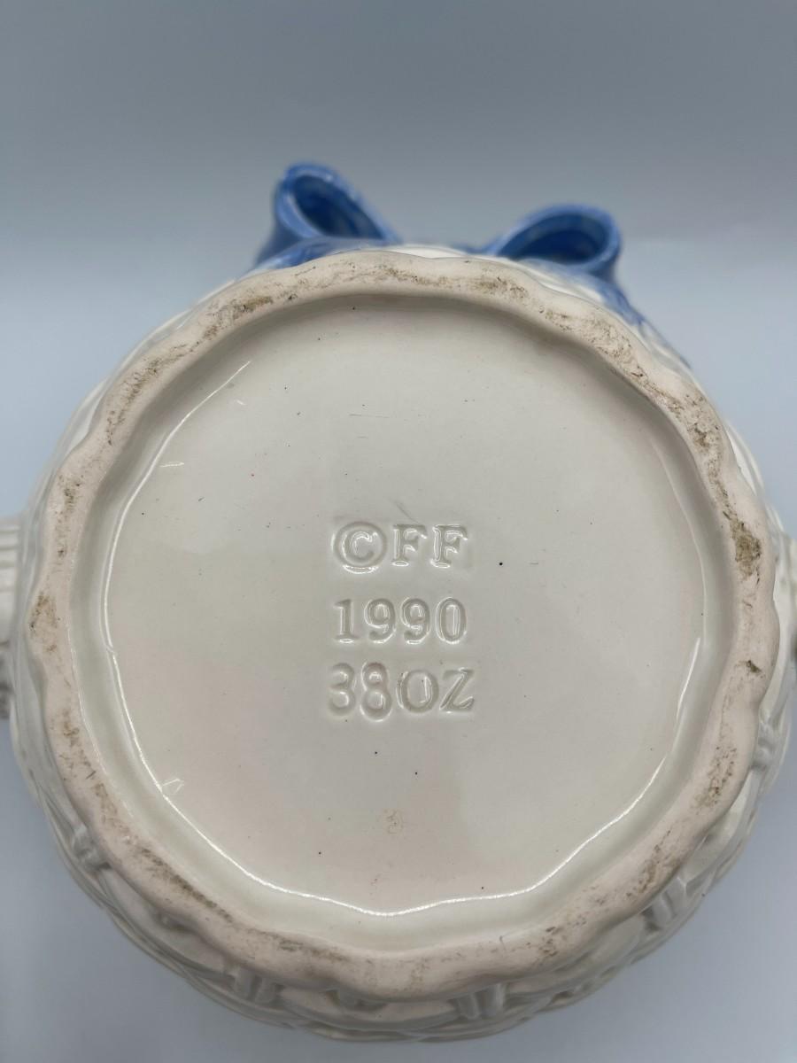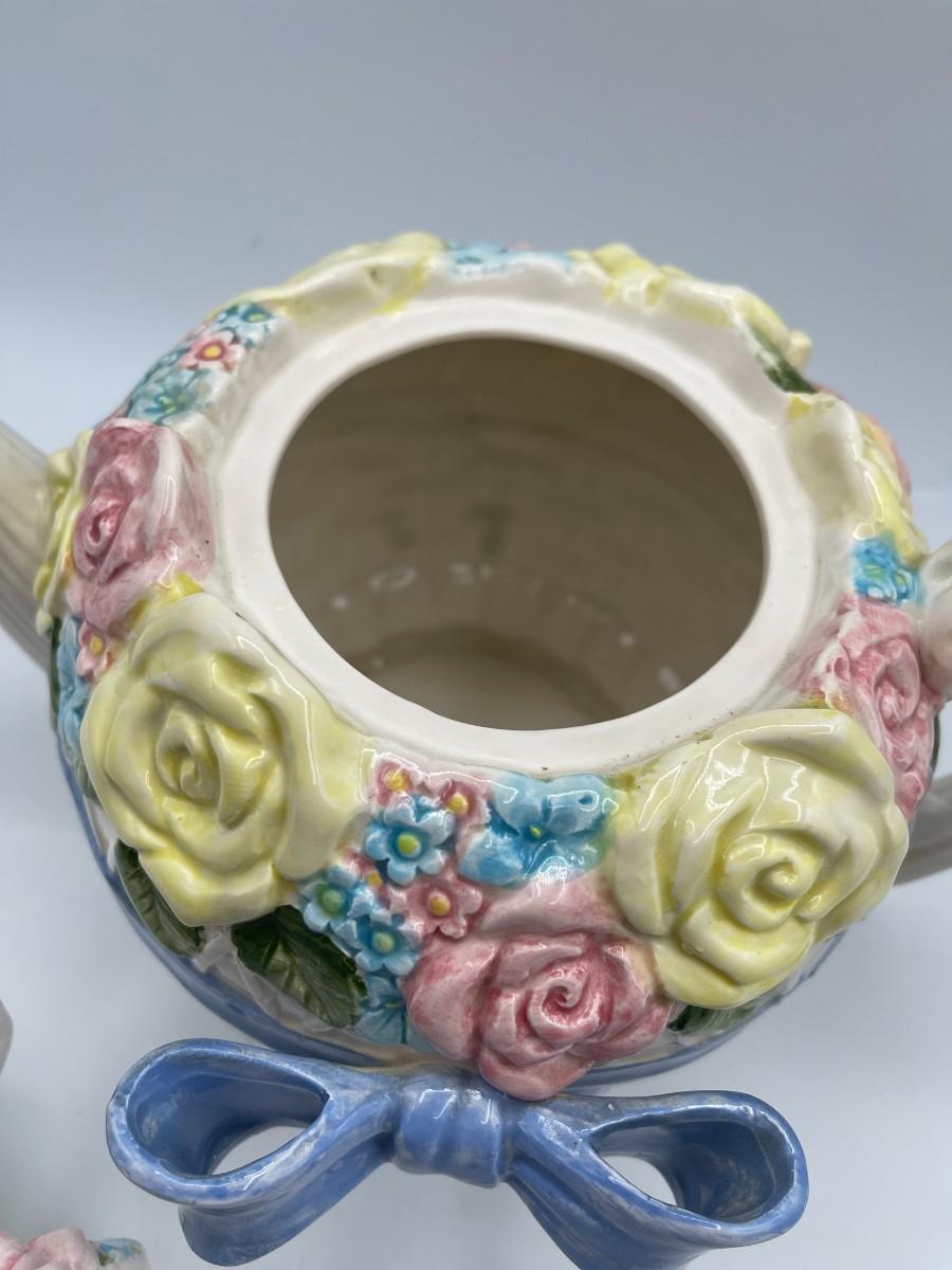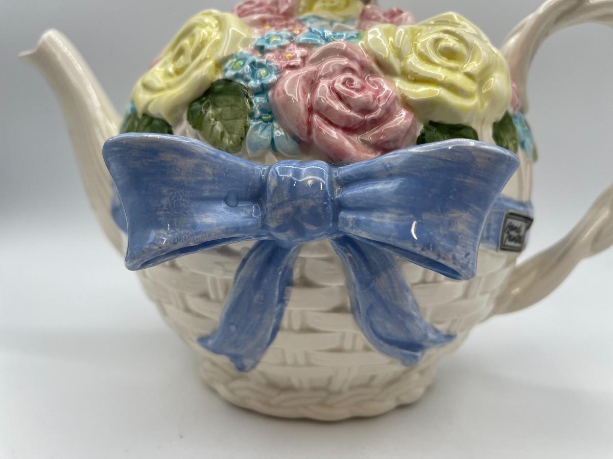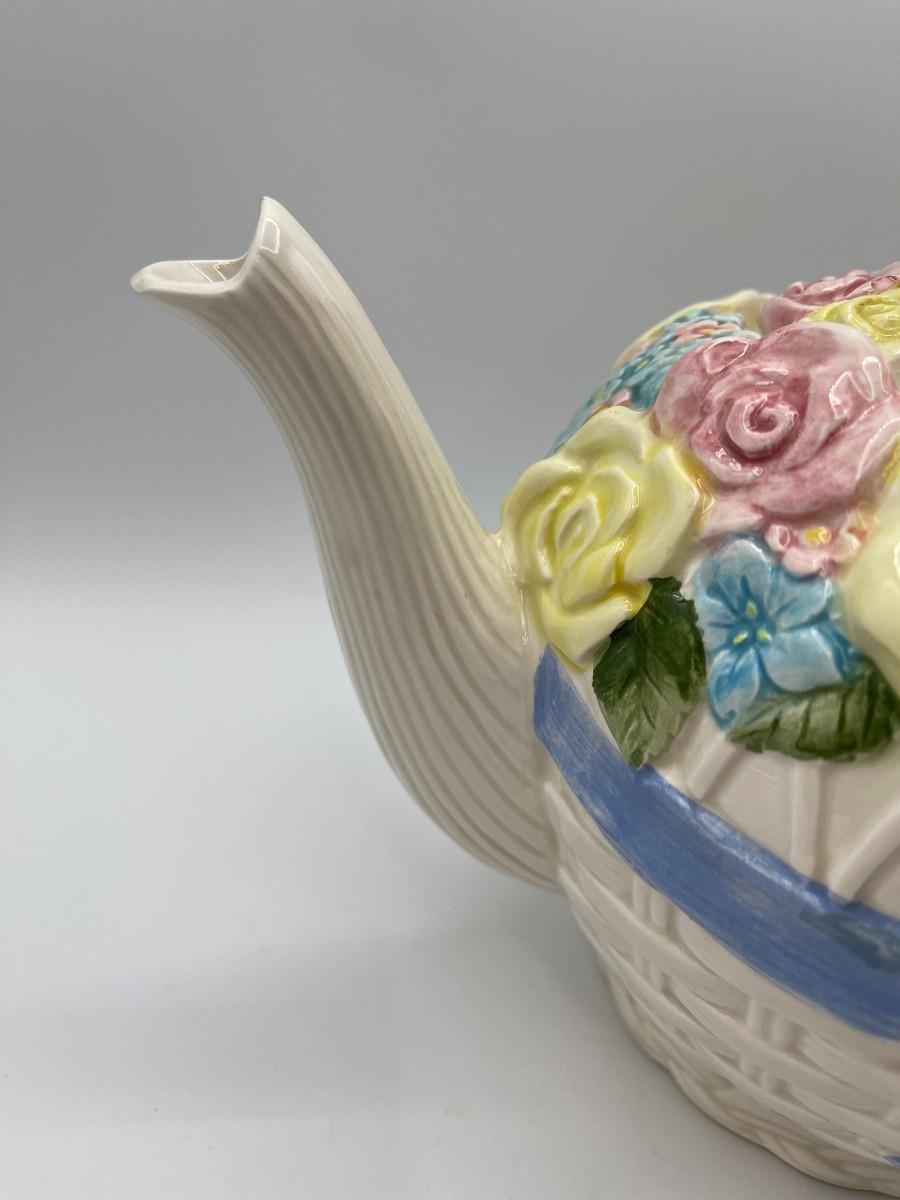 Smell the roses every time you pour a cup of tea from! Pastel, springtime ready vintage teapot from Fitz & Floyd. Hand painted, basket motif, floral embellishments, dove finial. 38 oz capacity, minor wear from loving use. # 734