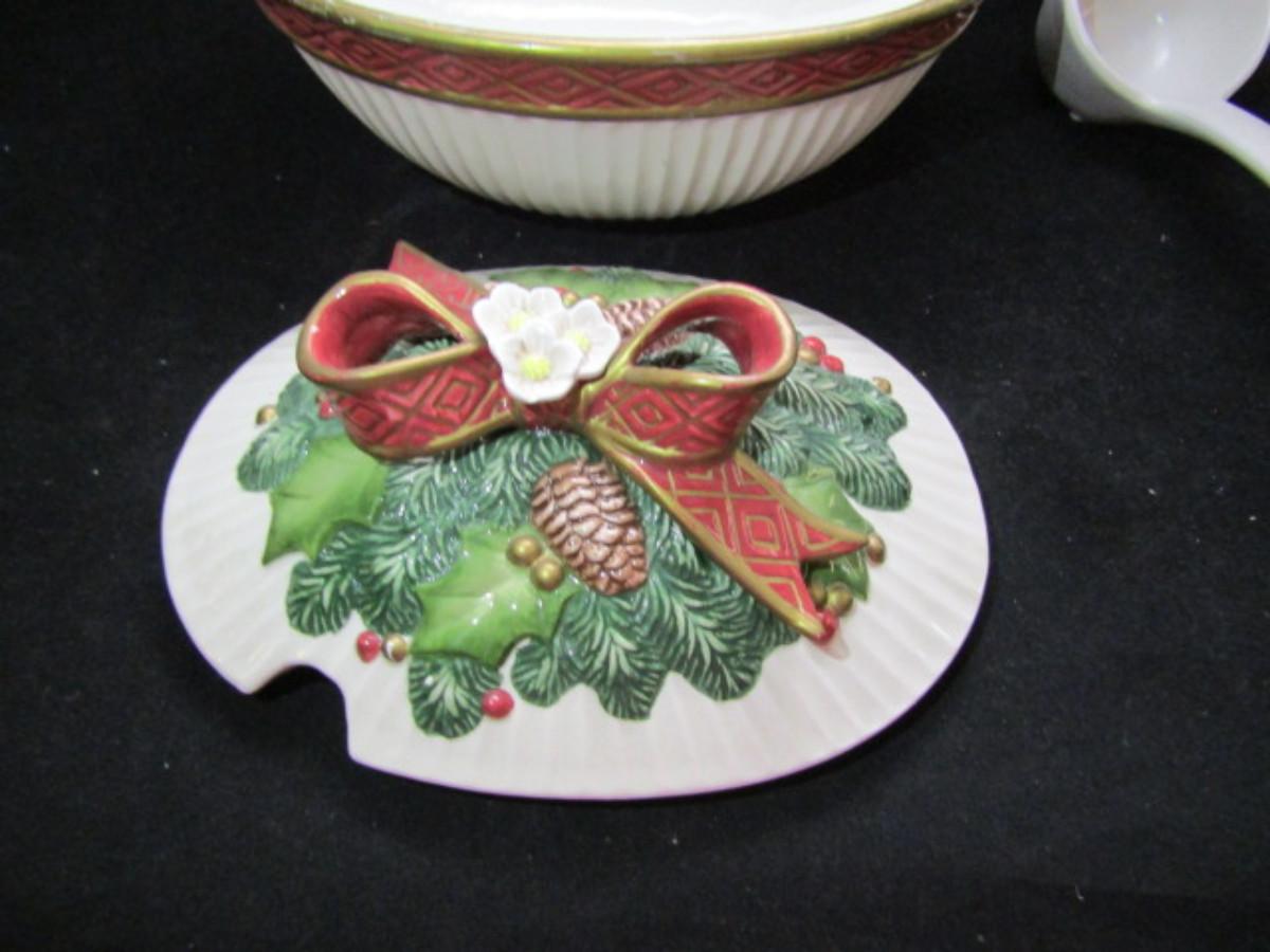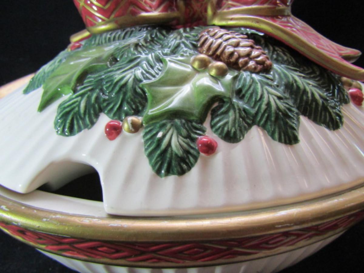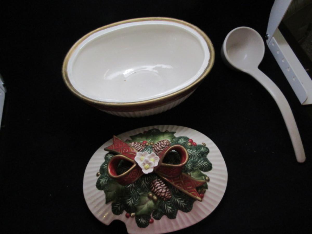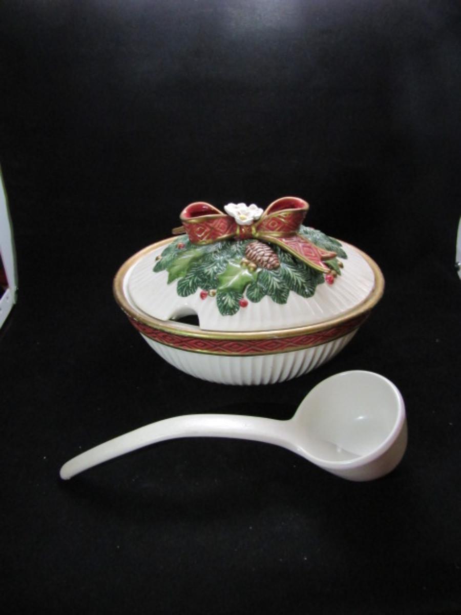 Vintage Fitz and Floyd Painted Ceramic Soup Tureen with Ladle- Greenery and Bow Design (#347)