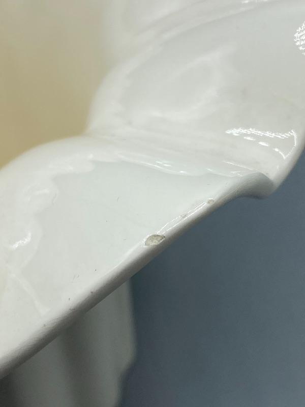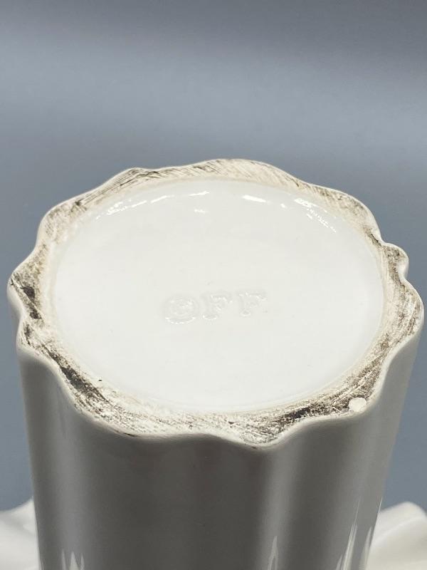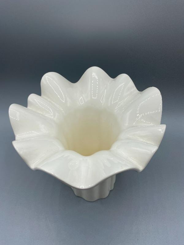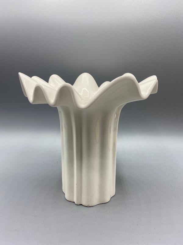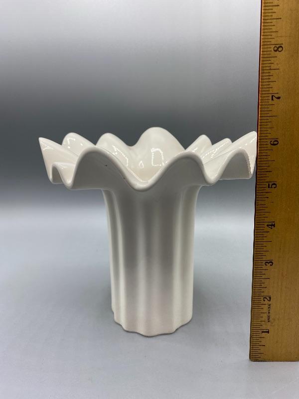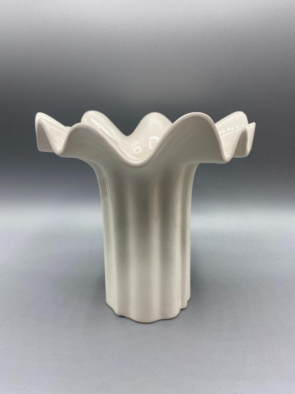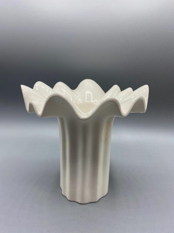 Vintage Fitz and Floyd flower vase. White ceramic vase with a ruffled edge. Stands about 6" tall. Displays nicely. There is a small chip along the edge.