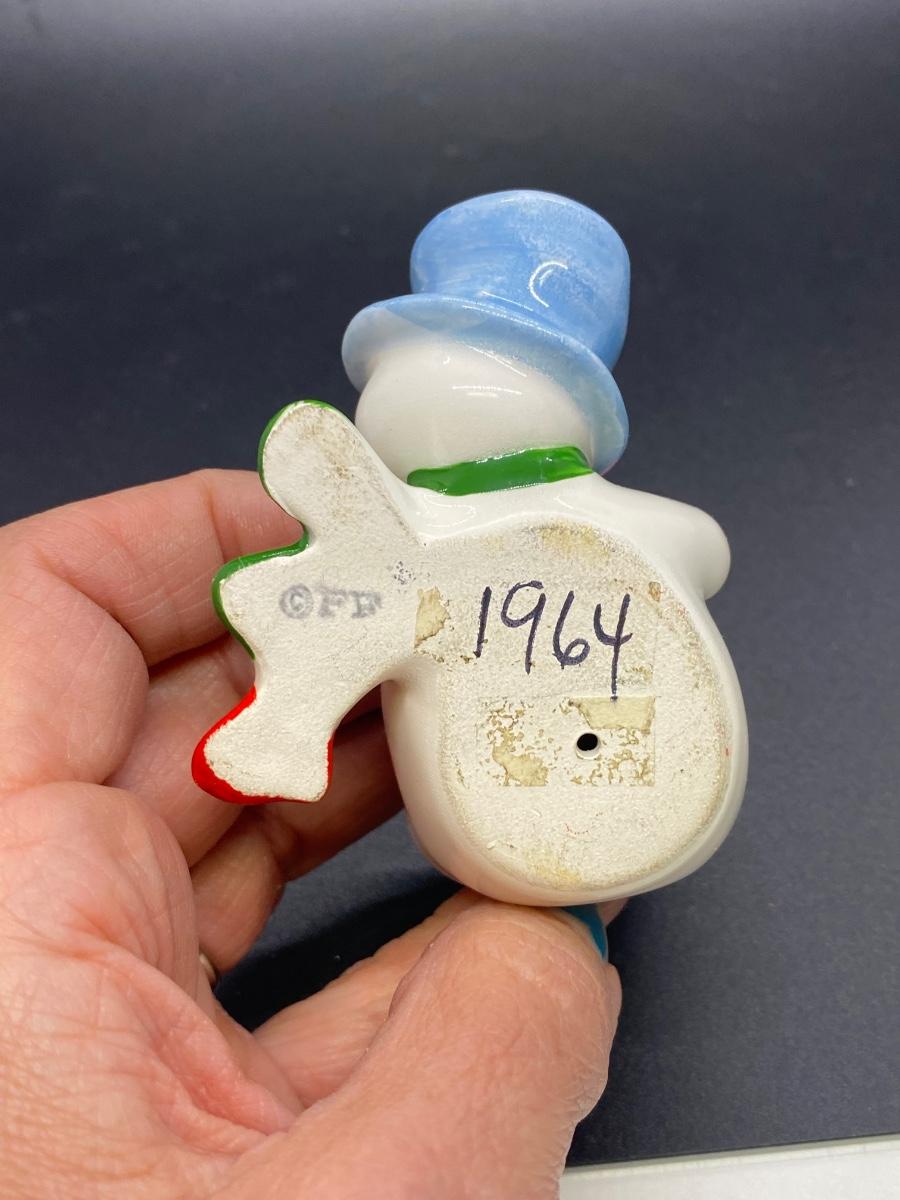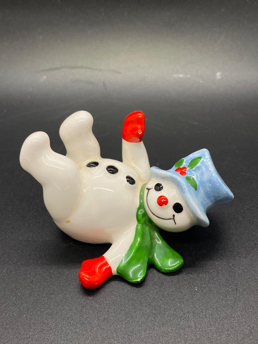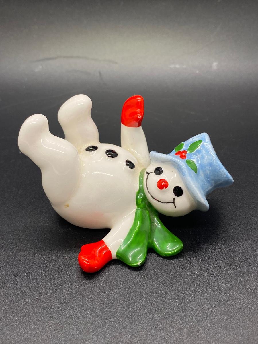 Vintage tumbling snowman figurine from Fitz & Floyd. Previous owner wrote 1964 on the bottom. In good condition. About 3" size.