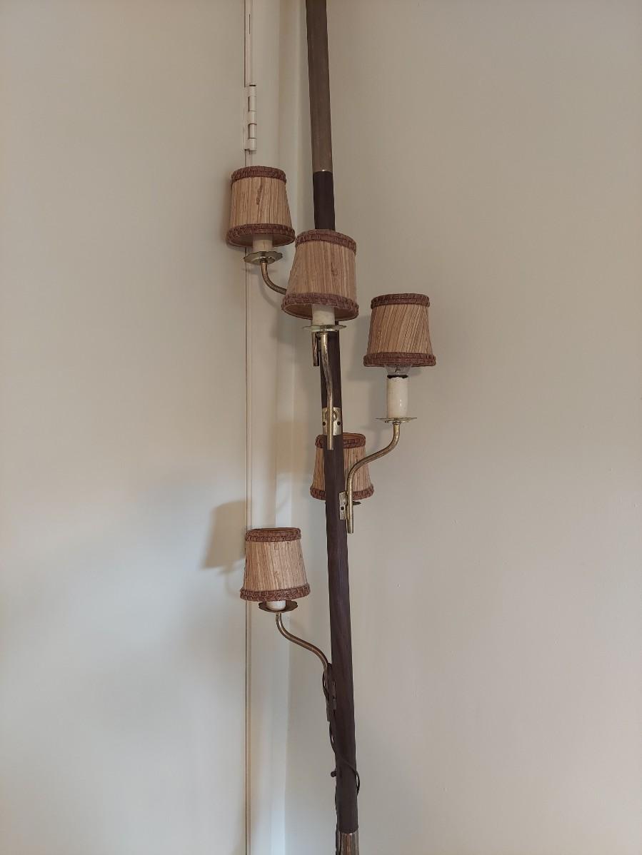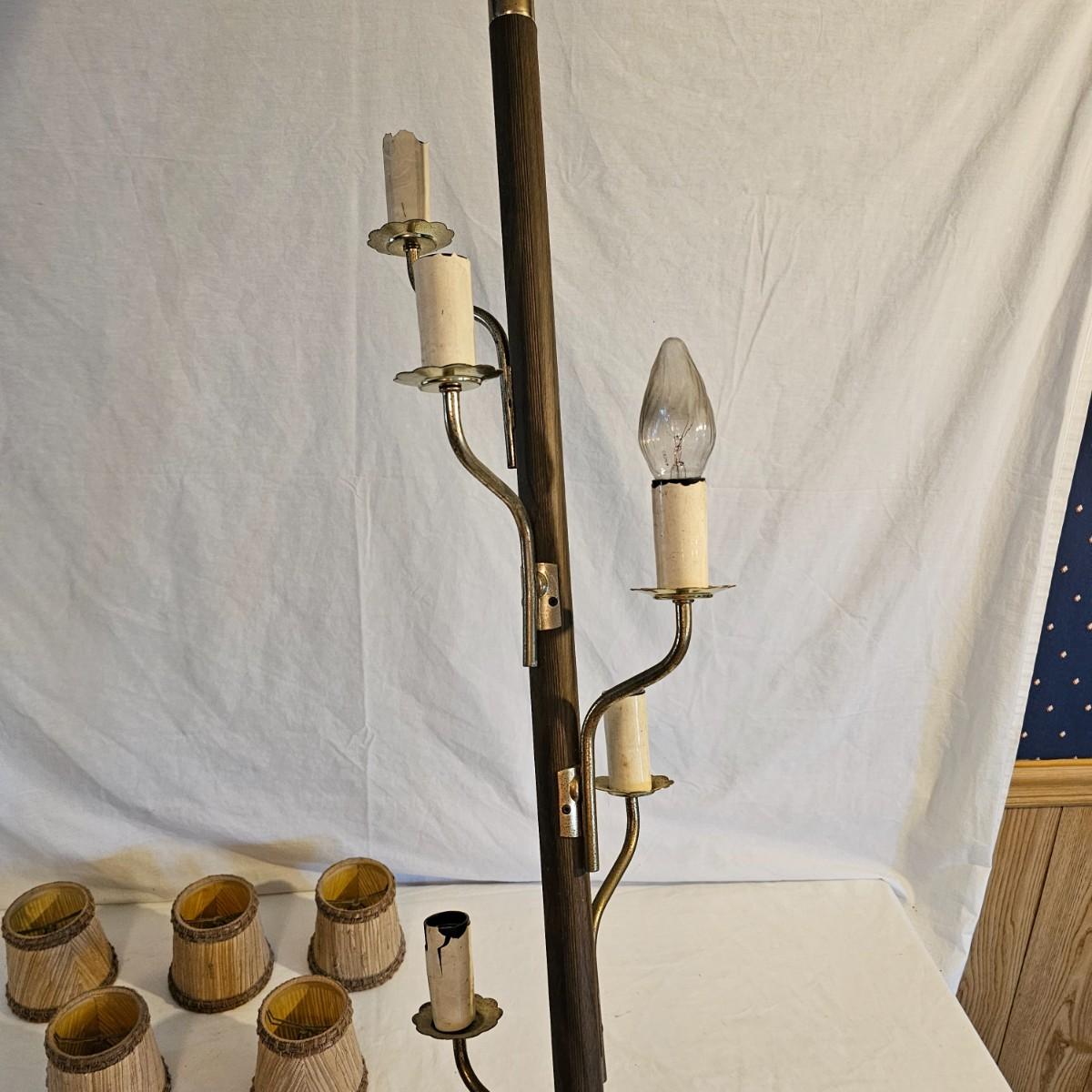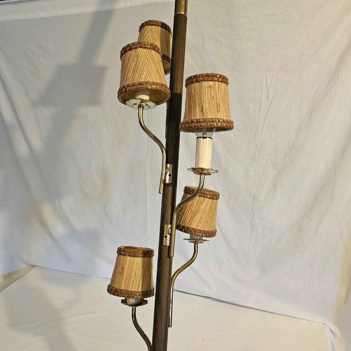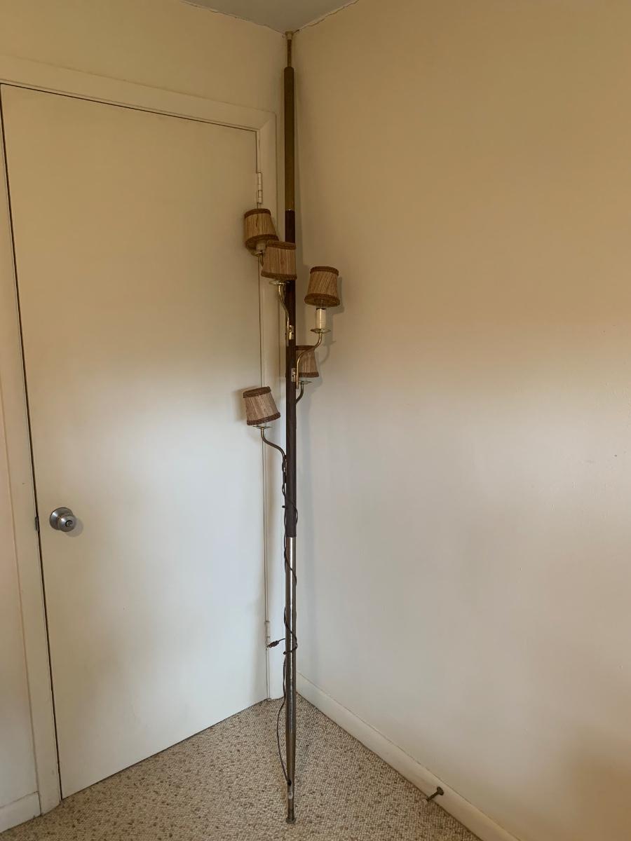 A very unique old style pole lamp with five bulb housings and shades. Unit is wood and metal, has compression spring at top to hold lamp secure on an eight foot ceiling. Has rotary switch and takes standard base bulbs. Lampshades are plastic and fiber, have clip style top of bulb holders. Lamp powered on when plugged in. Note that several of the protective sleeves on the lamp sockets are cracked and/or broken. See photos for details. Local pickup only.