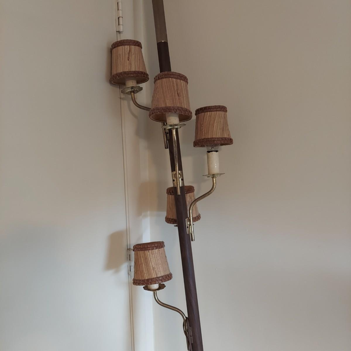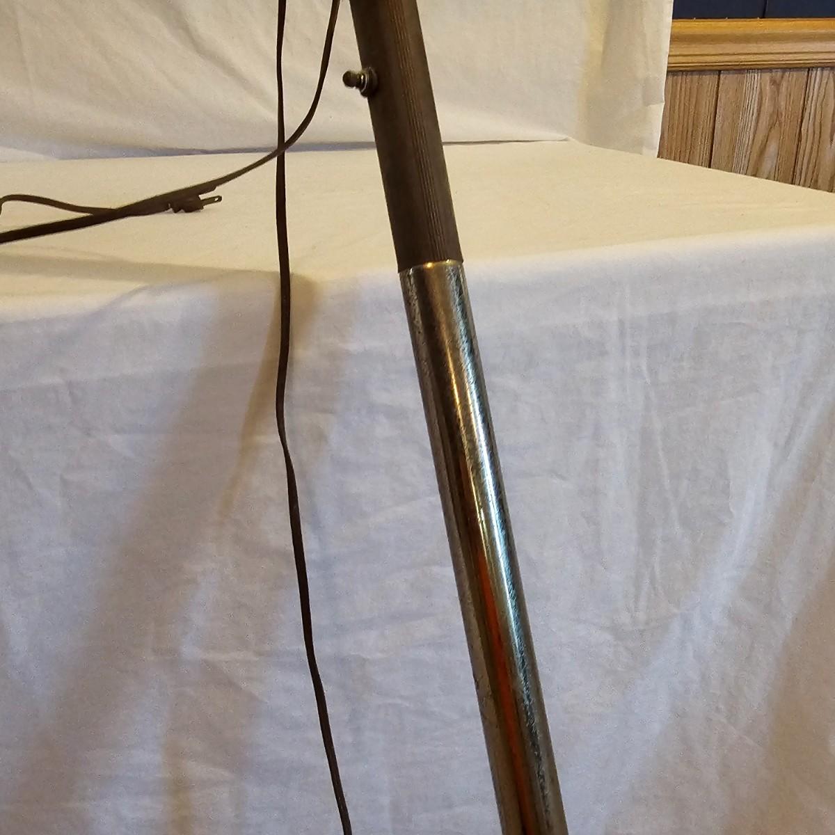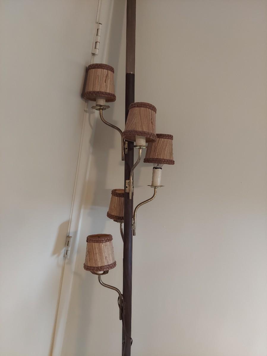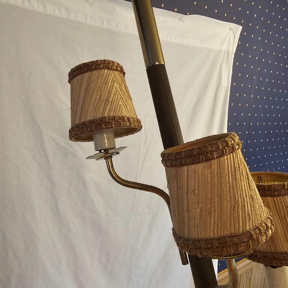 A very unique old style pole lamp with five bulb housings and shades. Unit is wood and metal, has compression spring at top to hold lamp secure on an eight foot ceiling. Has rotary switch and takes standard base bulbs. Lampshades are plastic and fiber, have clip style top of bulb holders. Lamp powered on when plugged in. Note that several of the protective sleeves on the lamp sockets are cracked and/or broken. See photos for details. Local pickup only.