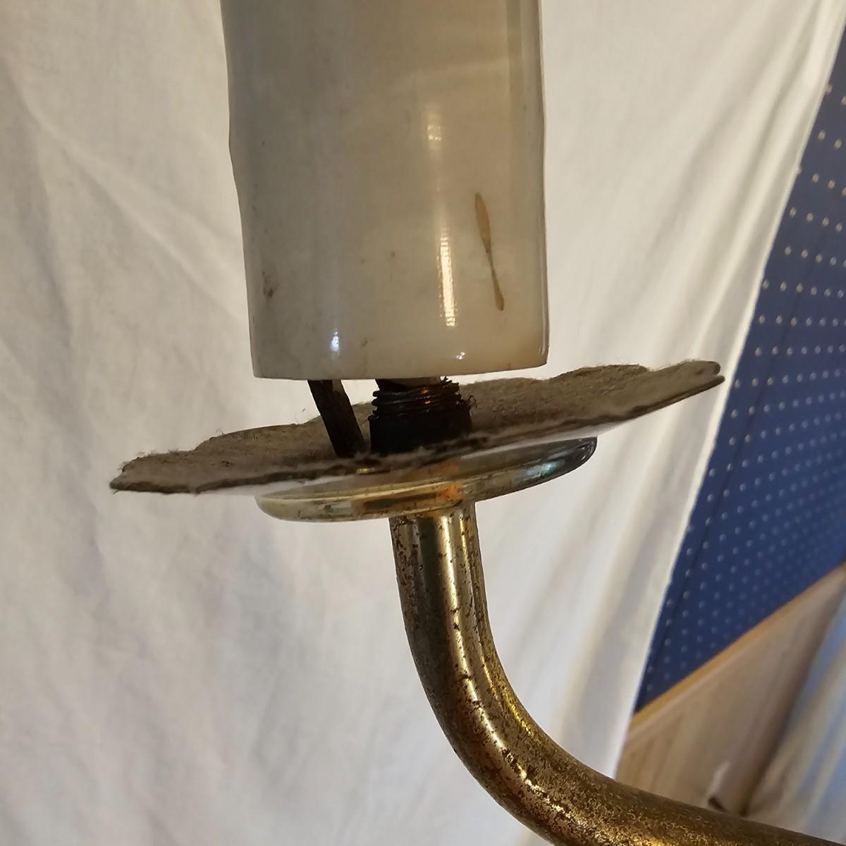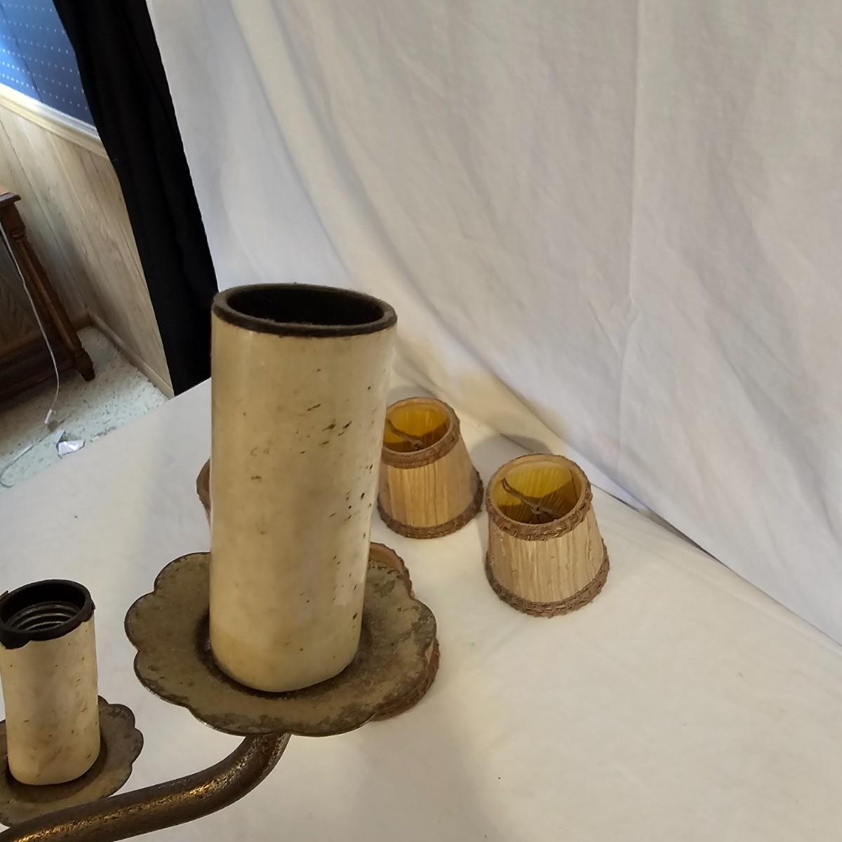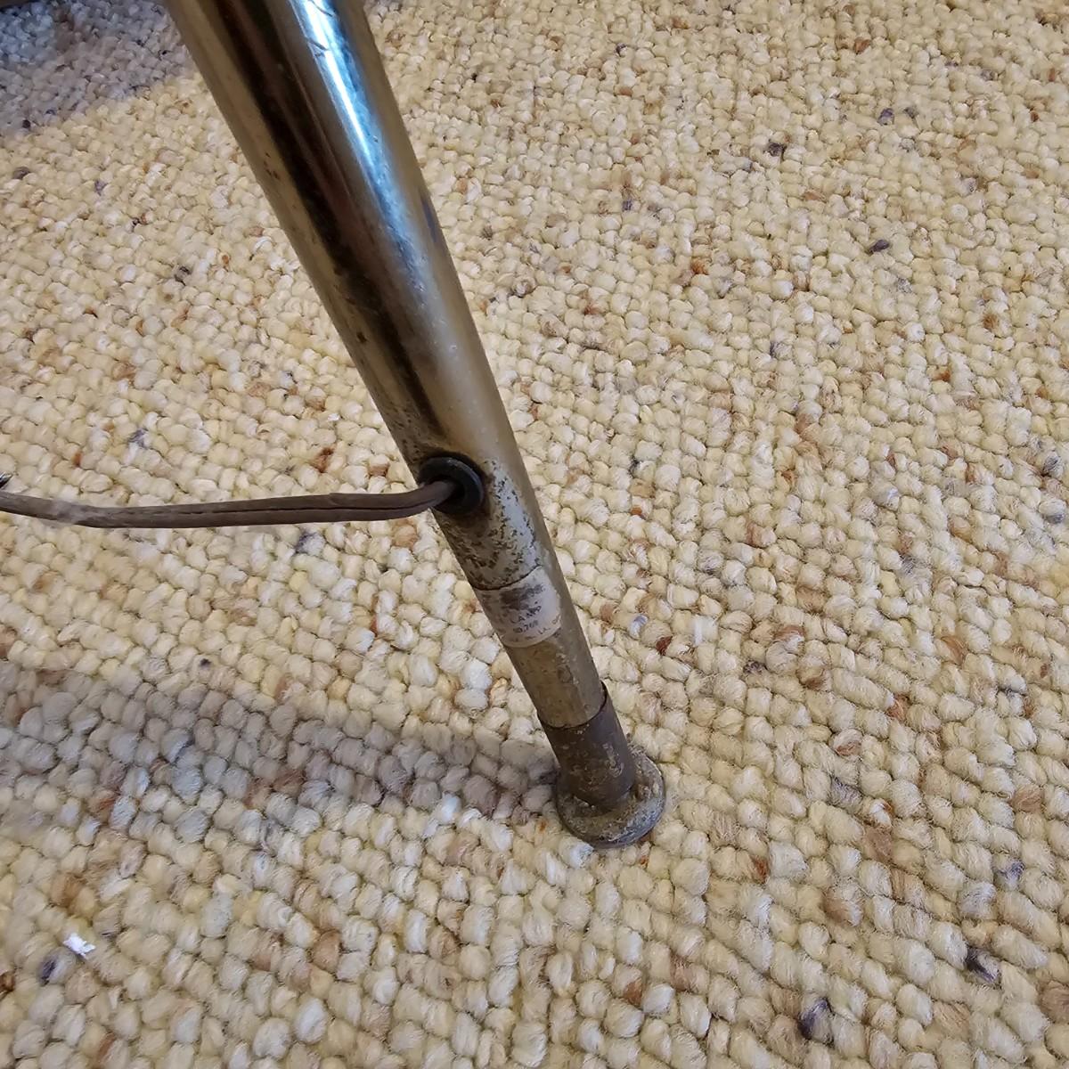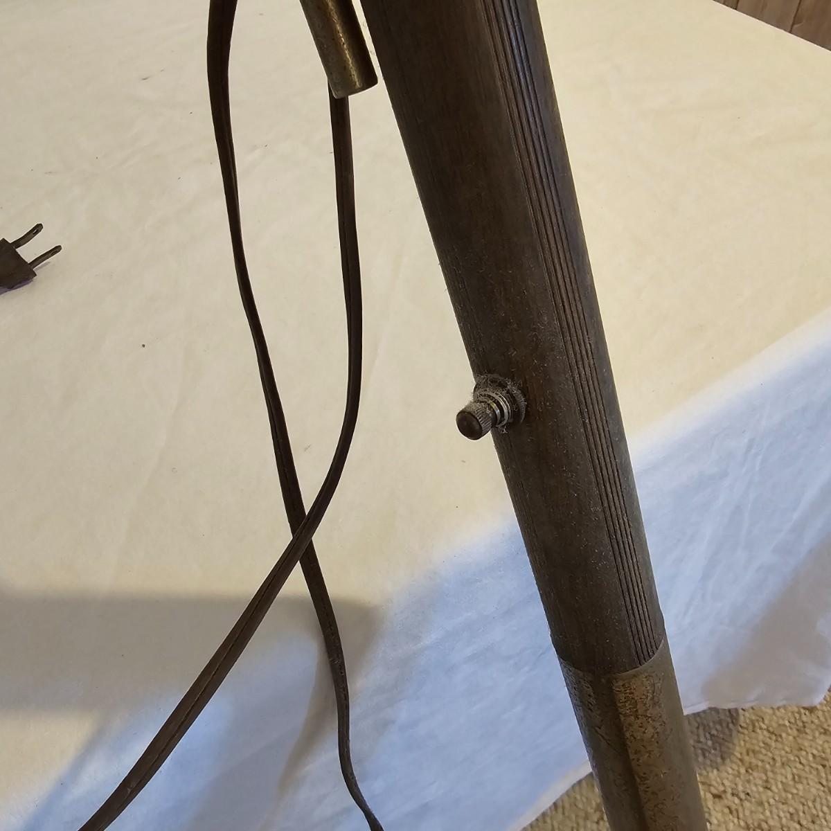 A very unique old style pole lamp with five bulb housings and shades. Unit is wood and metal, has compression spring at top to hold lamp secure on an eight foot ceiling. Has rotary switch and takes standard base bulbs. Lampshades are plastic and fiber, have clip style top of bulb holders. Lamp powered on when plugged in. Note that several of the protective sleeves on the lamp sockets are cracked and/or broken. See photos for details. Local pickup only.