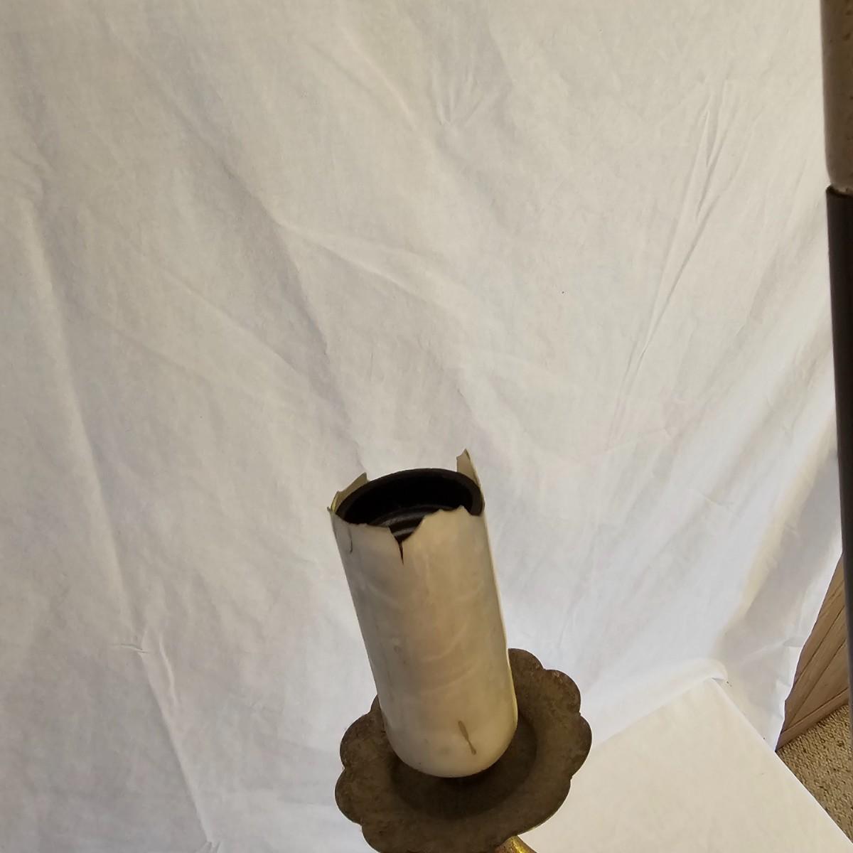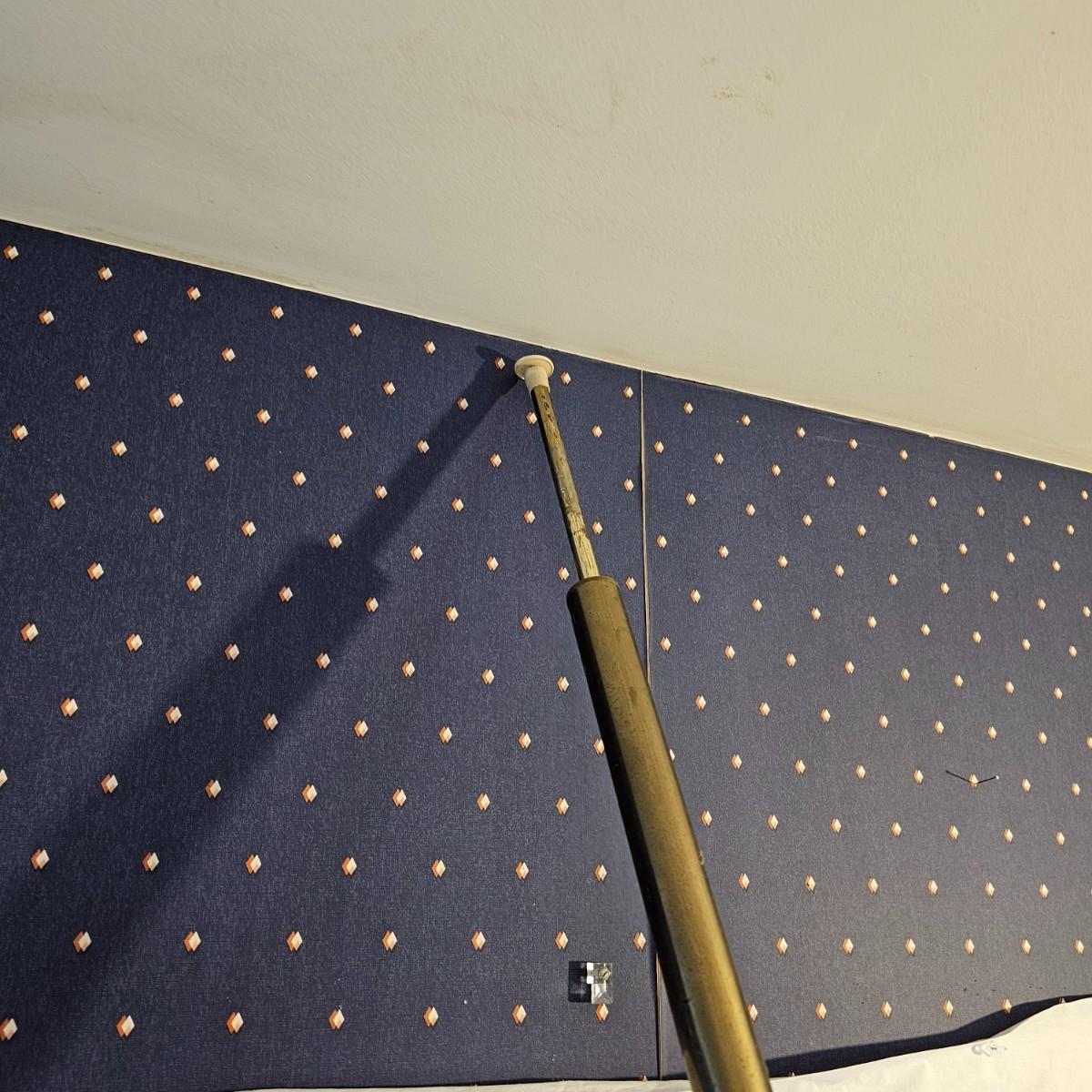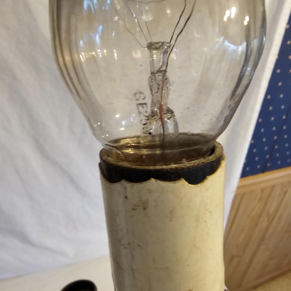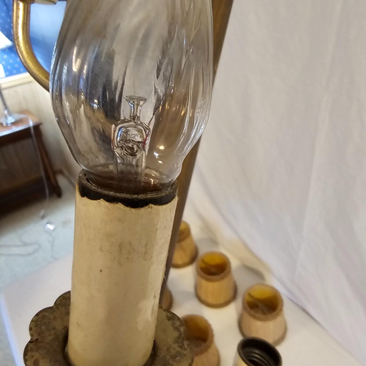 A very unique old style pole lamp with five bulb housings and shades. Unit is wood and metal, has compression spring at top to hold lamp secure on an eight foot ceiling. Has rotary switch and takes standard base bulbs. Lampshades are plastic and fiber, have clip style top of bulb holders. Lamp powered on when plugged in. Note that several of the protective sleeves on the lamp sockets are cracked and/or broken. See photos for details. Local pickup only.