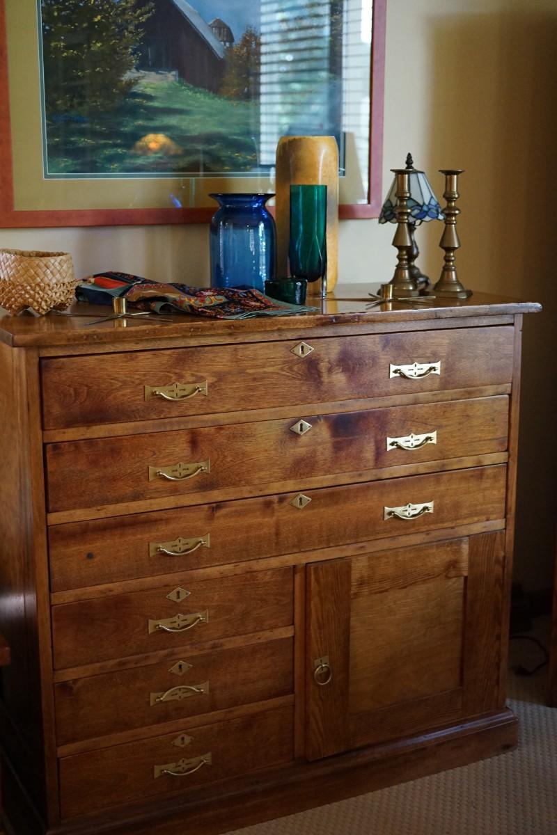 The brass hardware is not original and is more of recent addition, but it adds alot of charm and interest to the piece.